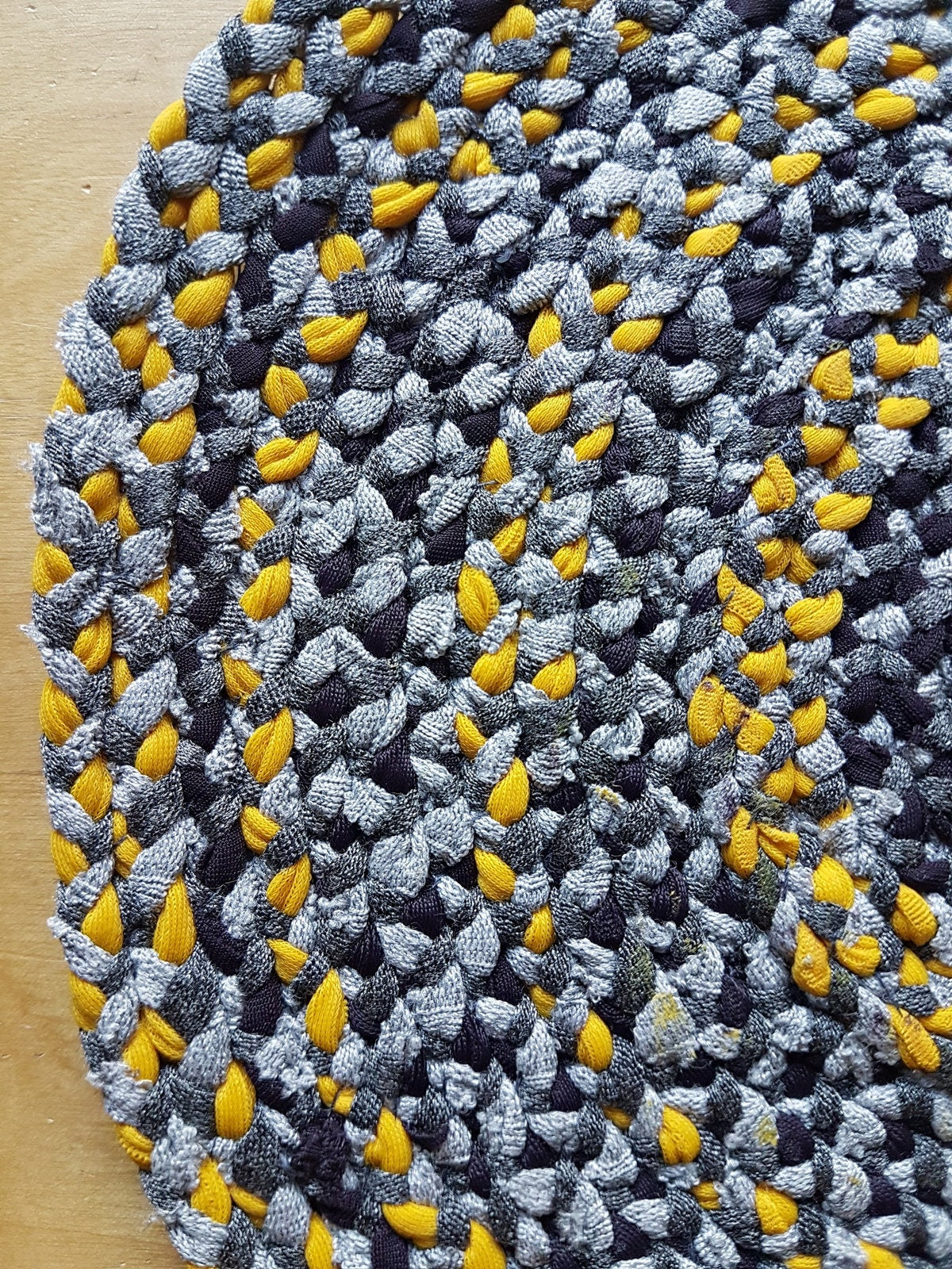 Up for sale here is a single hand-braided coaster place mat made with yellow, grey and purple fabric recycled from my design studio, braided and stitched together into a round coaster.
