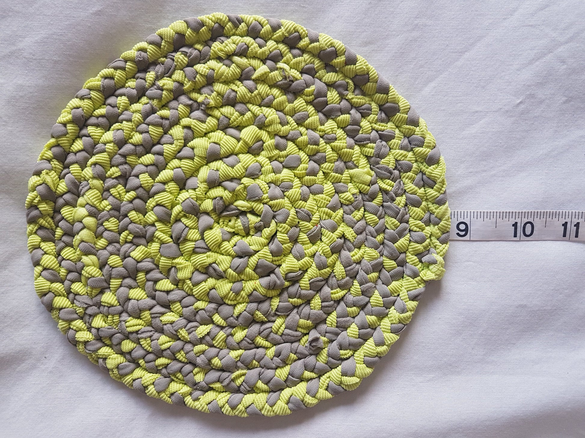 Up for sale here is a single hand-braided coaster place mat made with lime green and brown fabric recycled from my design studio, braided and stitched together into a round coaster.