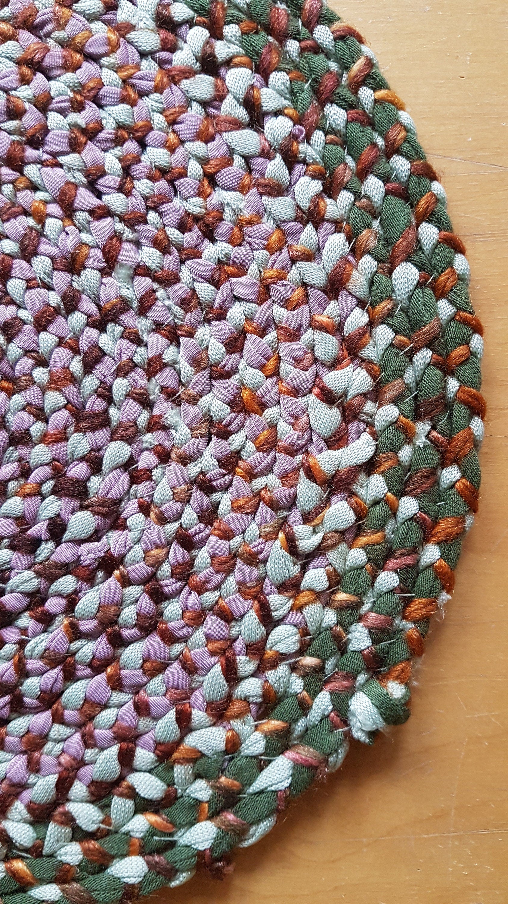 Up for sale here is a single hand-braided coaster place mat made with pink and green fabric and brown silk yarn recycled from my design studio, braided and stitched together into a round coaster.