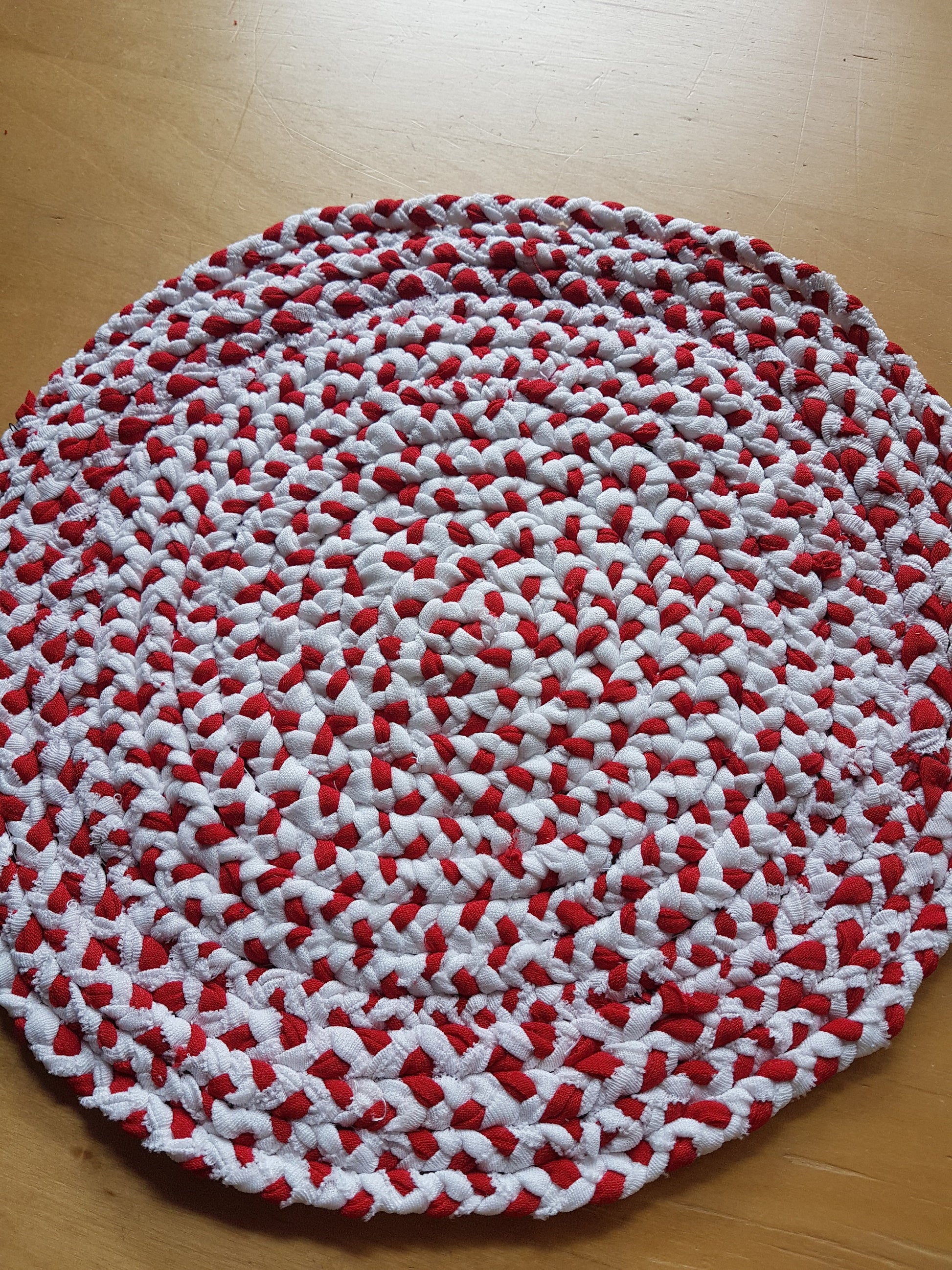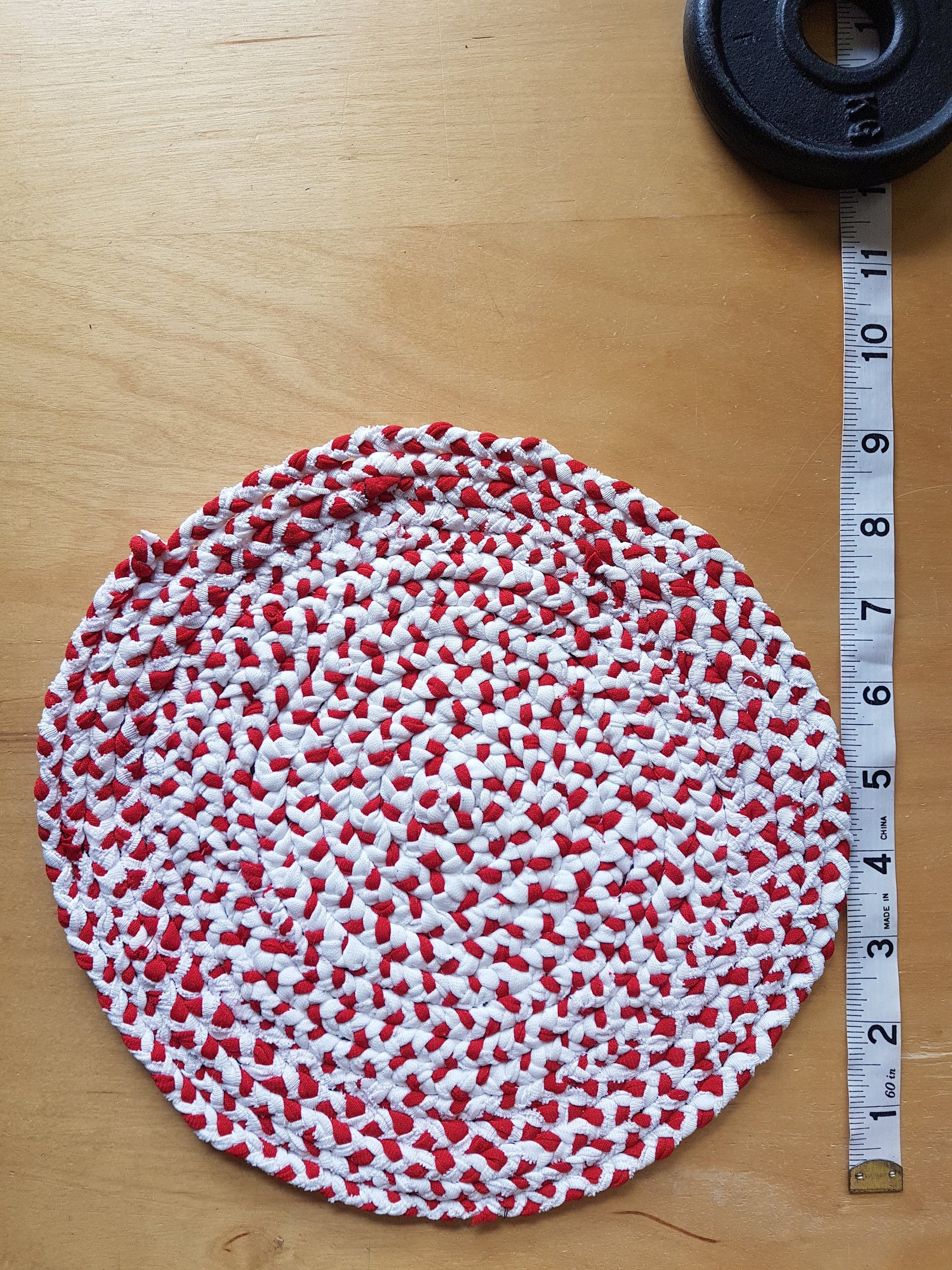 Up for sale here is a single hand-braided coaster place mat made with red and white fabric recycled from my design studio, braided and stitched together into a round coaster.