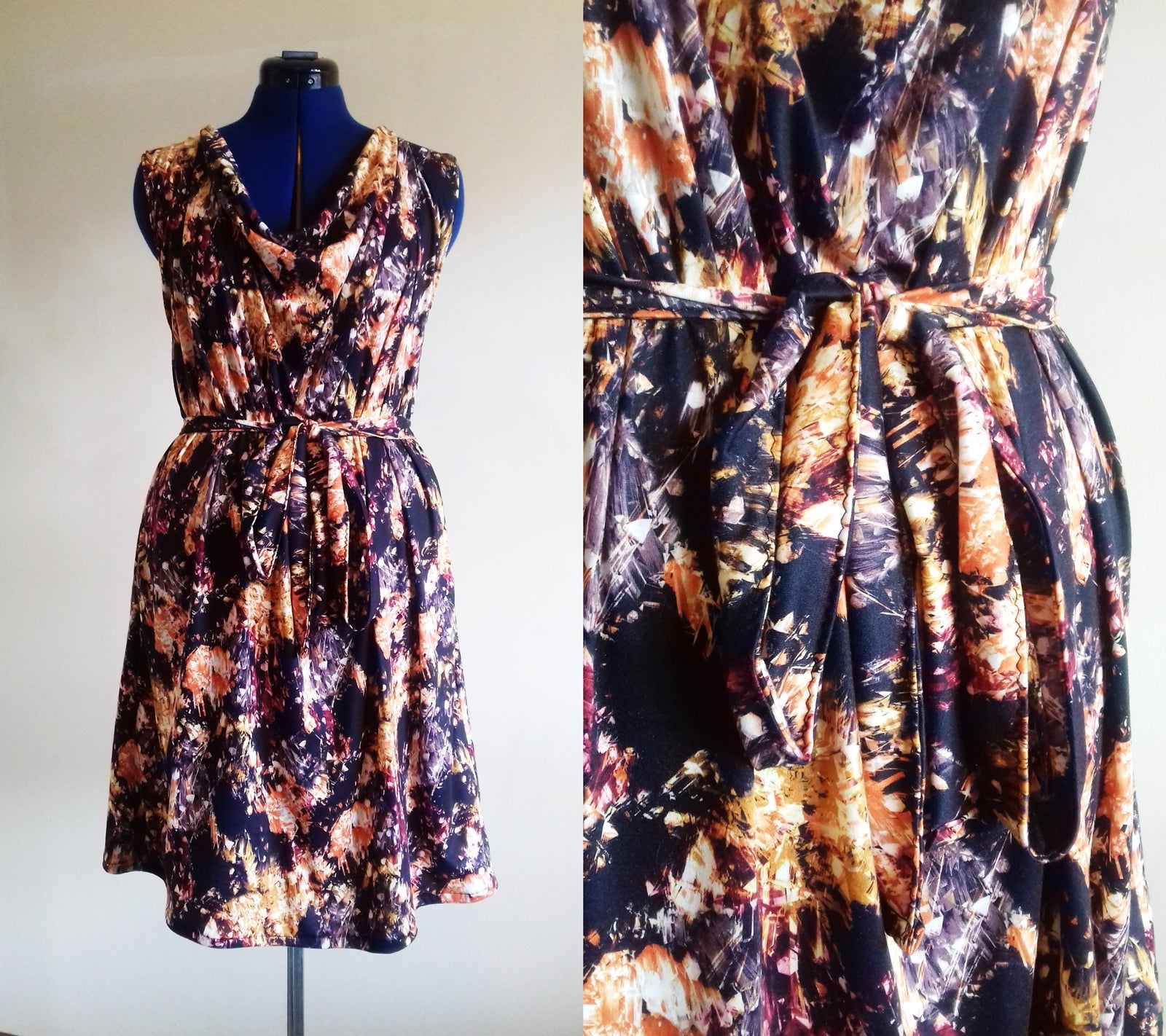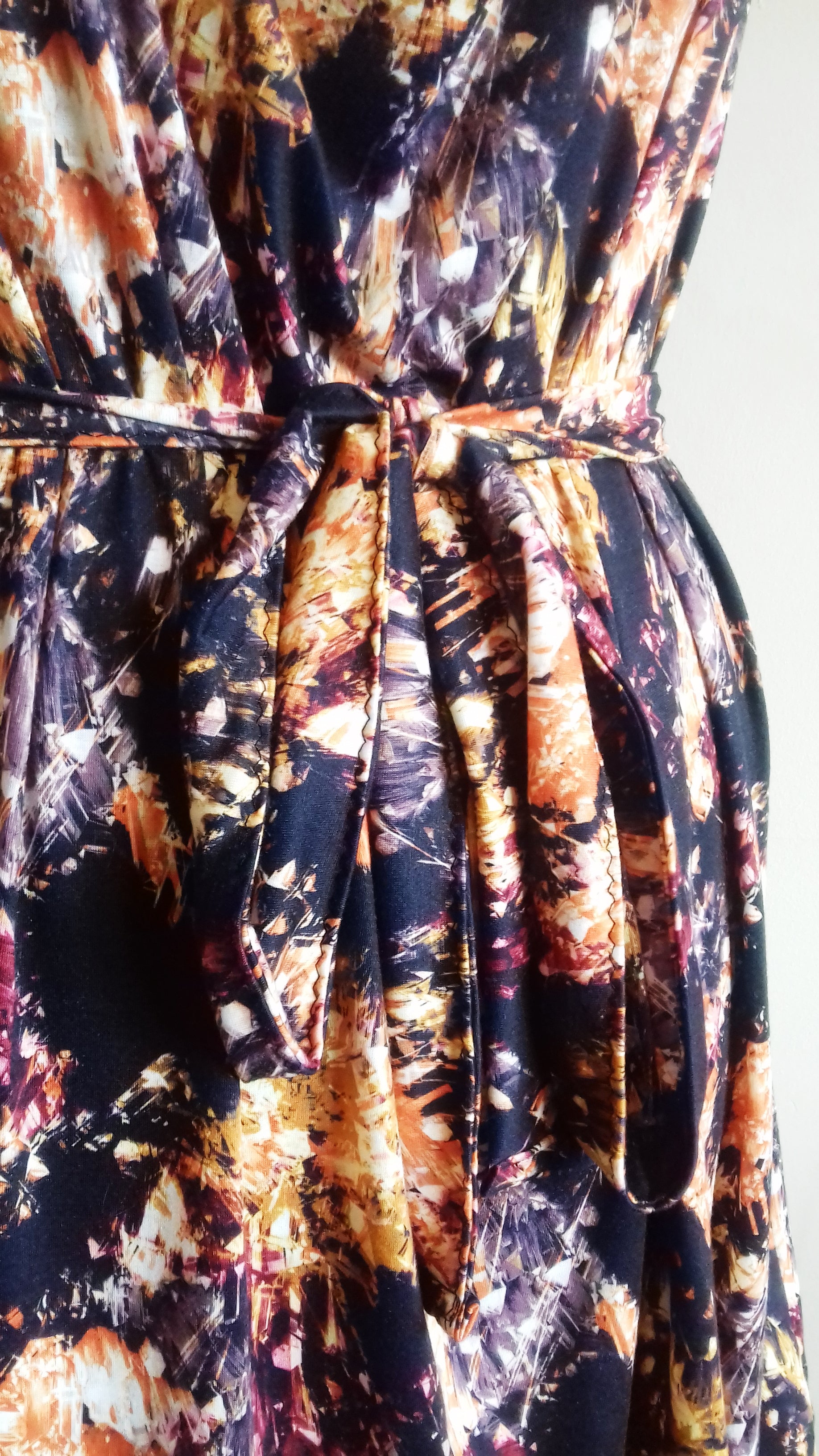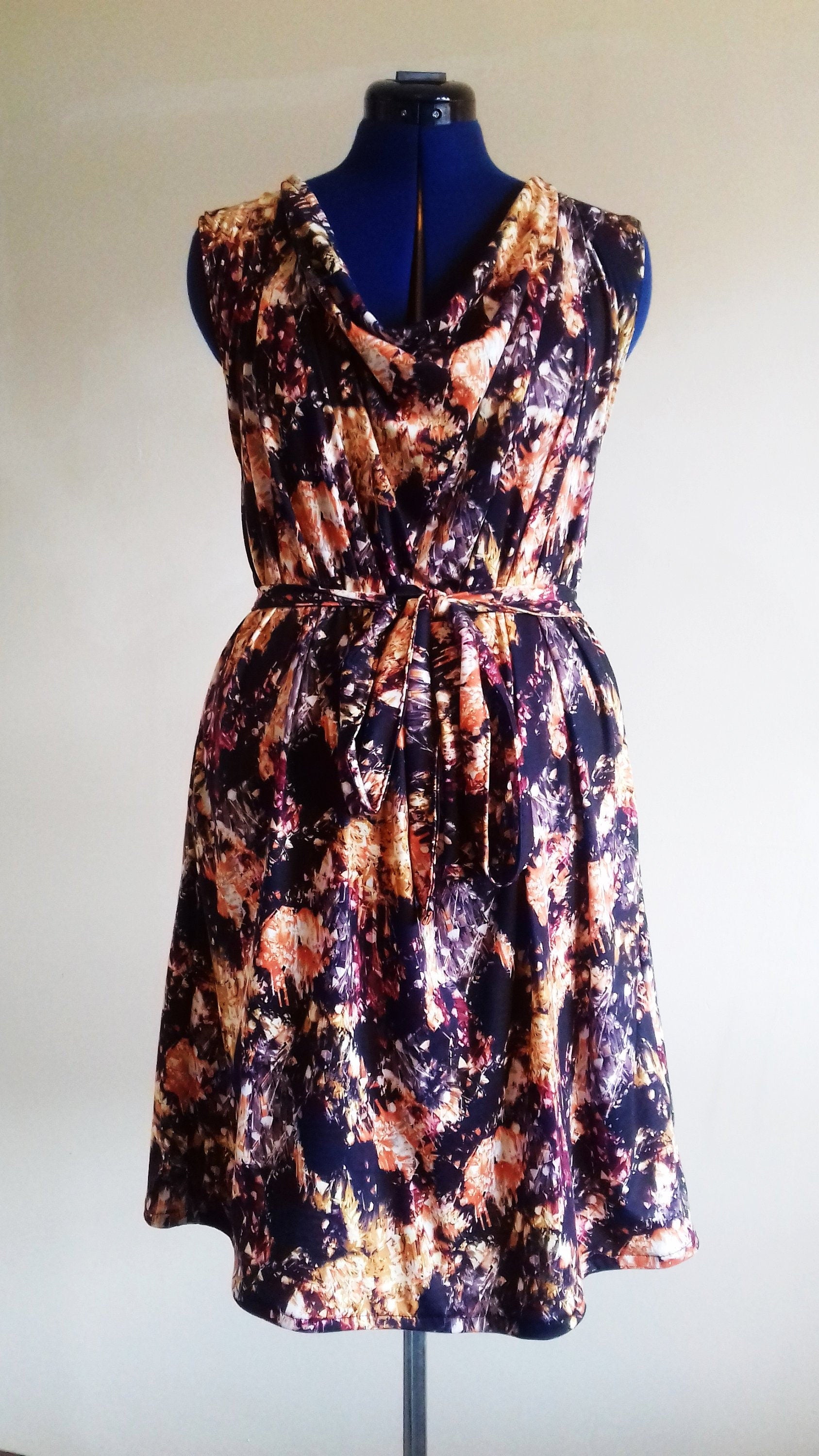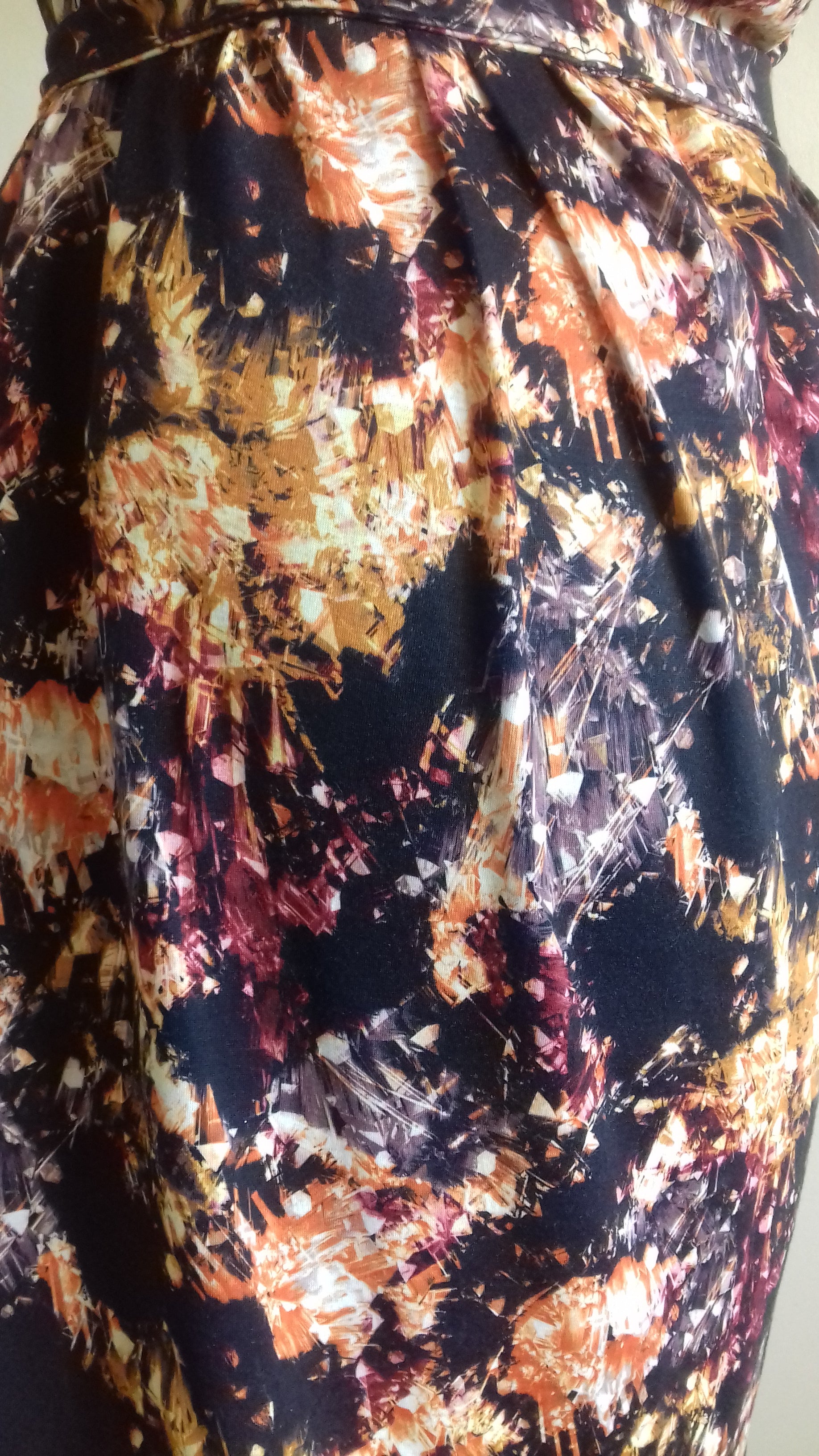 This is a gorgeous one of a kind dress in an abstract crystals pattern design fabric in black, orange, yellow, red and brown. It is made from soft midweight jersey and it has a simple design, flattering on any bodyshape.