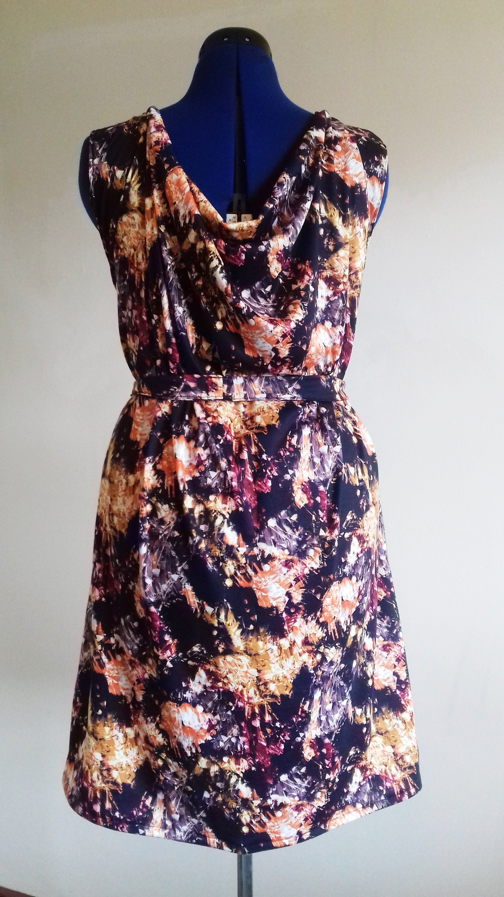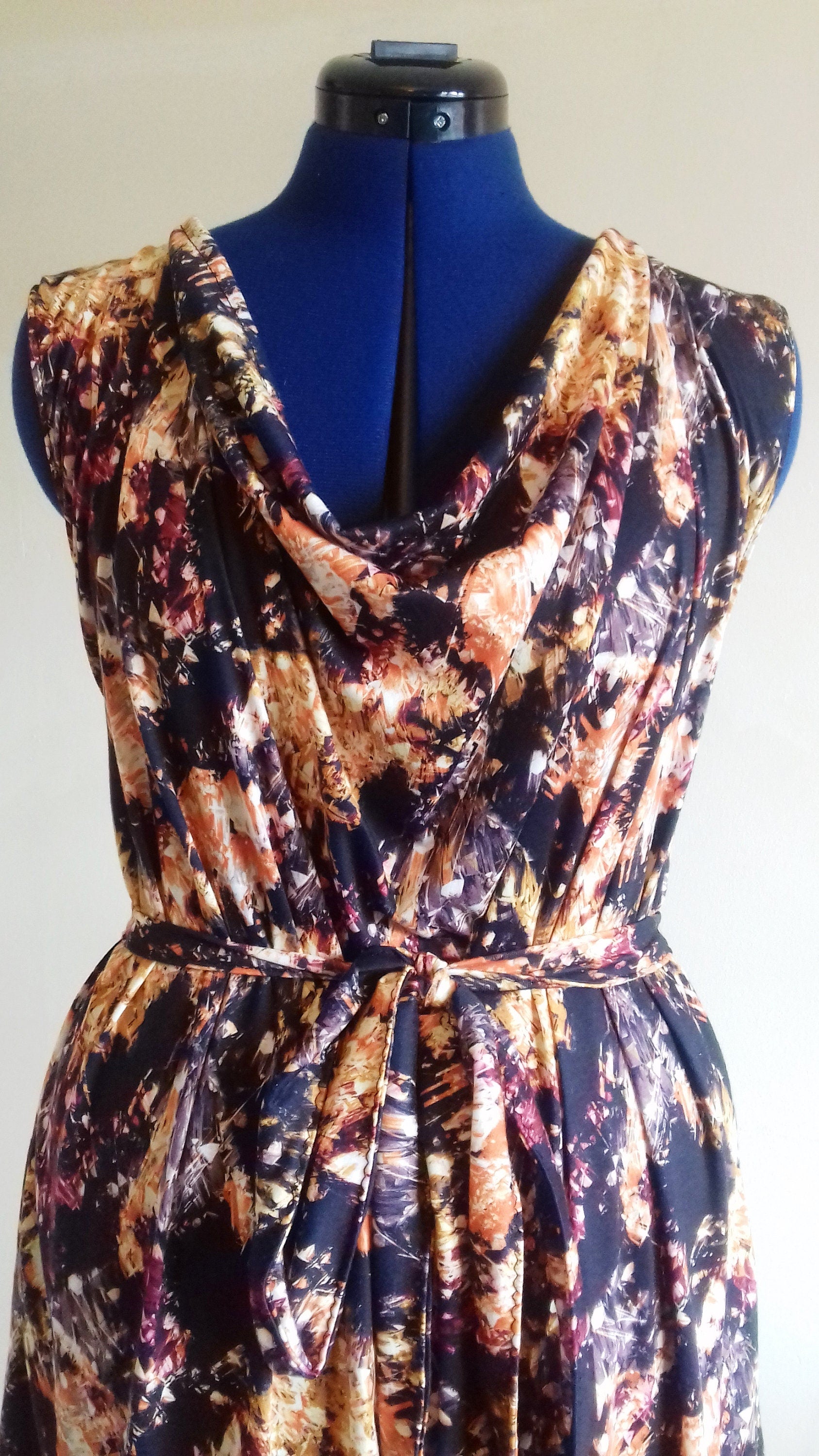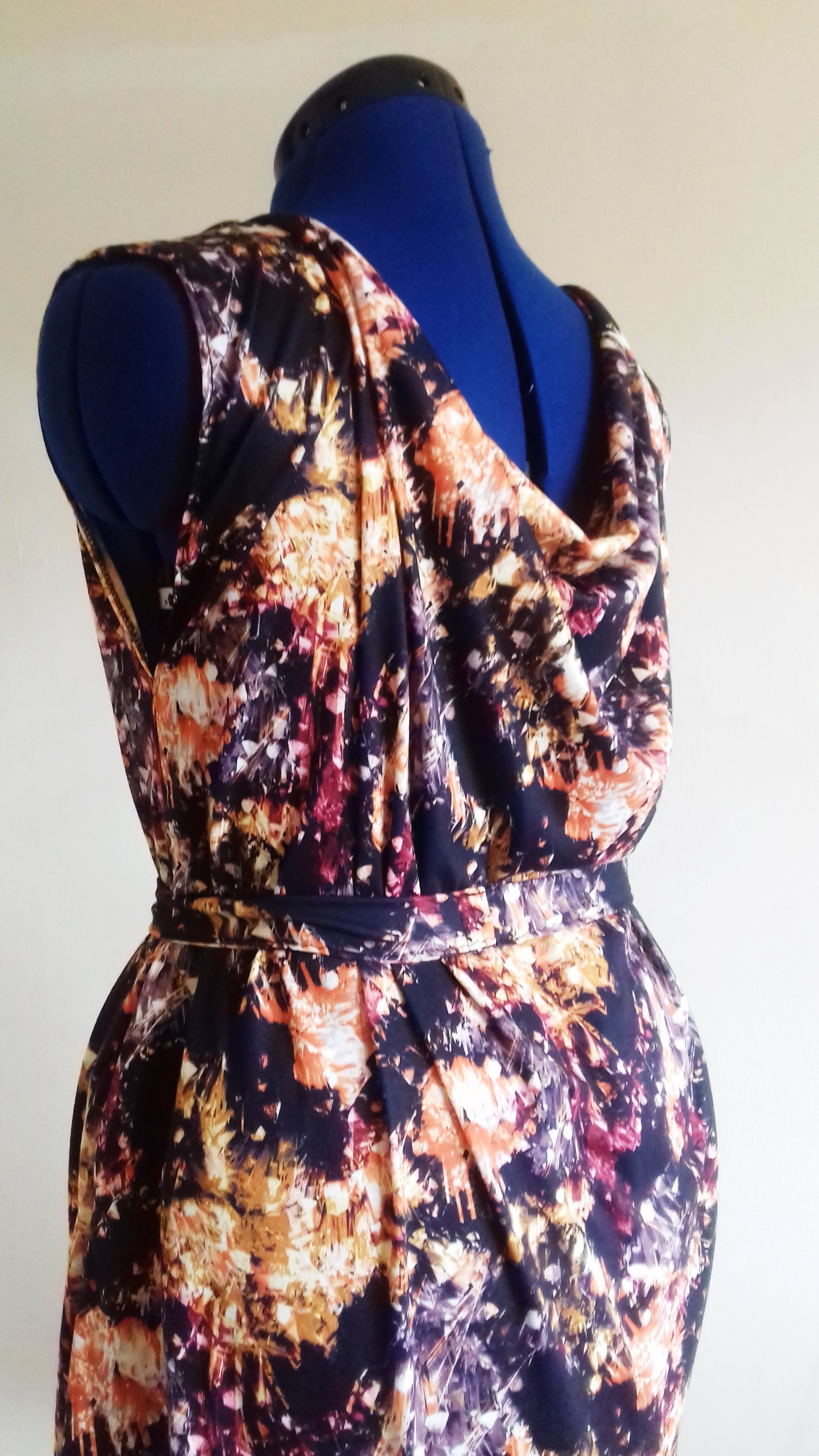 It comes with a long matching belt which fits at your natural waistline. This dress also features a cowl neckline front and back making this a beautiful easy wear unique evening or day dress.