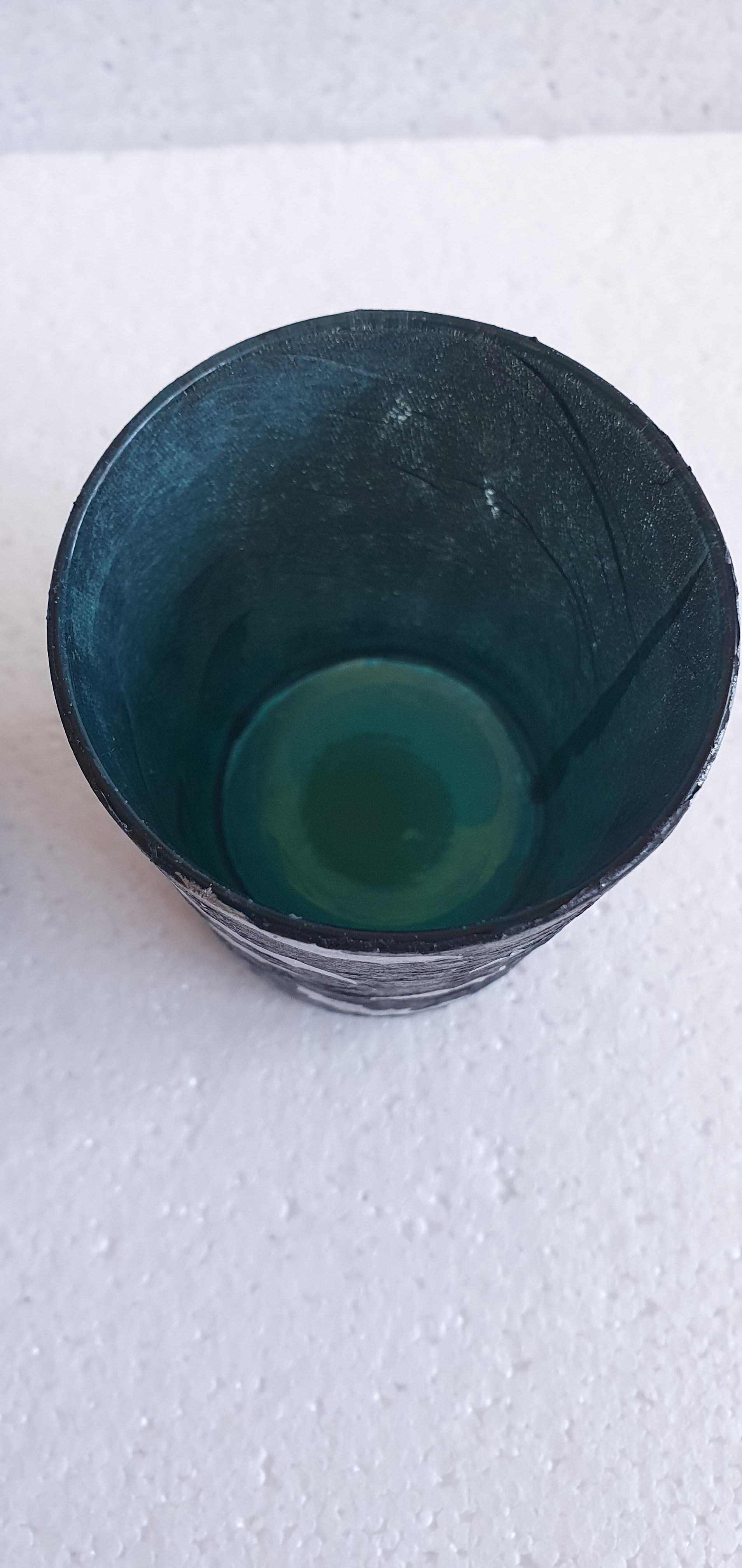 This pair of glass candle / tea light jars have been hand decorated by me in my studio using decoupage on reclaimed glass. The glass beneath is blue. Each one is a unique design and size and cannot be repeated.