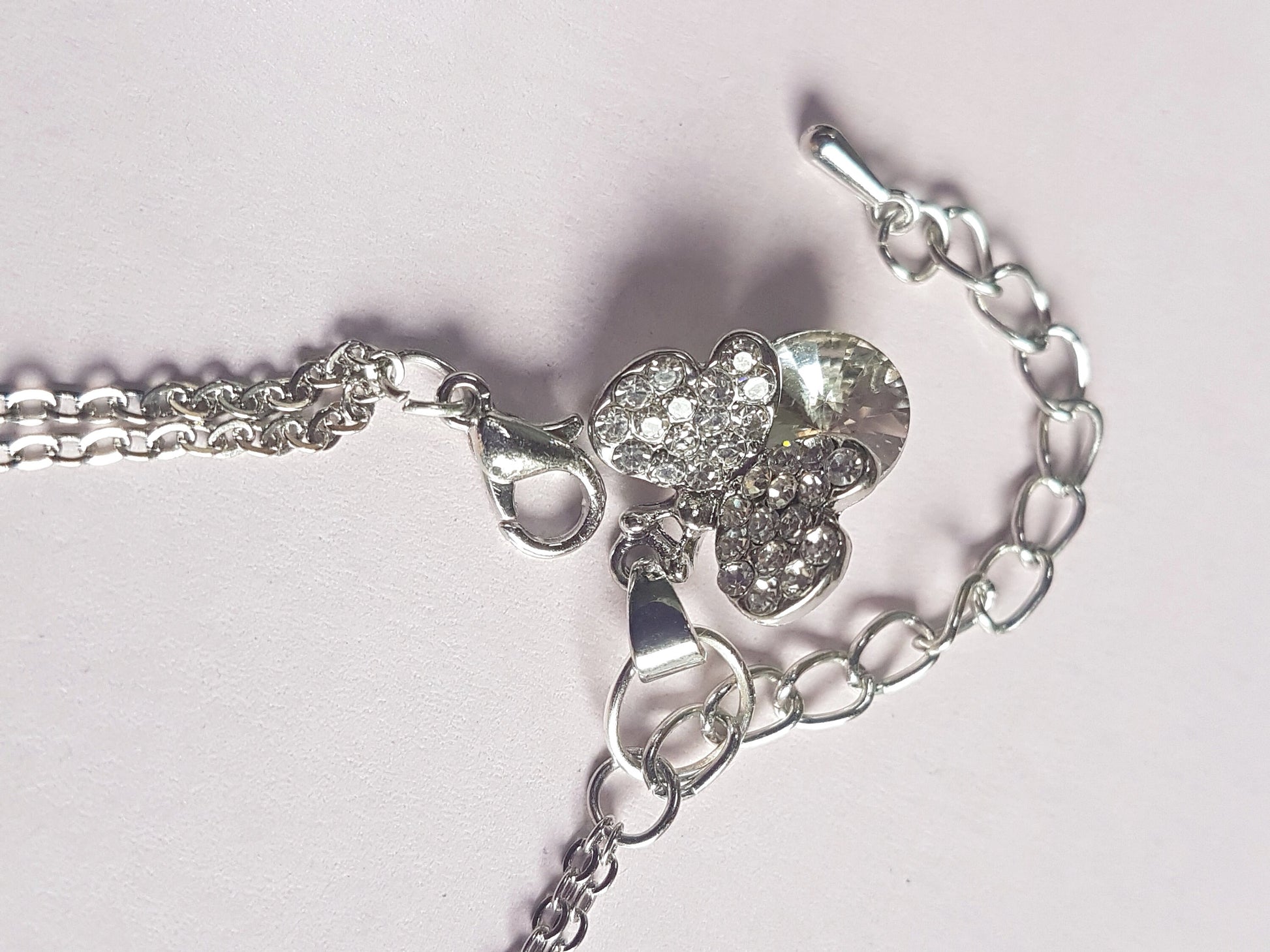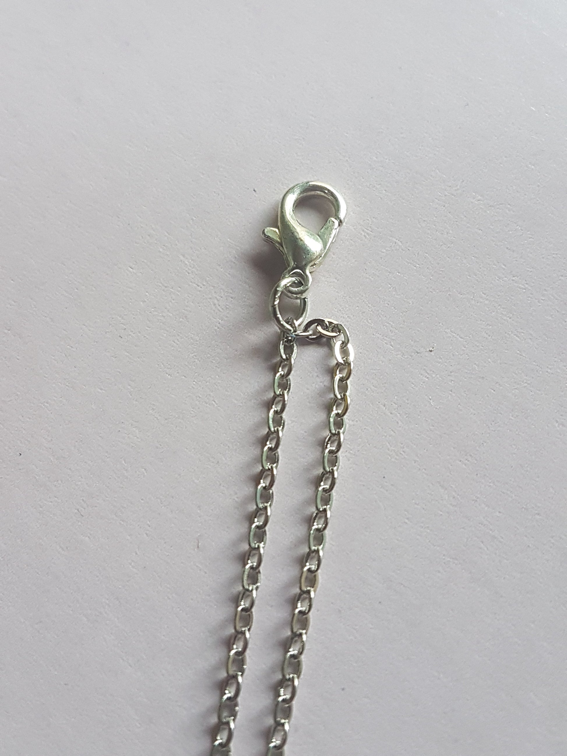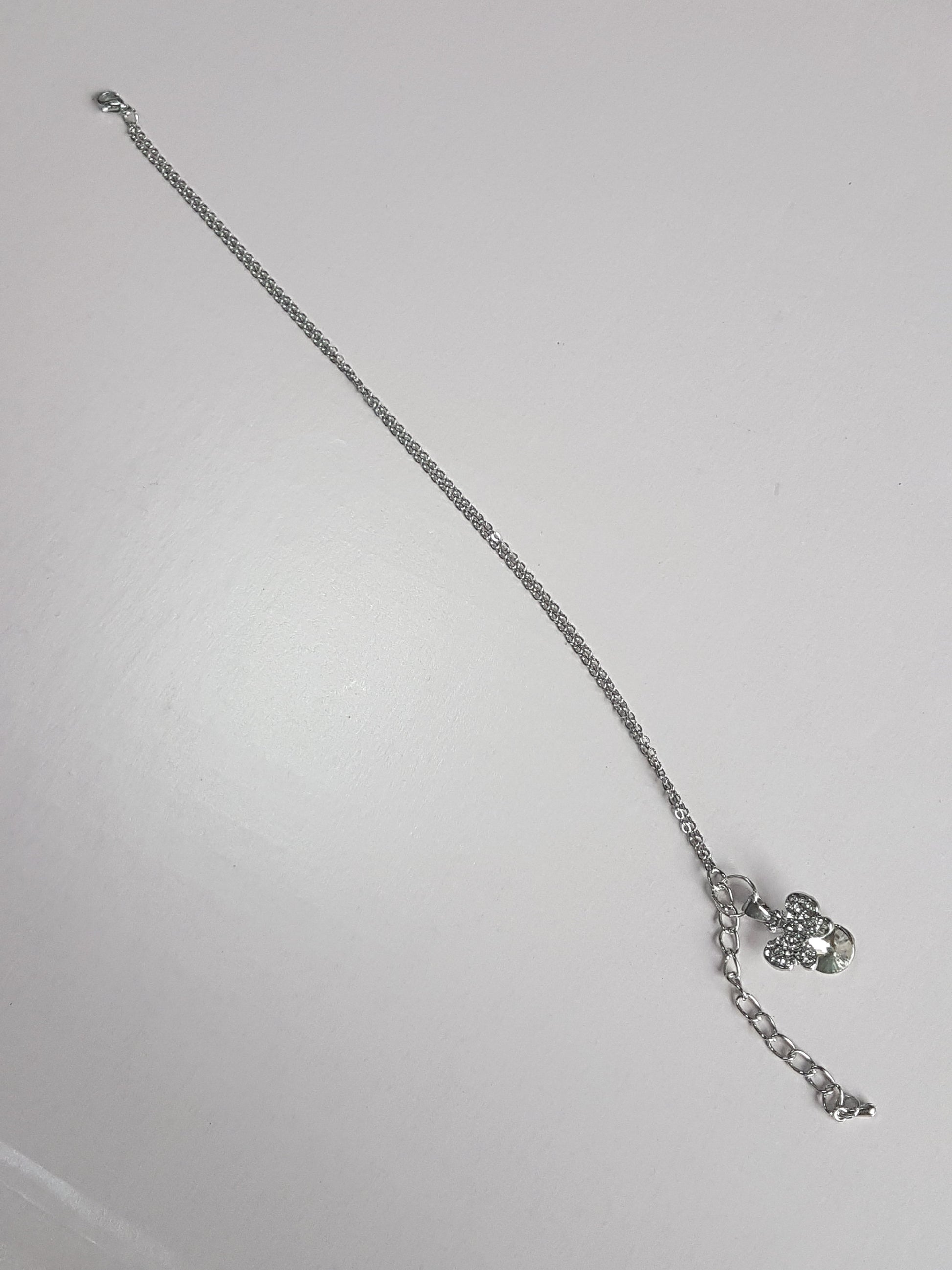 This one is 8 inches long including the hook and eye clasp but has an extender of 2 inches. It is made from 2 strands of silver chain and has a silver and diamante butterfly charm on it.