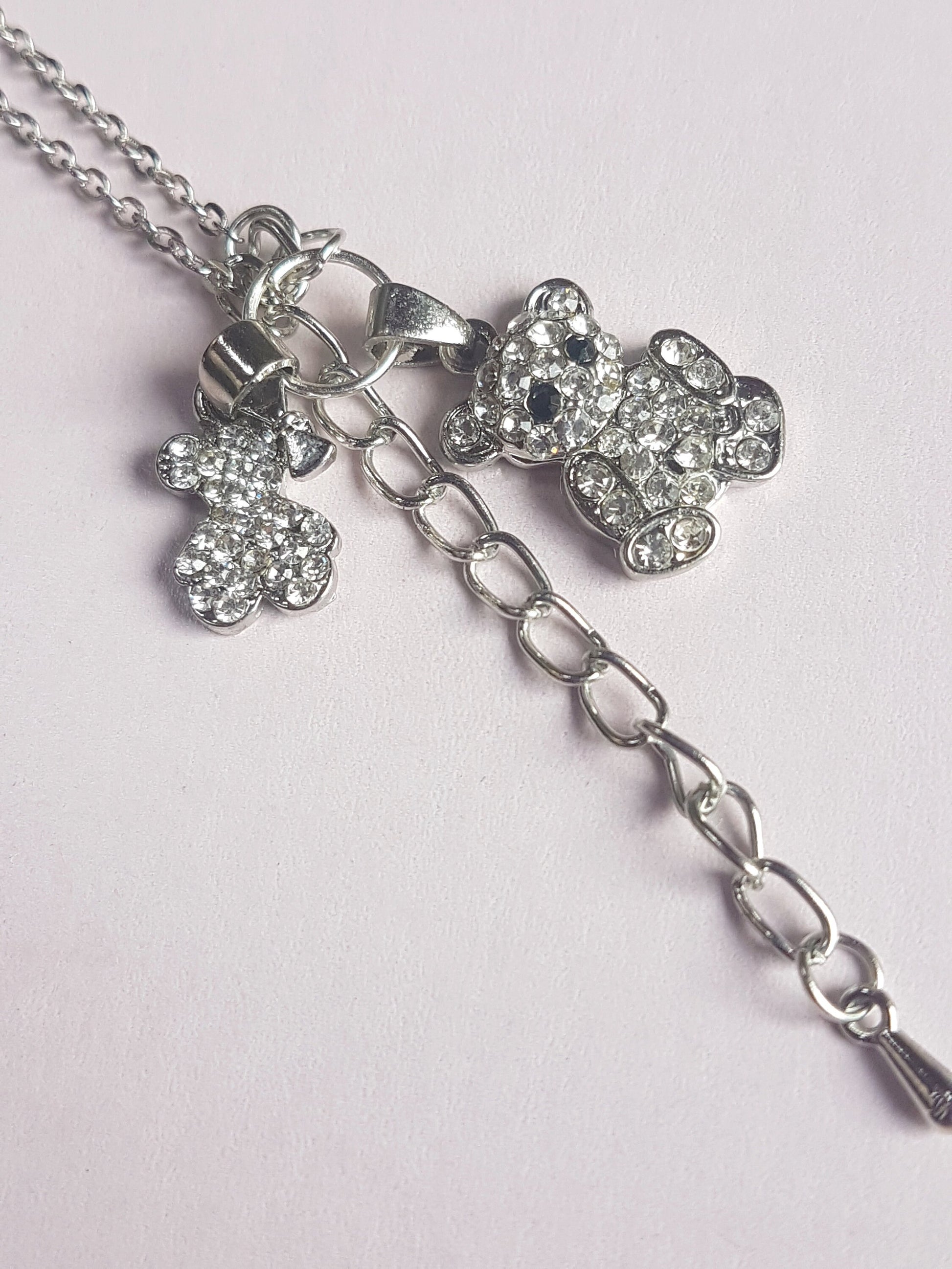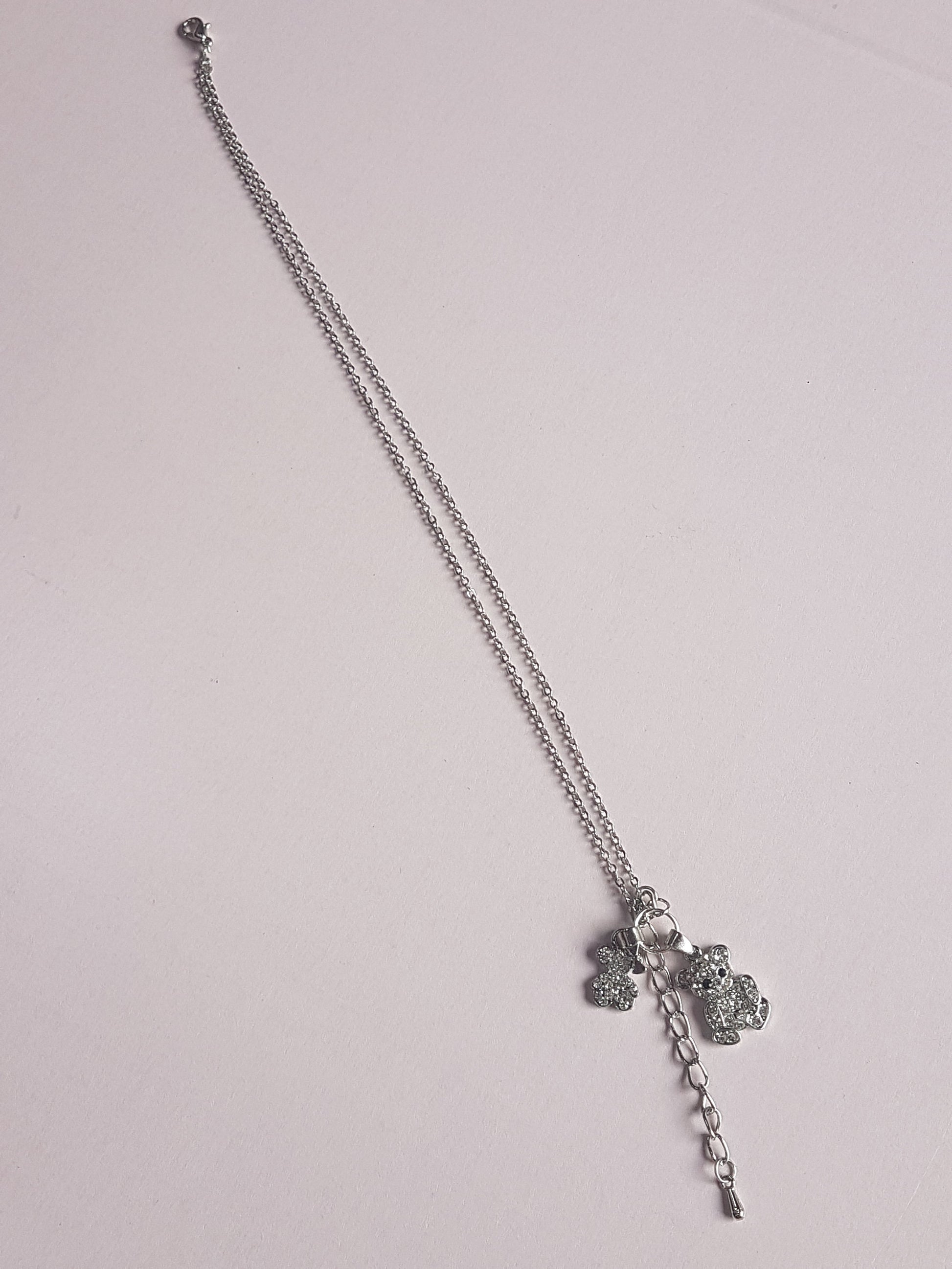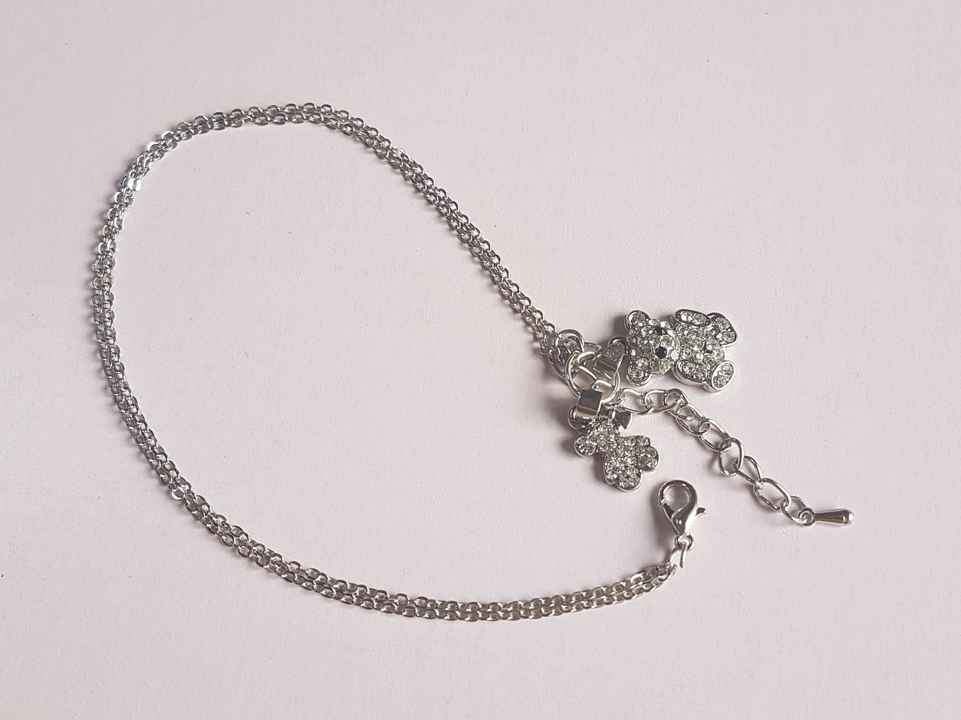 This one is 8 inches long including the hook and eye clasp but has an extender of 2 inches. It is made from 2 strands of silver chain and has two silver and diamante teddy bear charms on it.