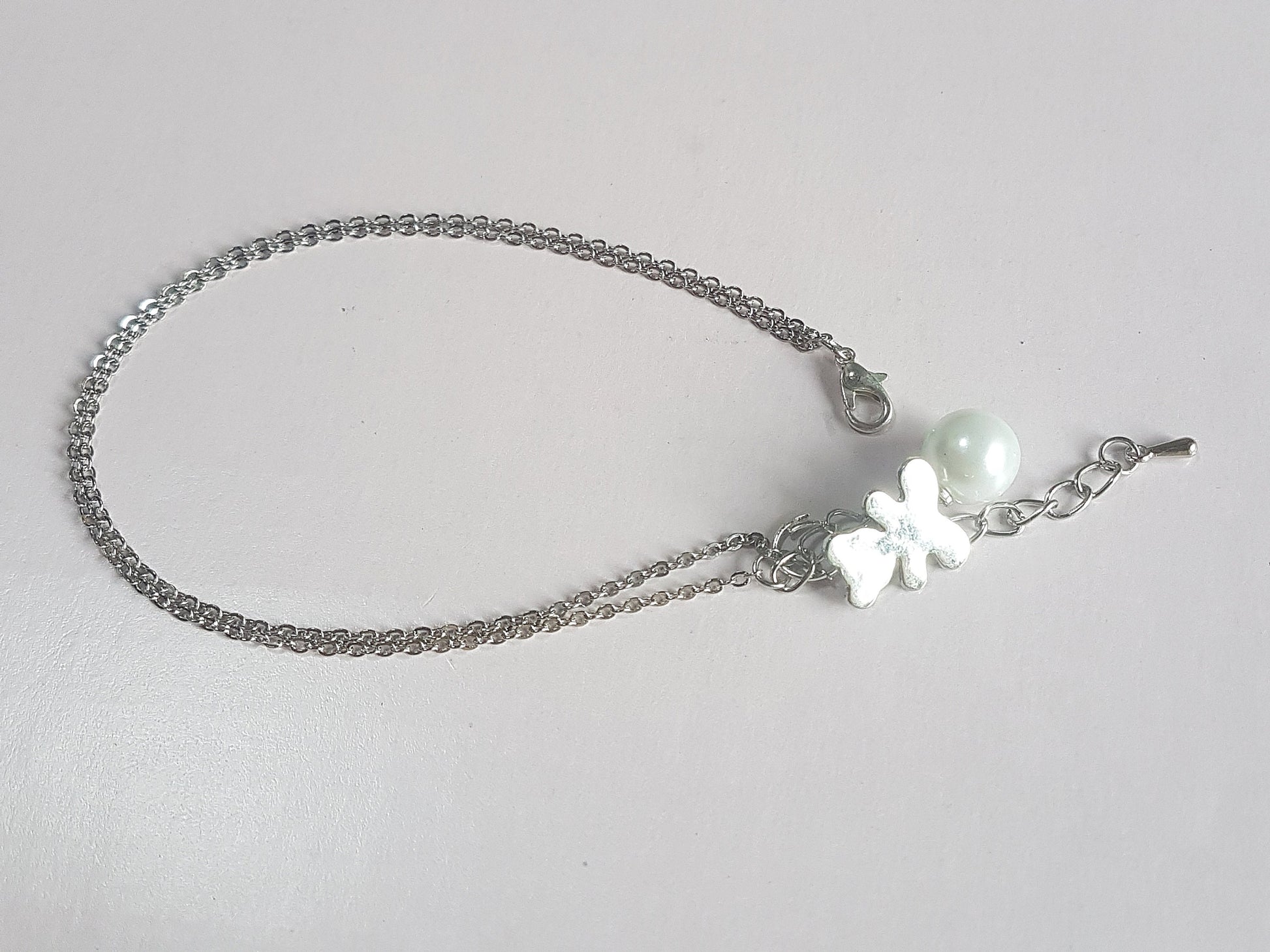 This one is 8 inches long including the hook and eye clasp but has an extender of 2 inches. It is made from 2 strands of silver chain and has a silver teddy bear and pearl charm on it.