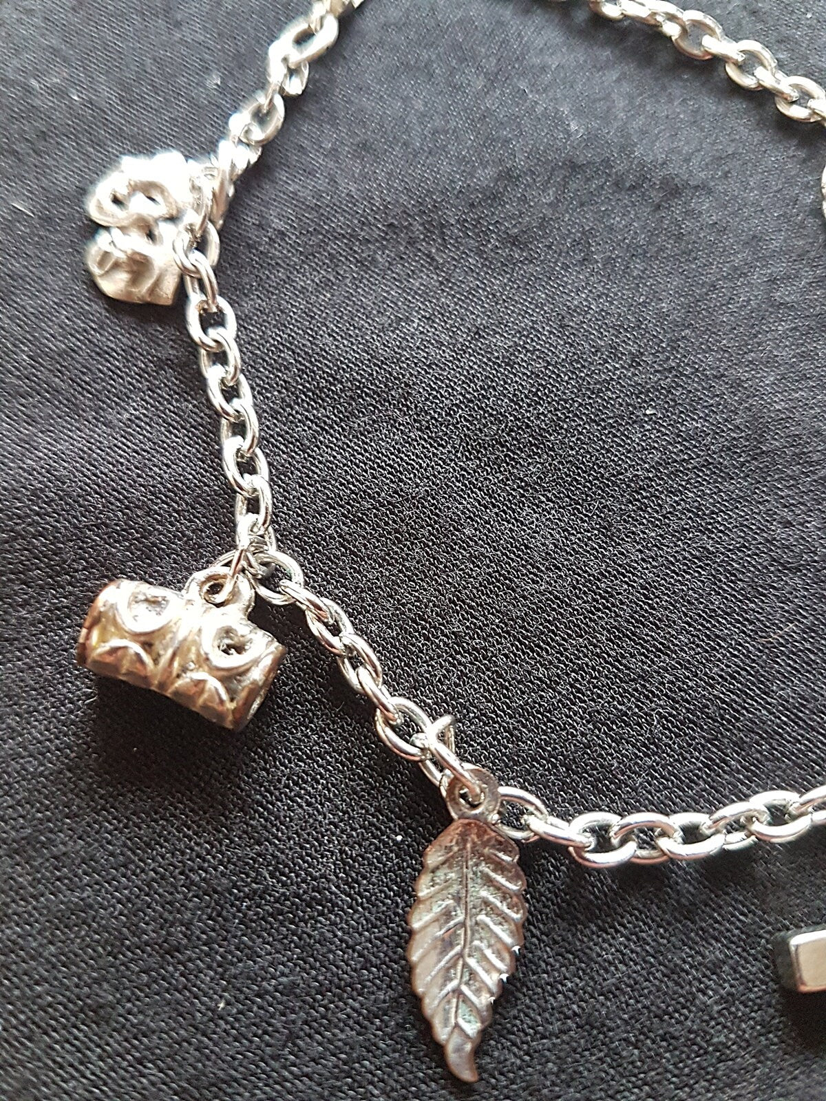 This one is 7.5 inches long including the hook and eye clasp. It is made from one strand of silver chain with various charms on it.