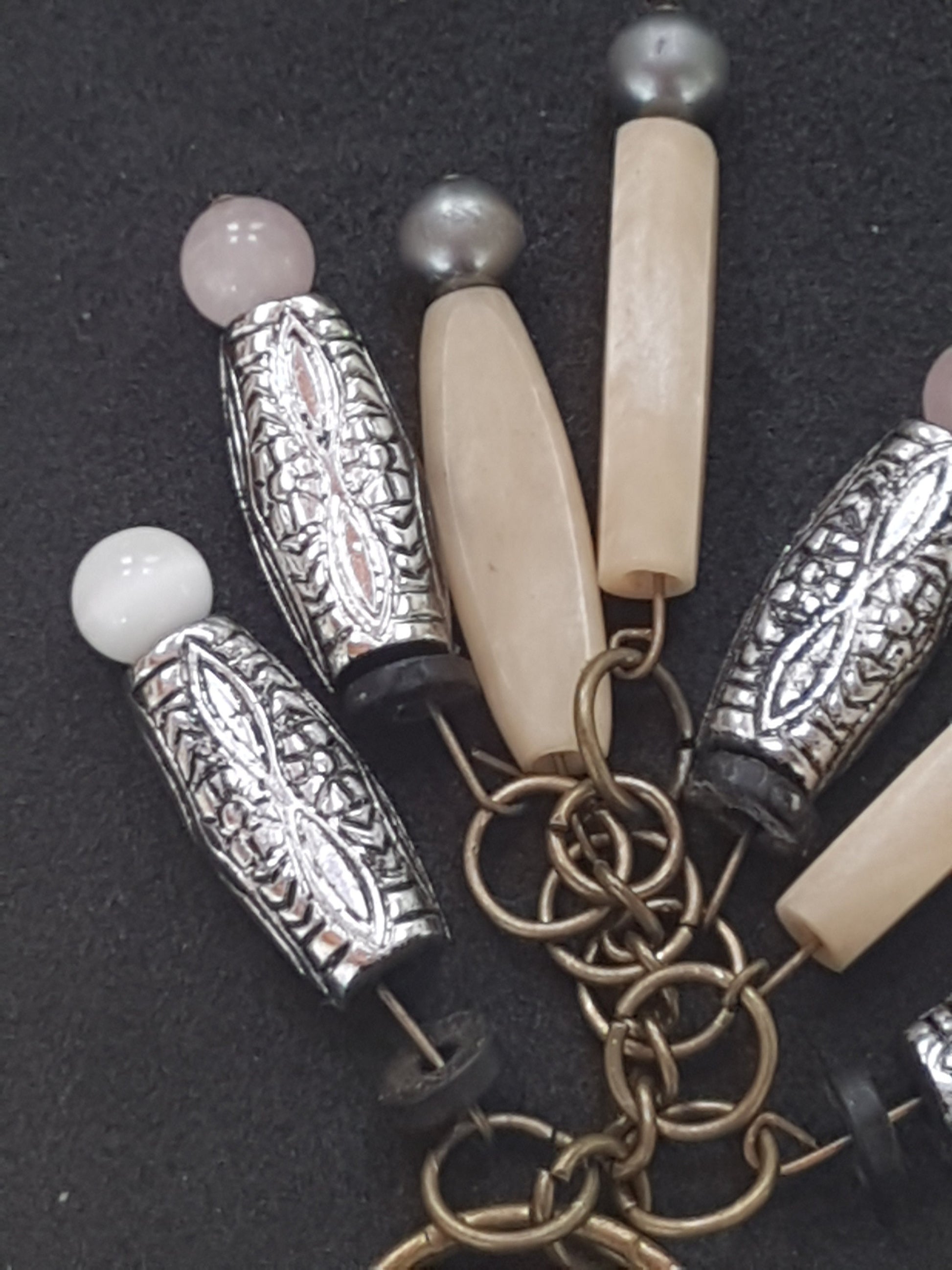 This is a gorgeous little keychain which features a bronze chain, silver, cream, pink and grey resin pendant items and beads.