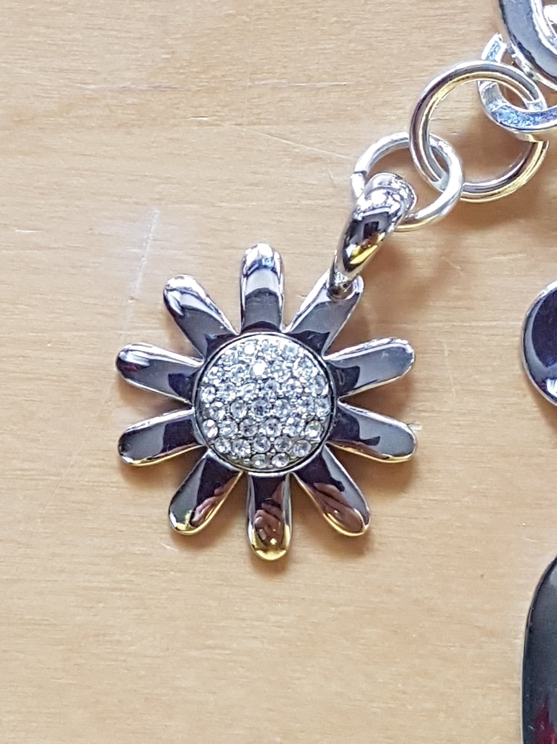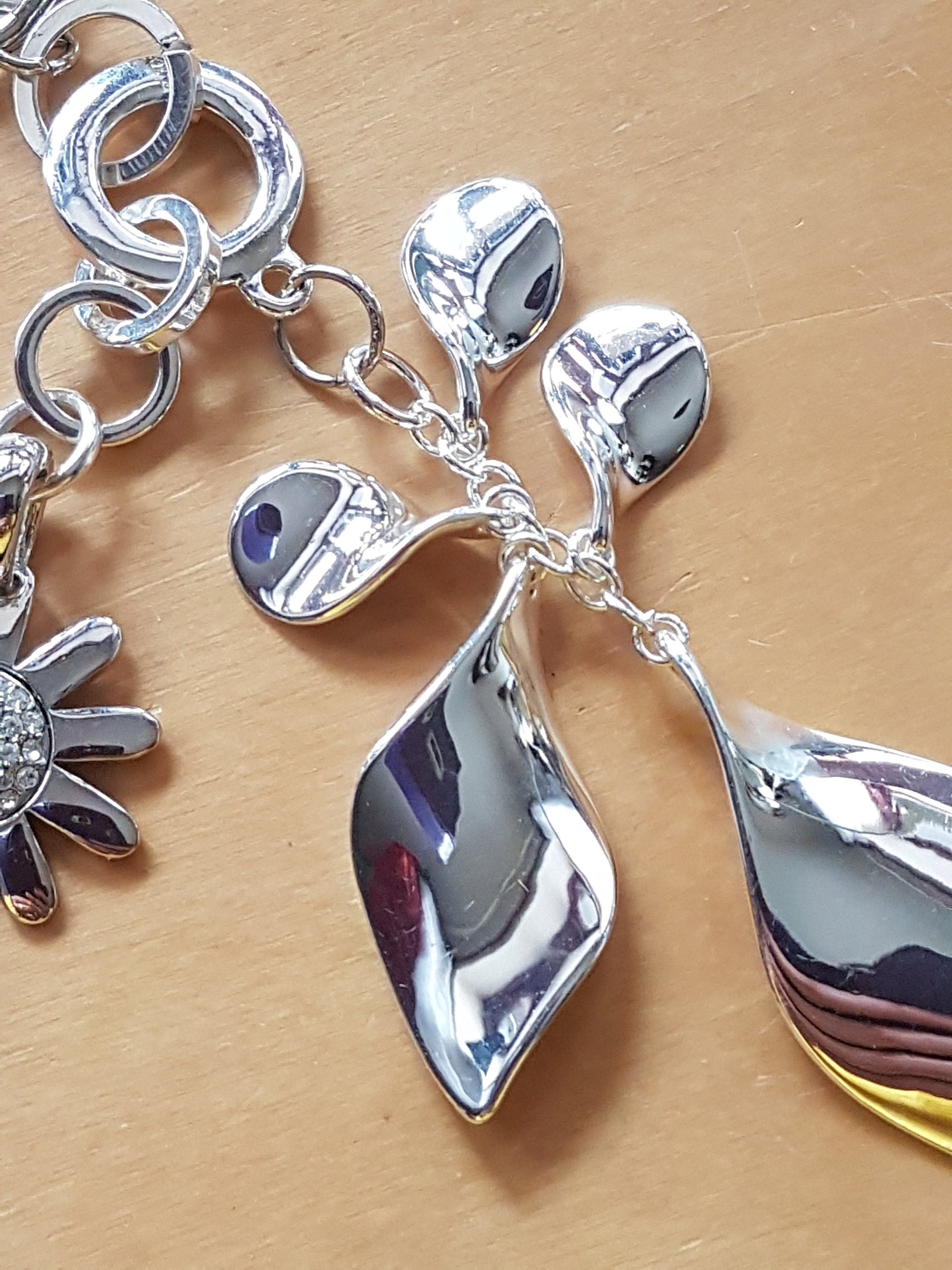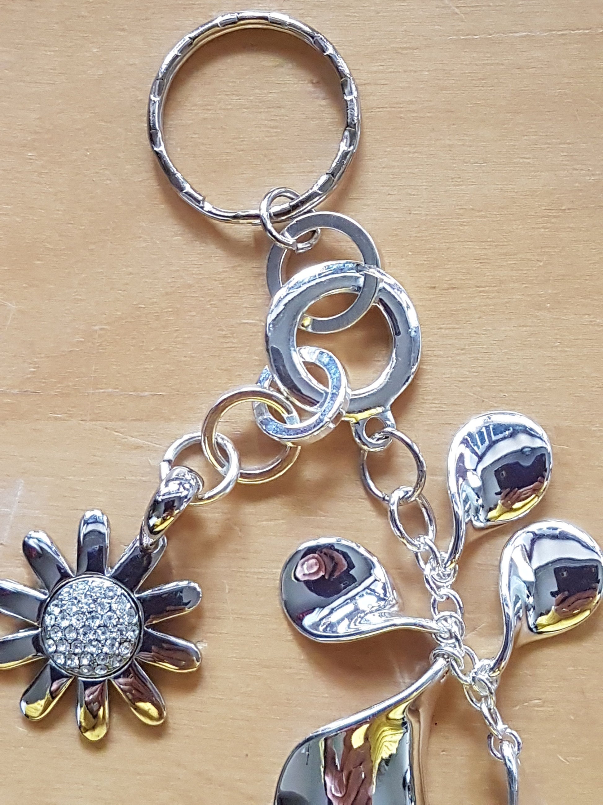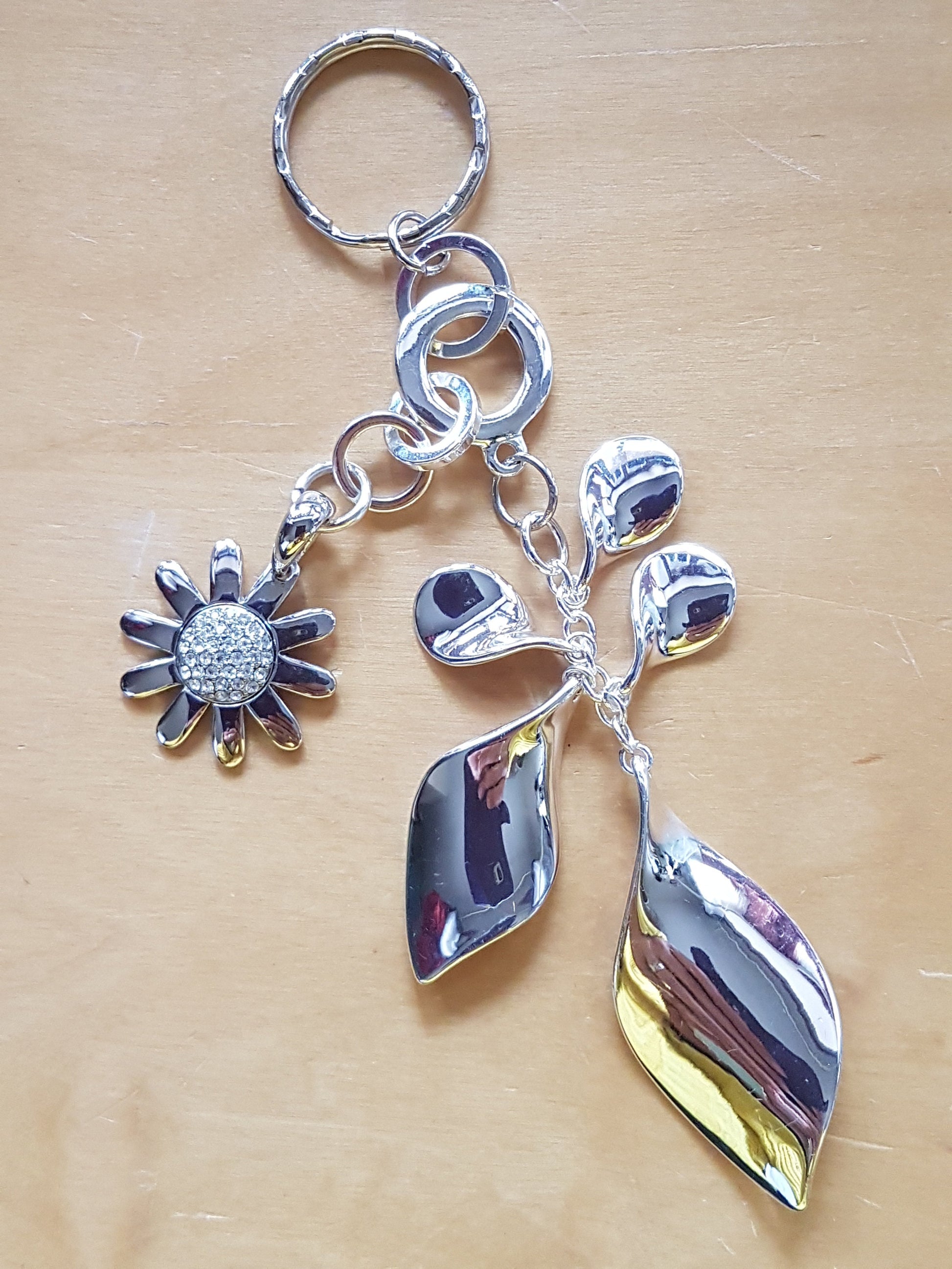 This is a gorgeous little keychain which features a silver chain and a silver flower and silver leaf shapes.