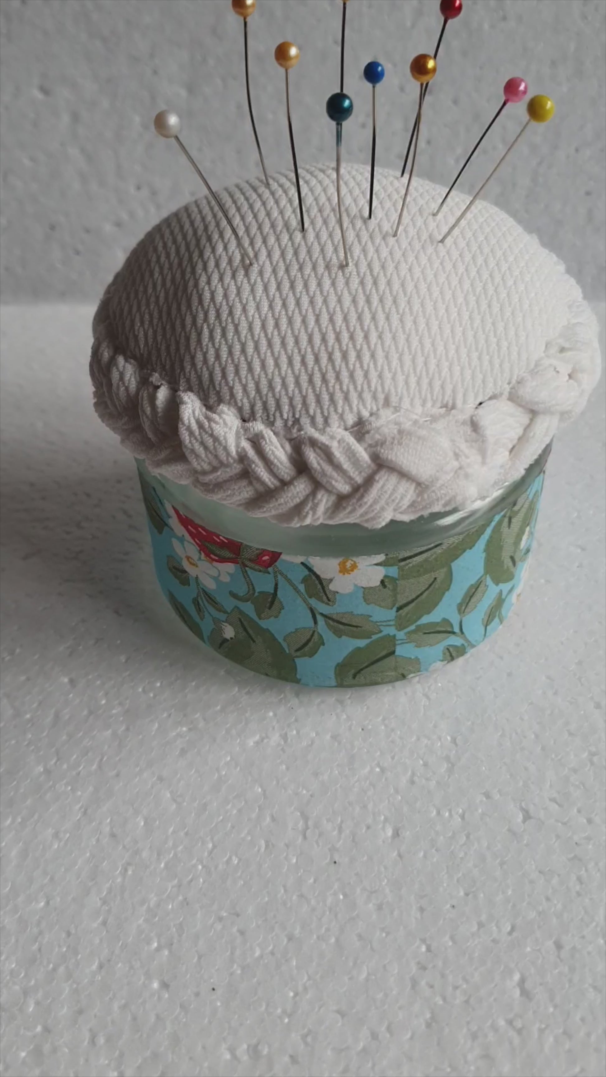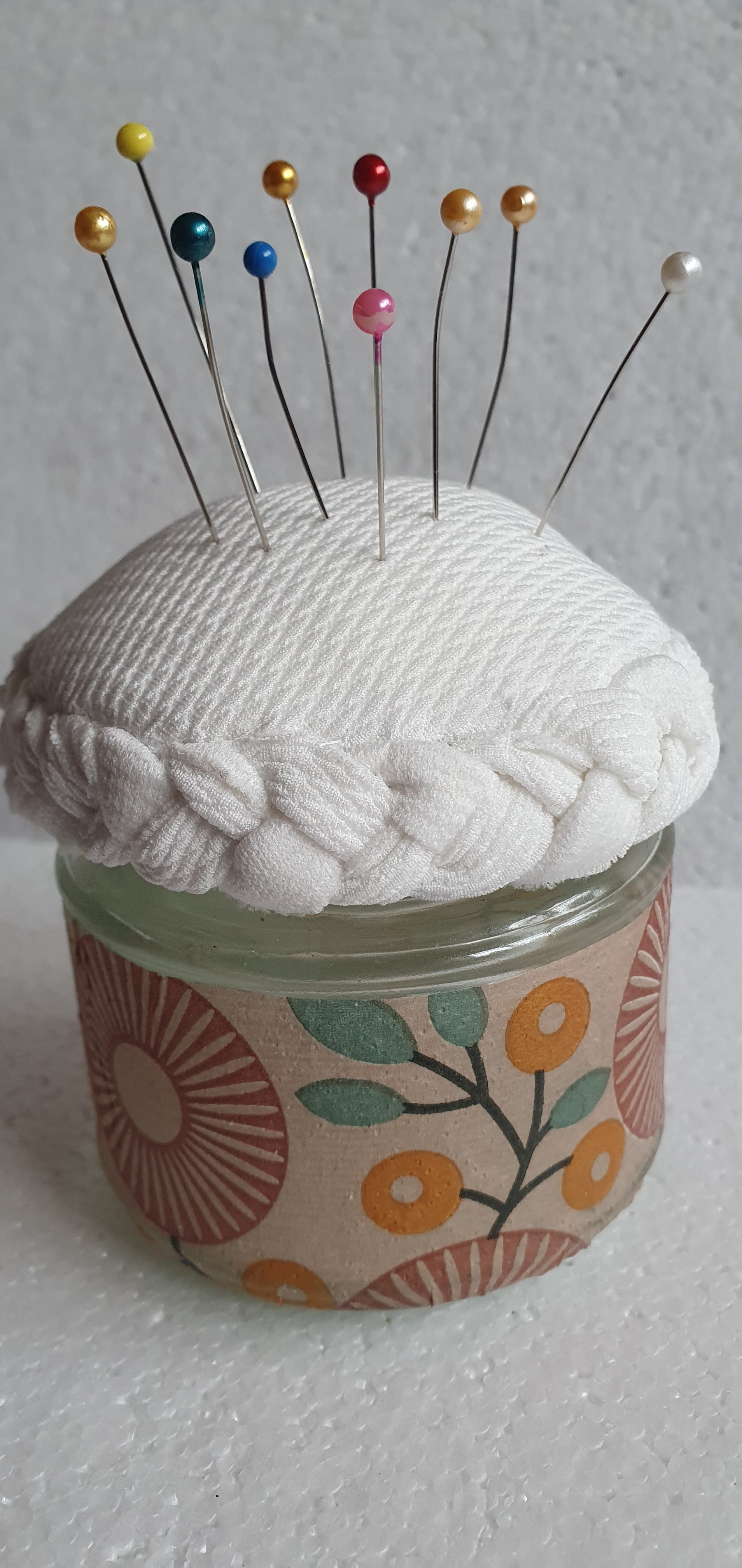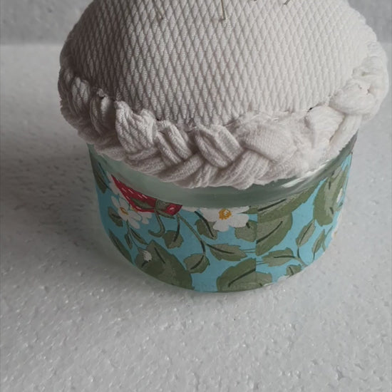 This glass jar has been turned into a pin cushion storage jar and pin cushion, and hand decorated by me in my studio. Each one is a unique design and size and cannot be repeated.