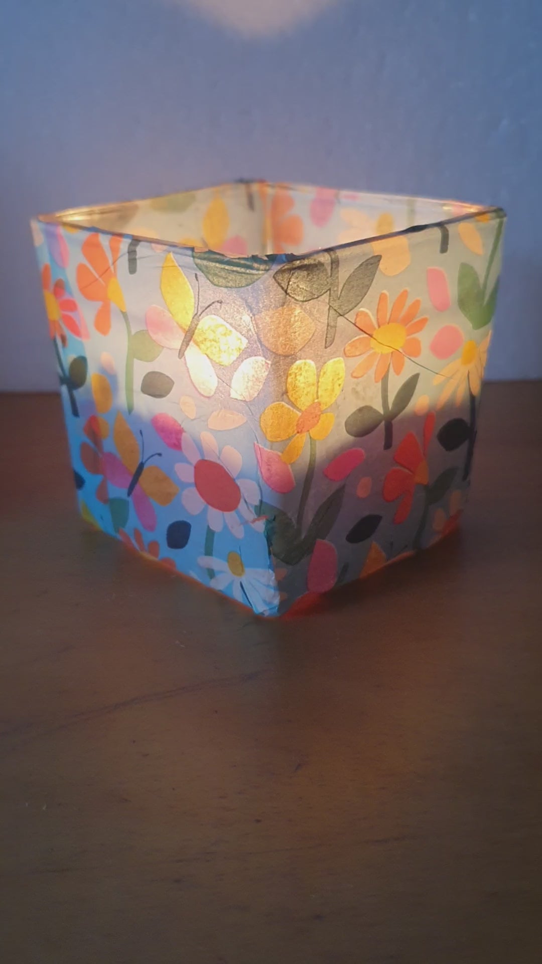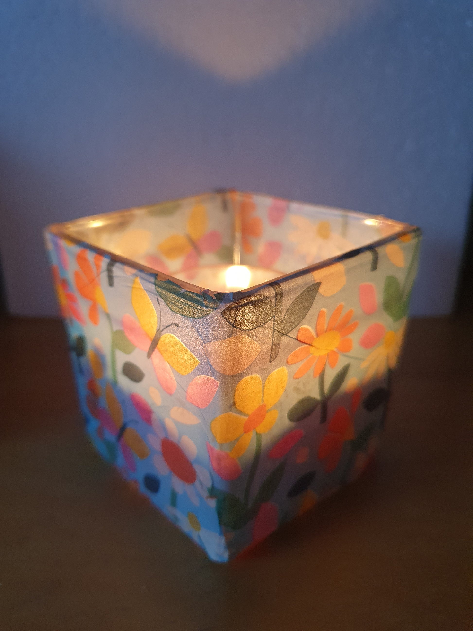 This glass candle jar has been hand decorated by me in my studio using paper designs on reclaimed glass. Each one is a unique design and size and cannot be repeated.