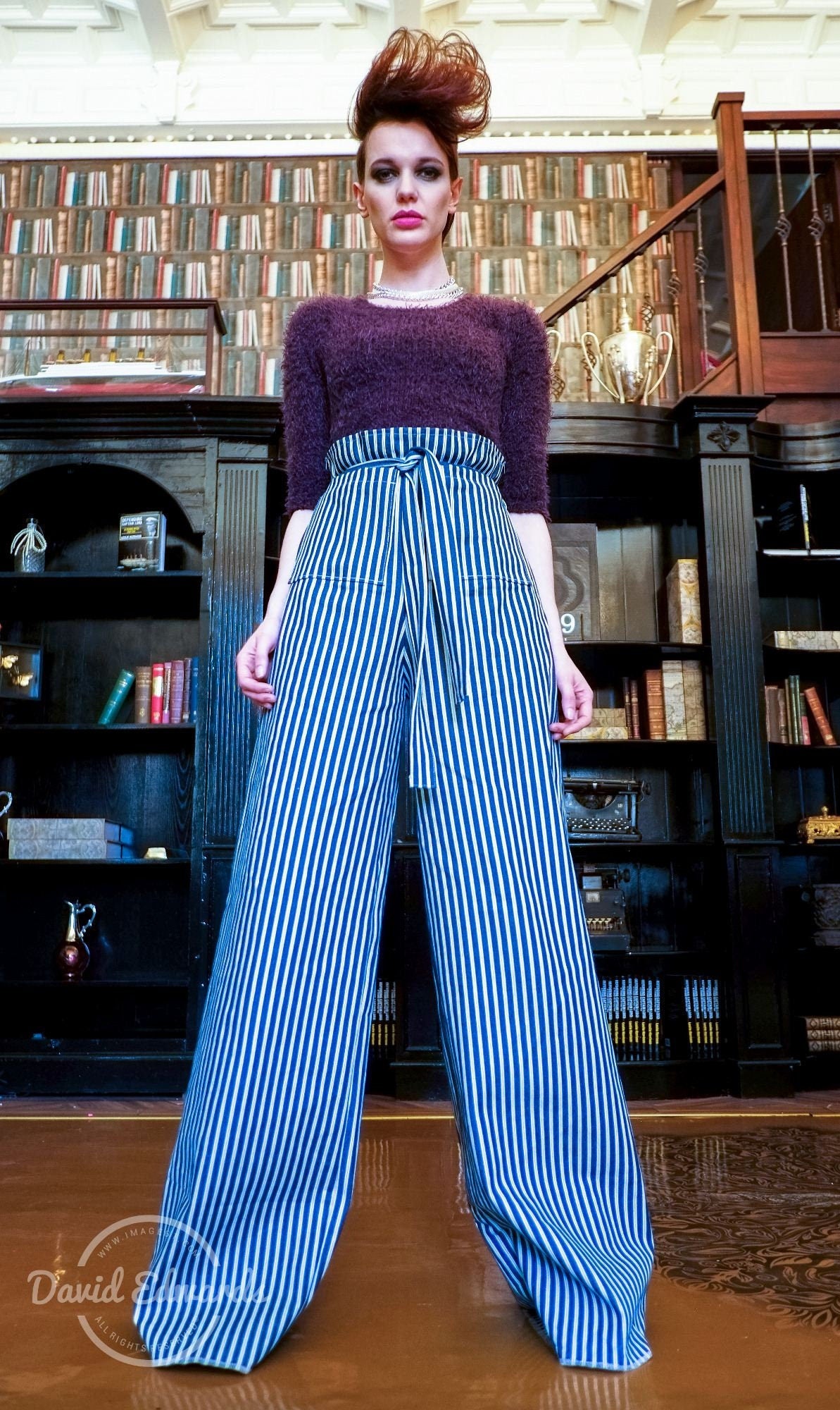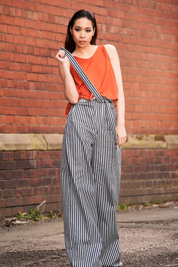 These fabulous extra wide pants in blue and white stripe cotton denim hang beautifully on any figure making this the kind of garment you can dress with heels and a bit of bling for the evening or flats for a Sunday trip out.