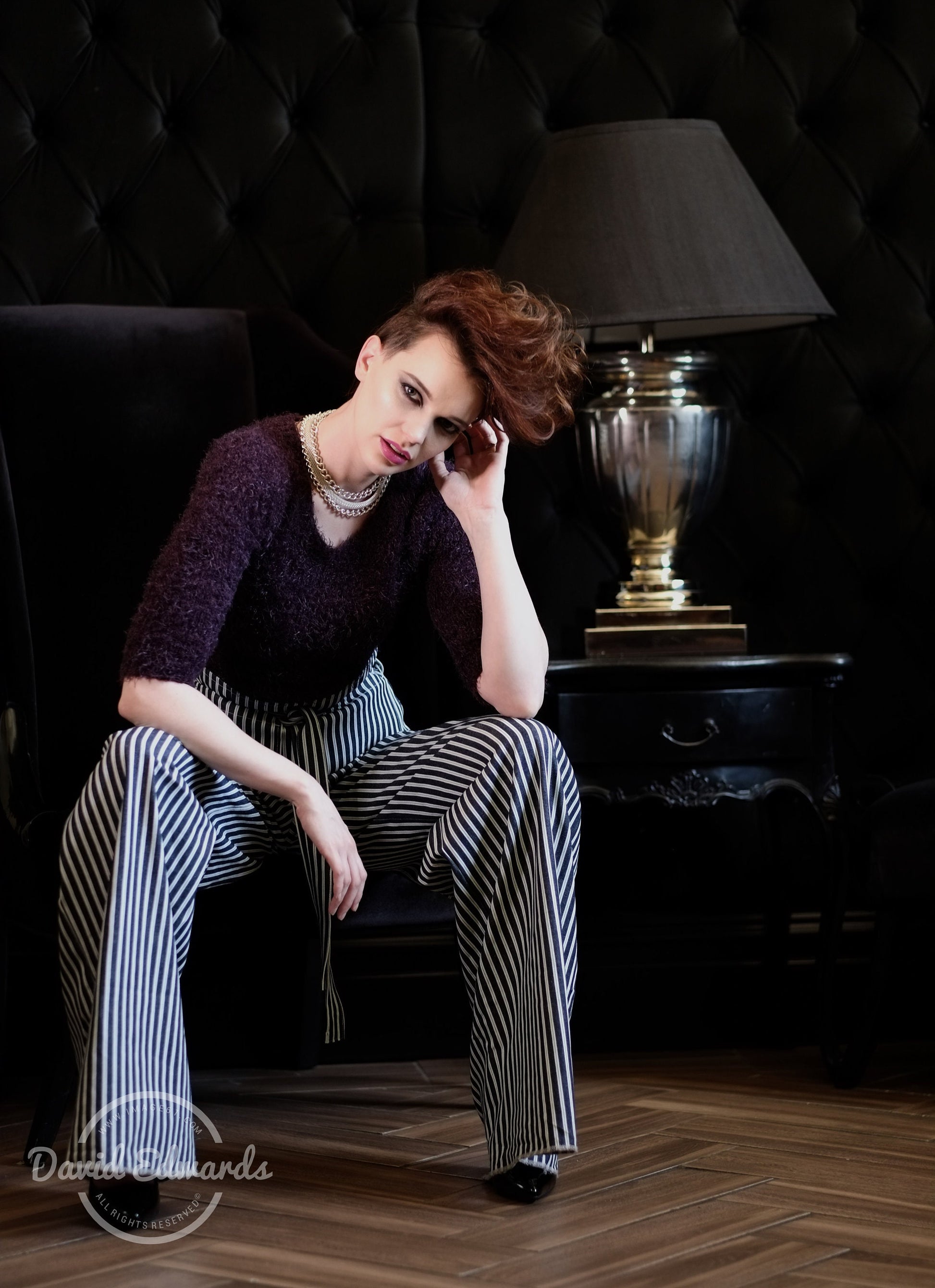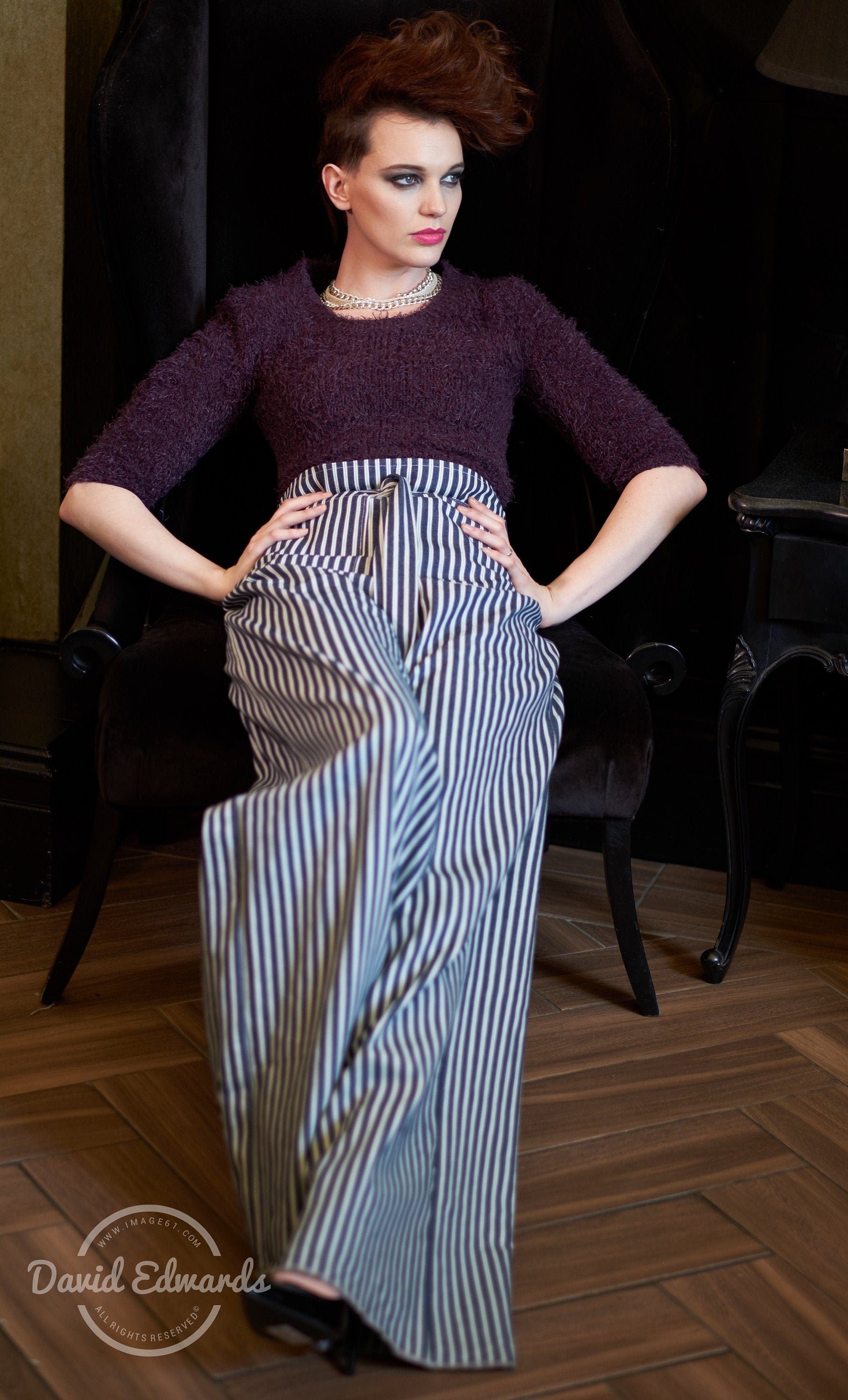 This garment will comfortably fit up to 36-inch waist and a 38-inch hip. it will also fit taller women over 5ft 8ins. The leg length is approx 36 inches and can be shortened on request. Modelled here by a model 5ft 8ins in heels, trousers worn on the hip. Please inquire about the leg length.