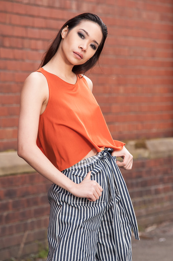 Hemmed at the ankle these trousers have a very wide waist paperbag waist with a belt. It's a fashionable look and means these trousers will fit many waist sizes and still look awesome! Features two large front patch pockets.