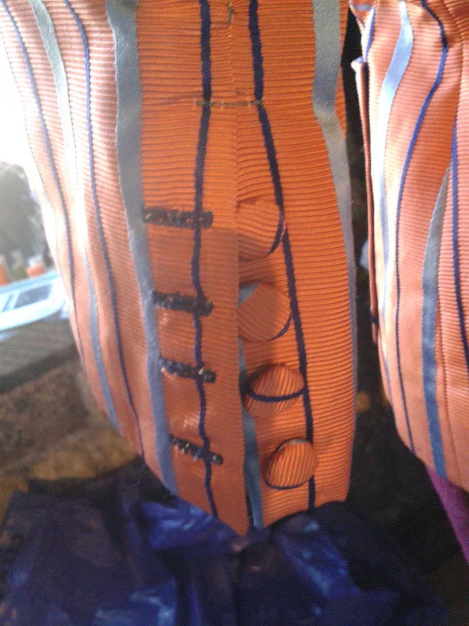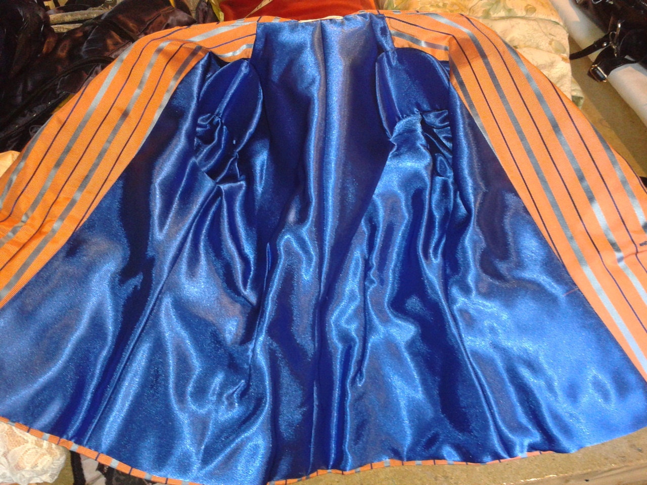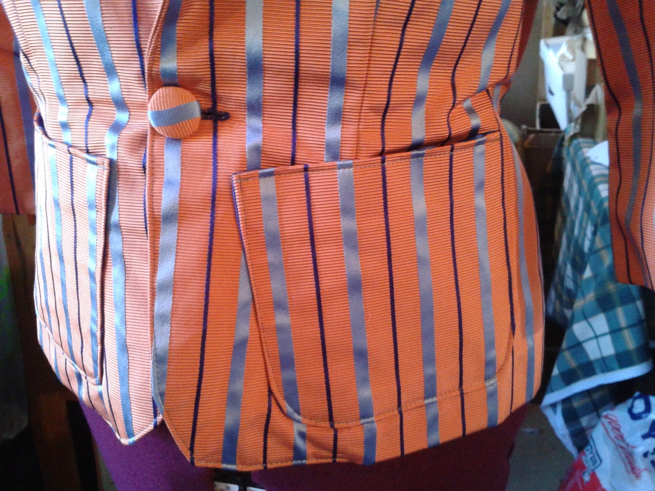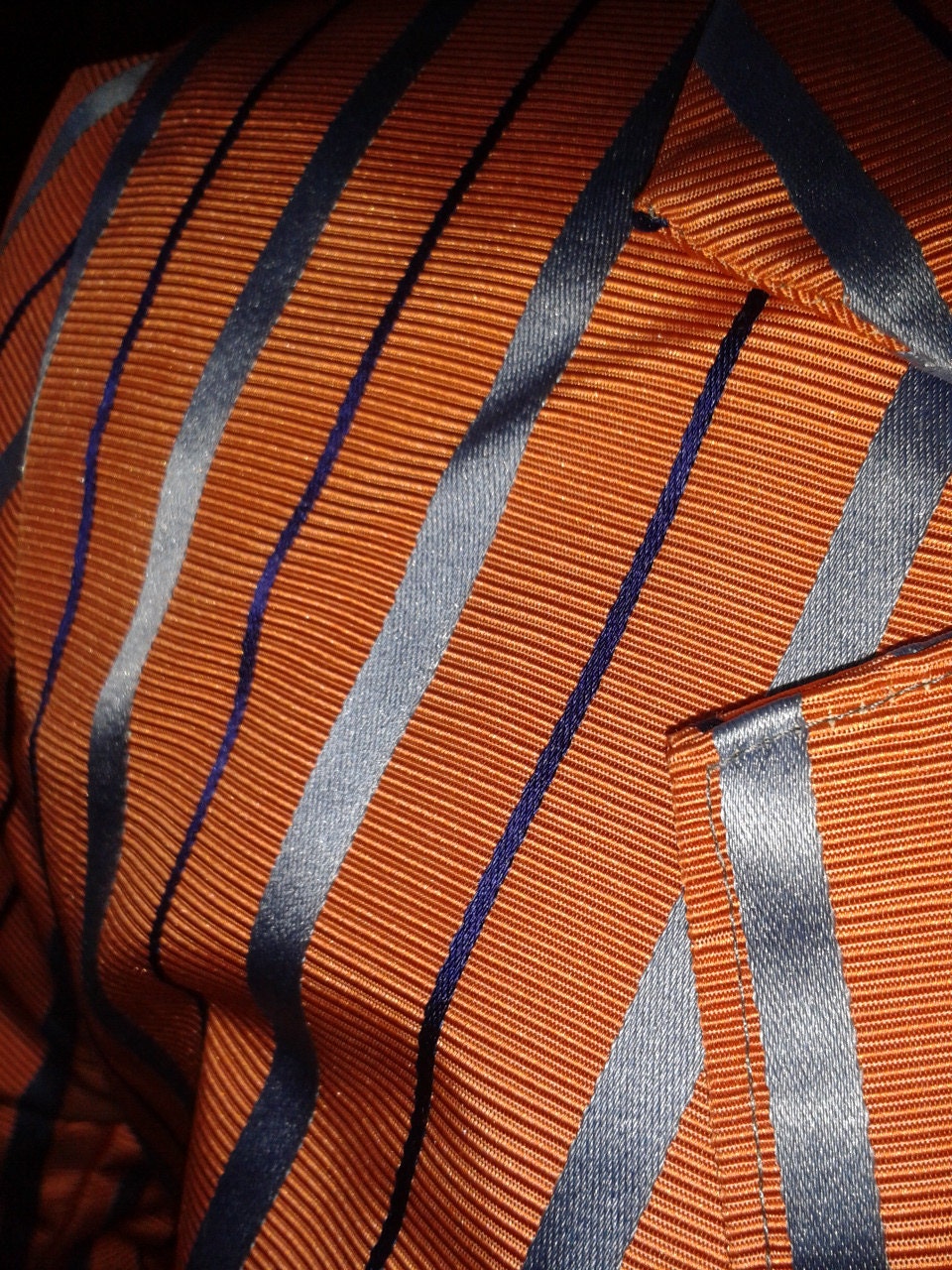 It's made from striped silk with a gorgeous electric blue lining. The fabric is a salmon pink colour, with a wide grey stripe and a thin blue stripe.