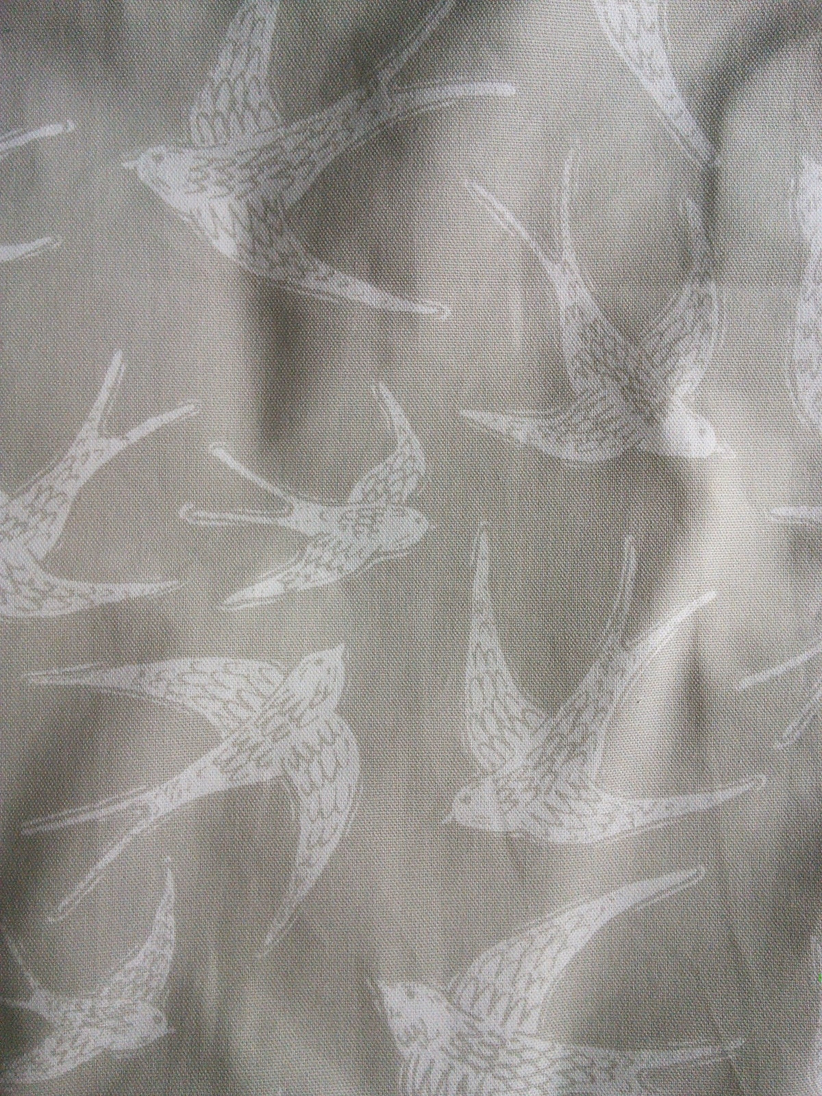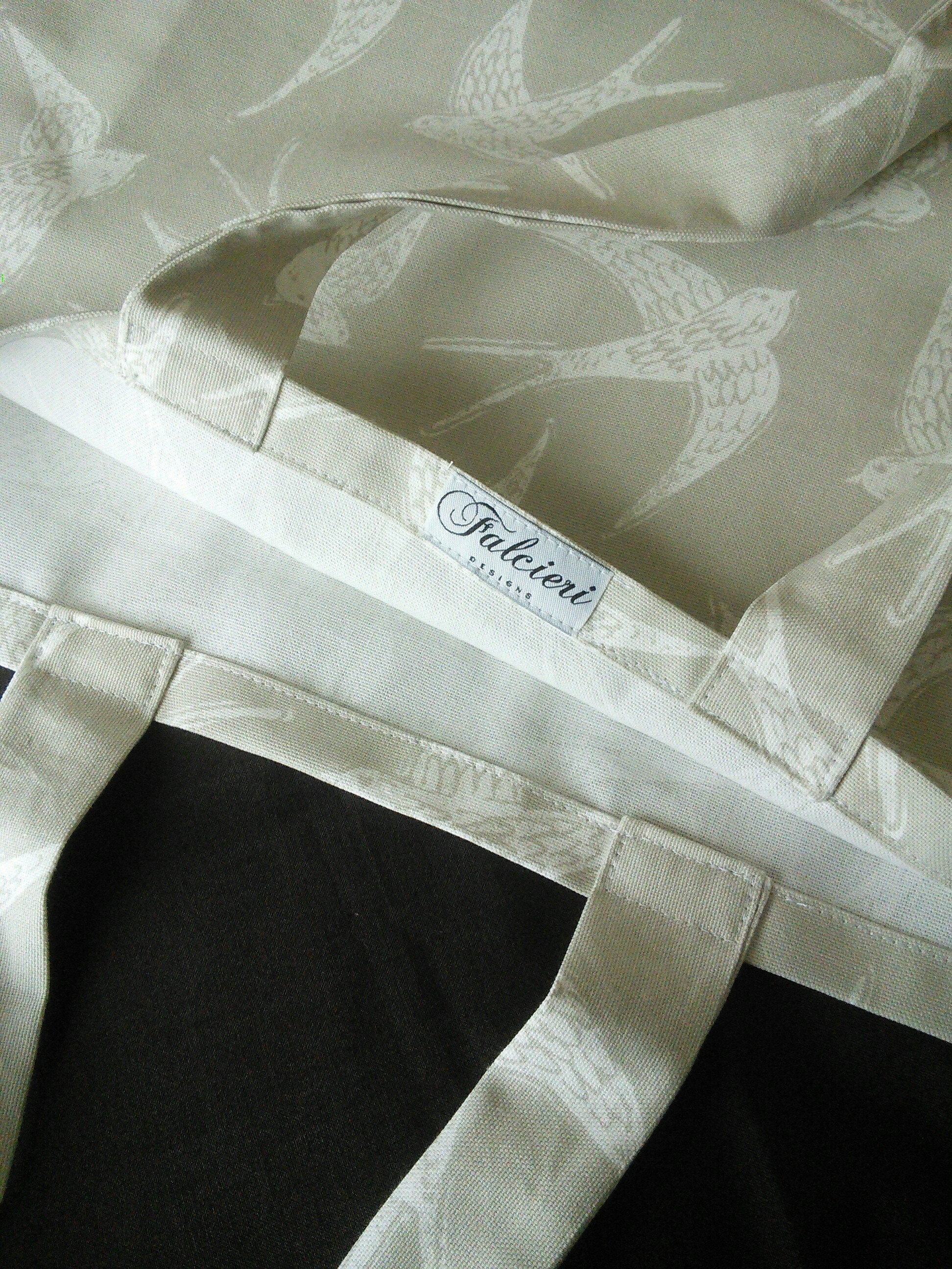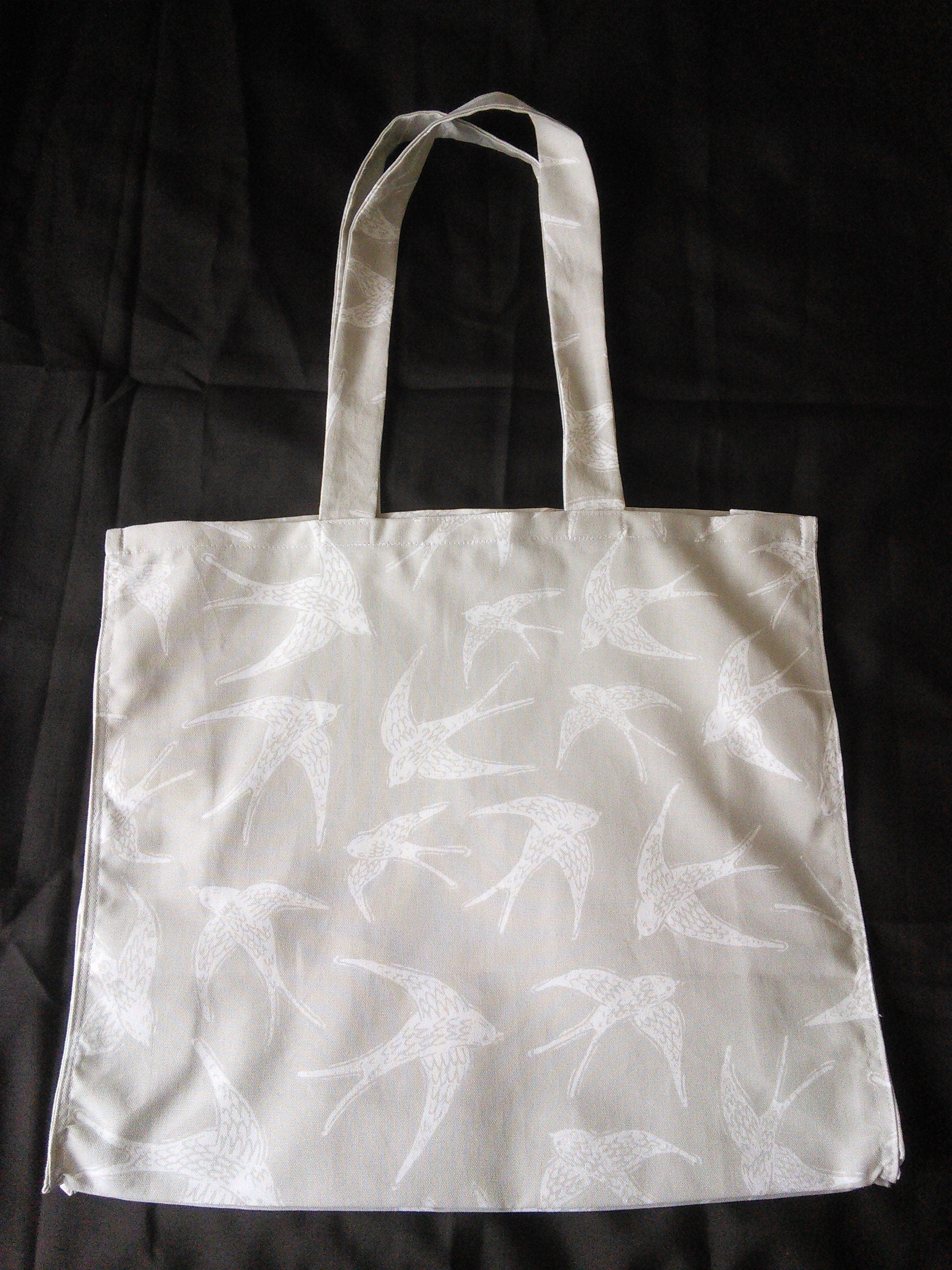 This gorgeous tote / book / shopping bag is made from hard-wearing heavy weight cotton fabric in a soft dove grey and white with a swallow motif on it. It has a huge number of uses - perfect for shopping, a trip to the library or as a holiday travel bag. It folds up nice and small can be washed and ironed.