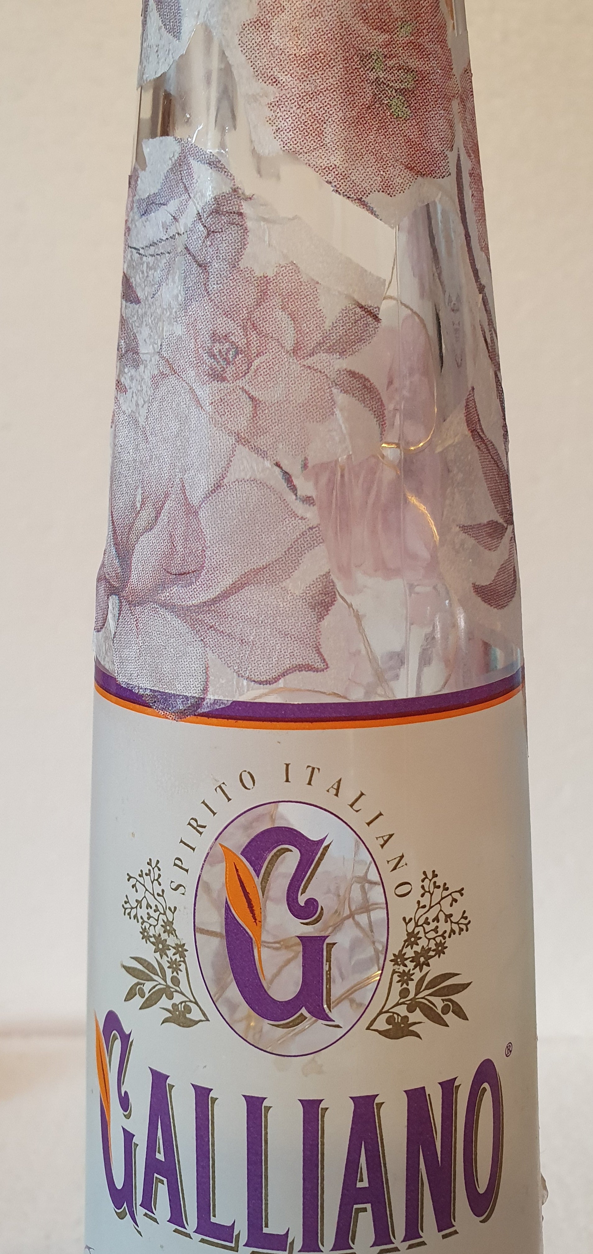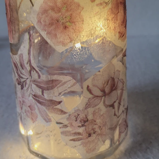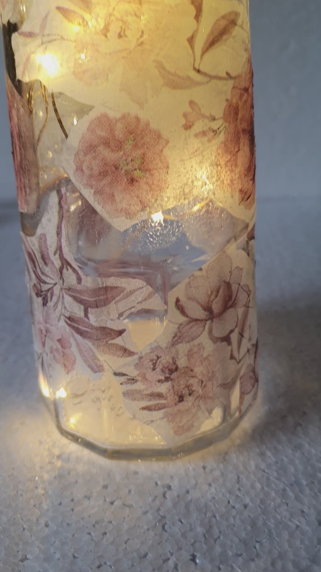This glass bottle has been hand decorated by me in my studio using paper designs on reclaimed glass. Each one is a unique design and size and cannot be repeated.