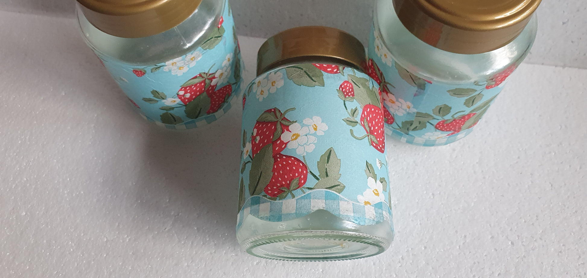 This set of 3 storage jars have been hand decorated by me in my studio using paper designs on reclaimed glass. This set is a unique design and size and cannot be repeated.