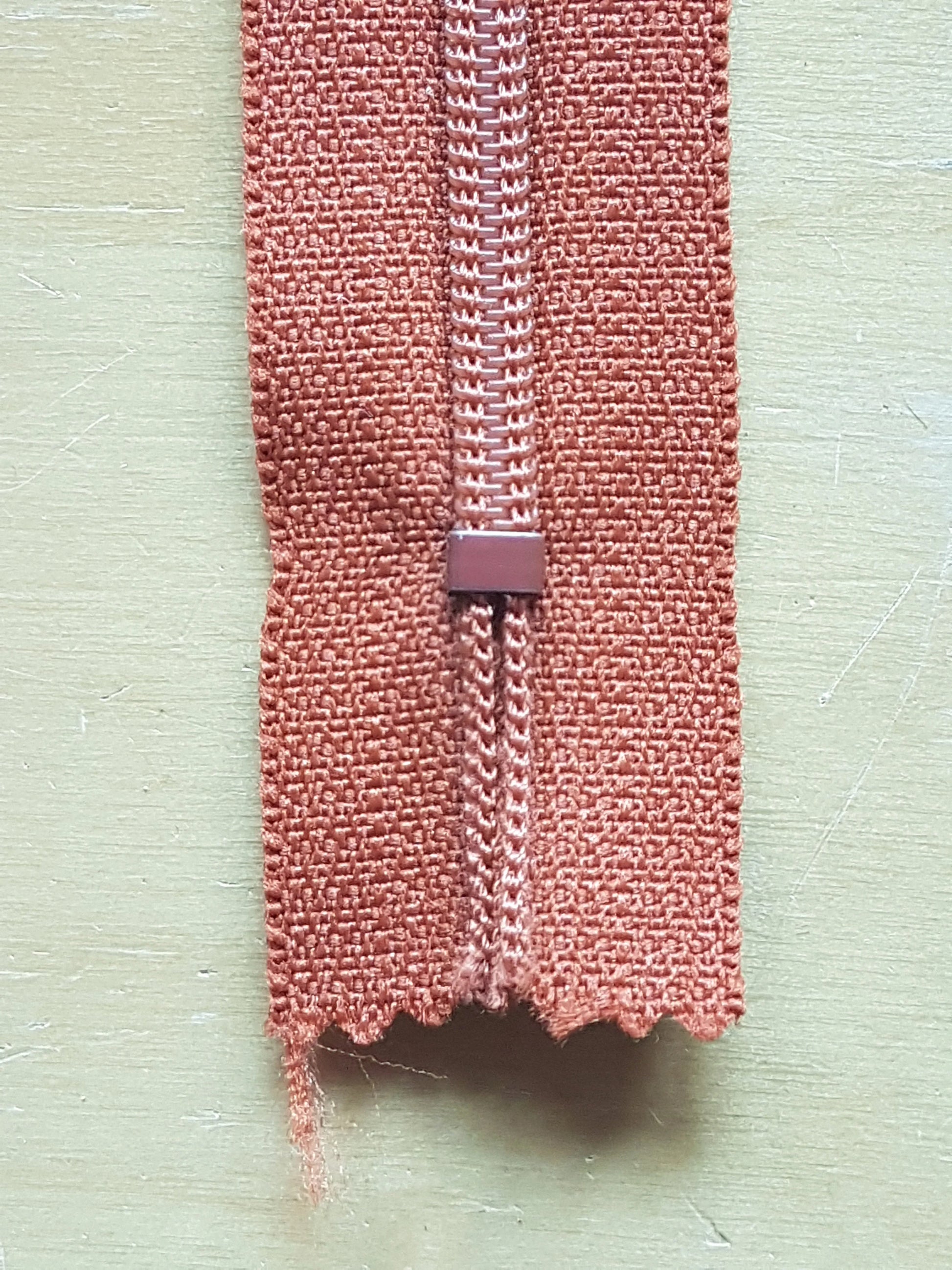 This zip is brand new. This one is terracotta / orange / brown 7 inches (zip part only), with nylon teeth and metal zipper and end.