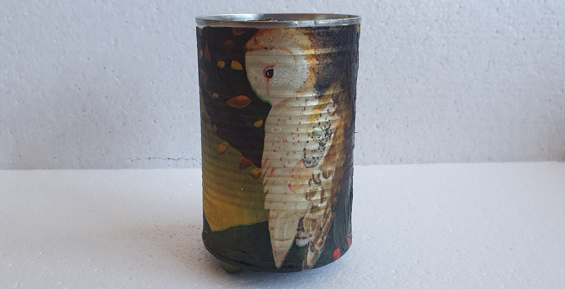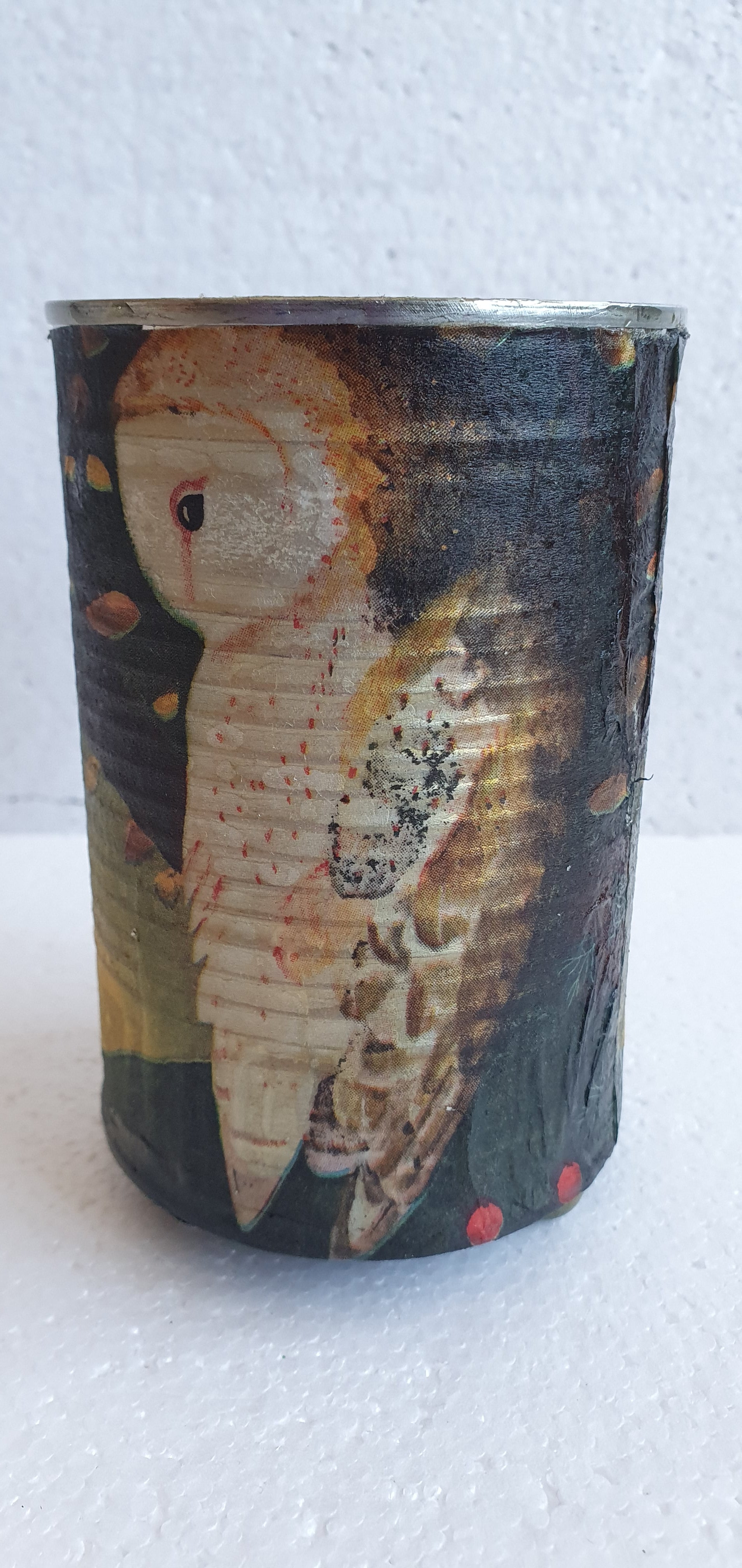 Upcycle Tin Can Desk Tidy Planter Autumn Barn Owl Pattern Decoupage Hand Decorated Home Decor Gift