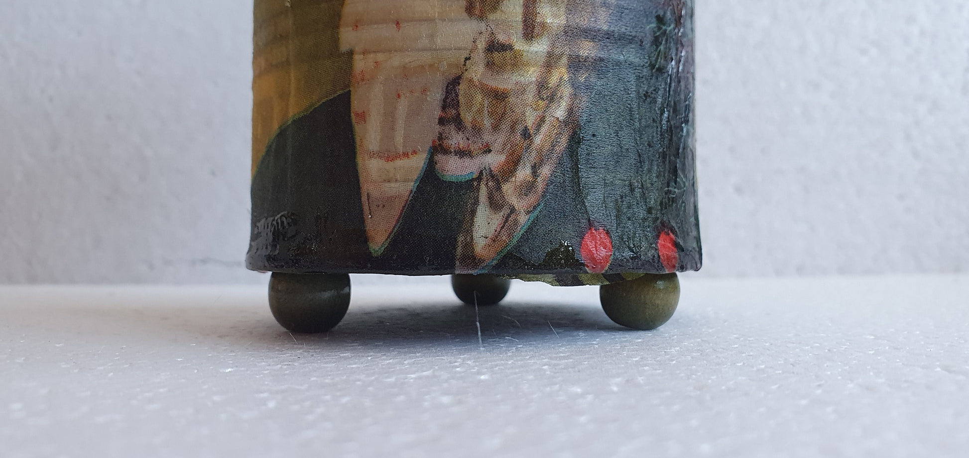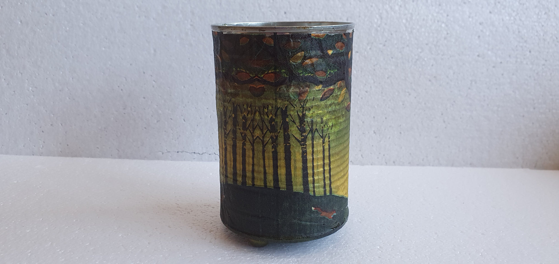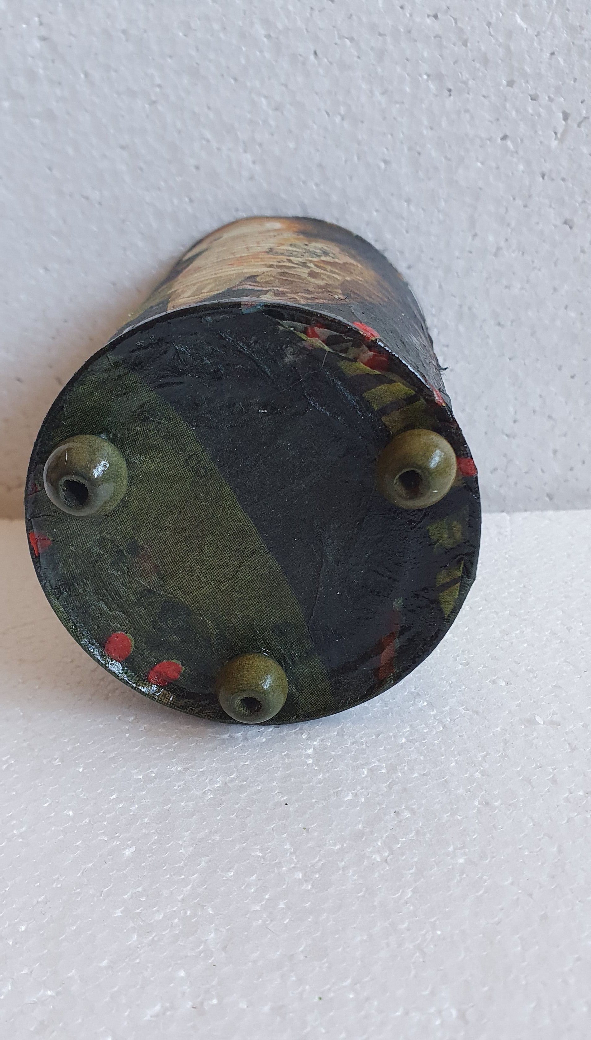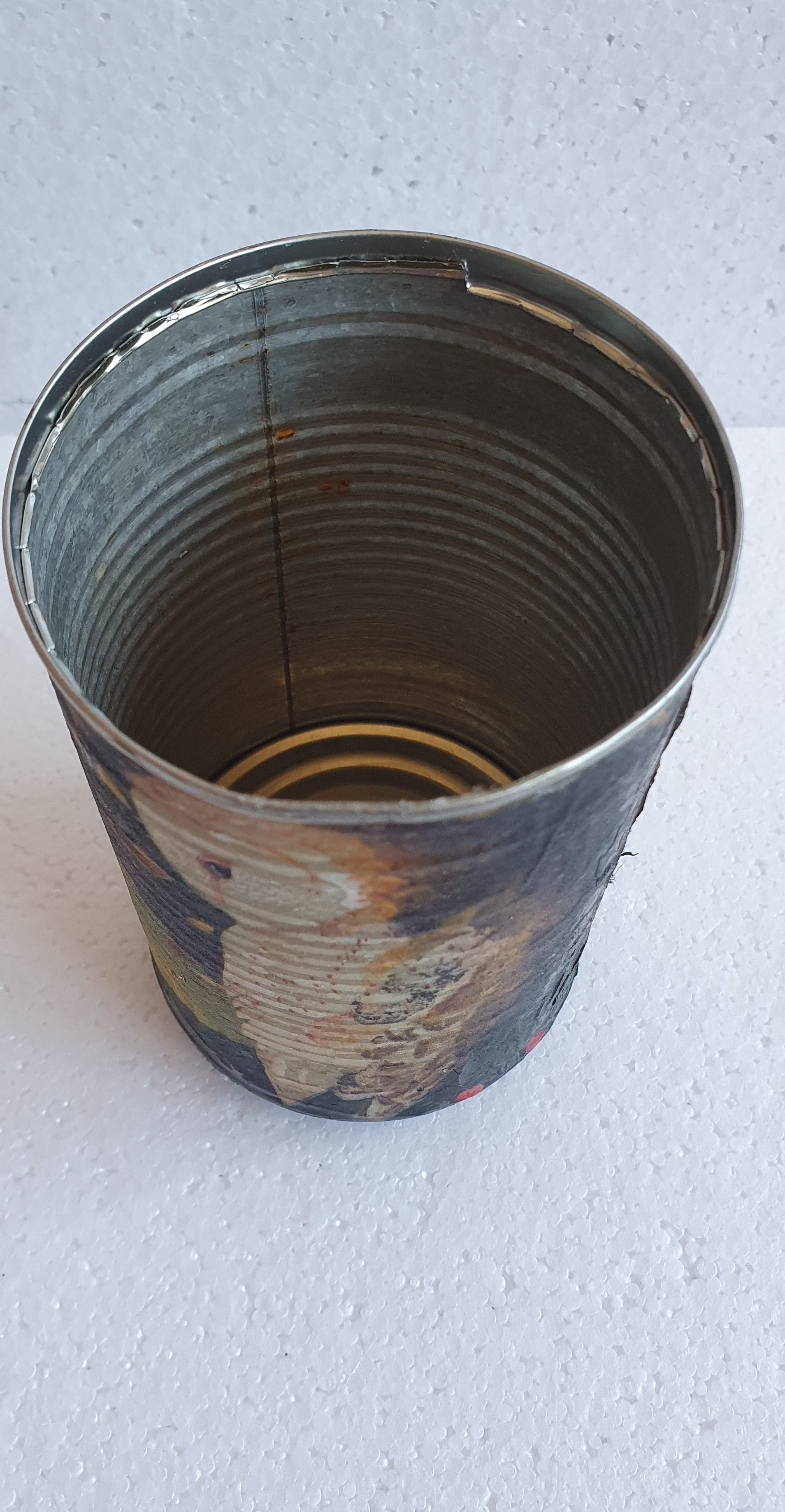 This tin can has been hand decorated by me in my studio using paper designs on reclaimed cans and varnish sealed.