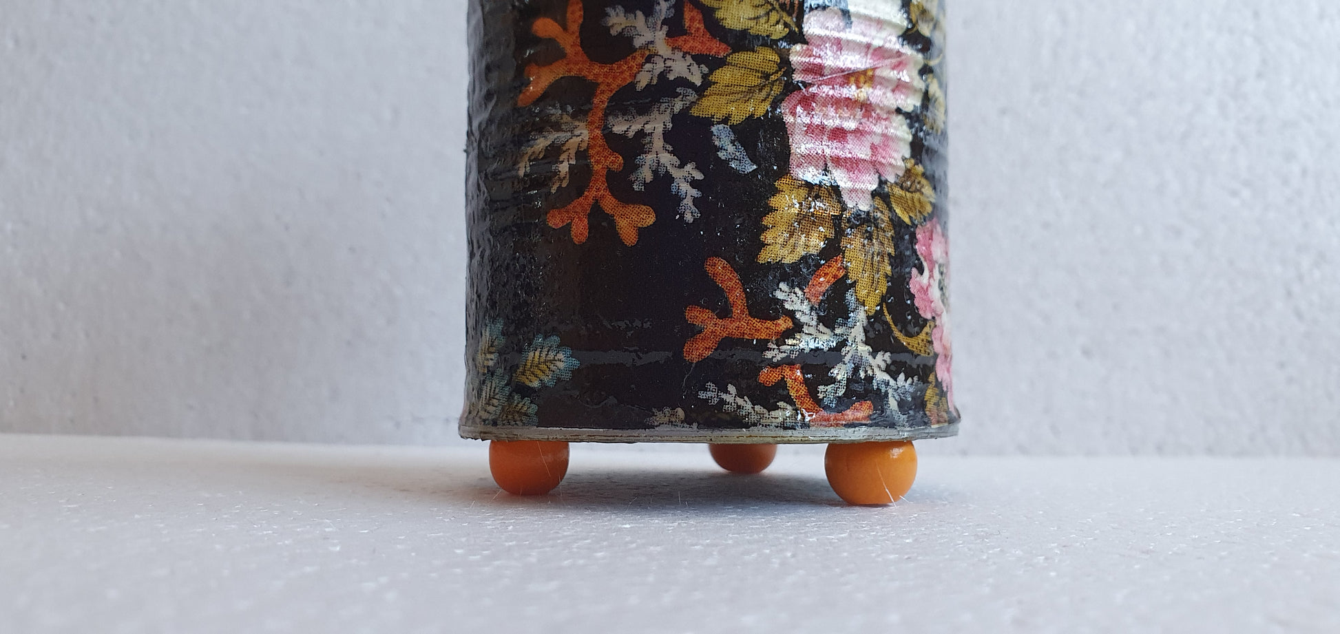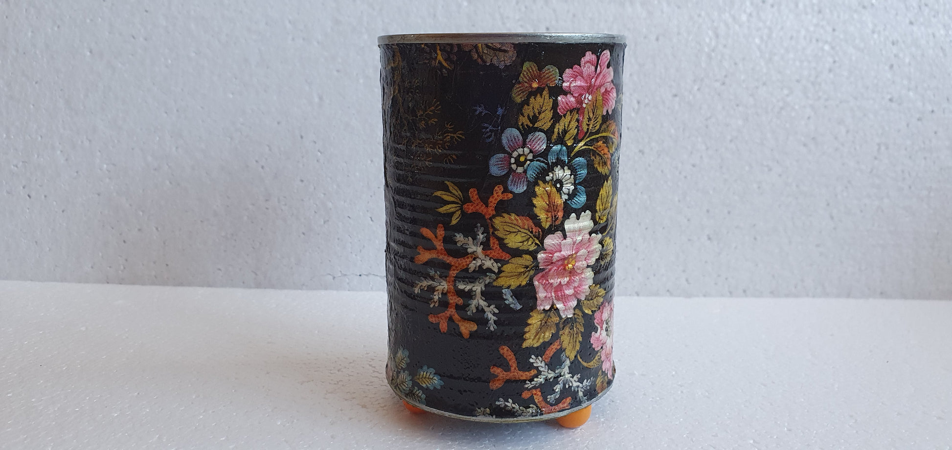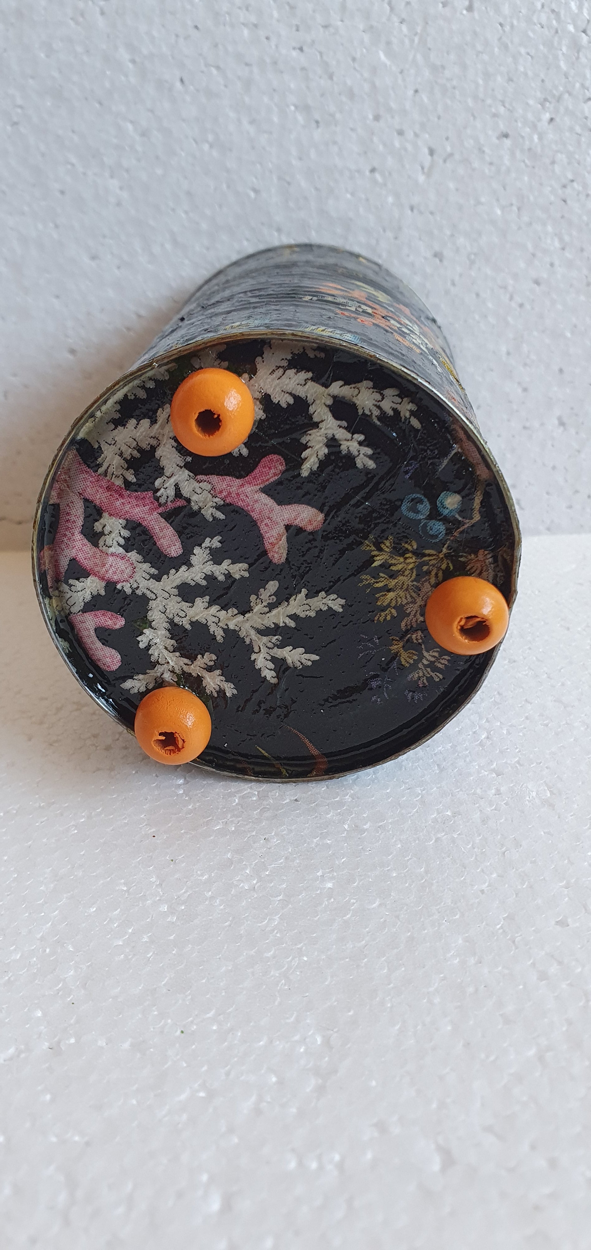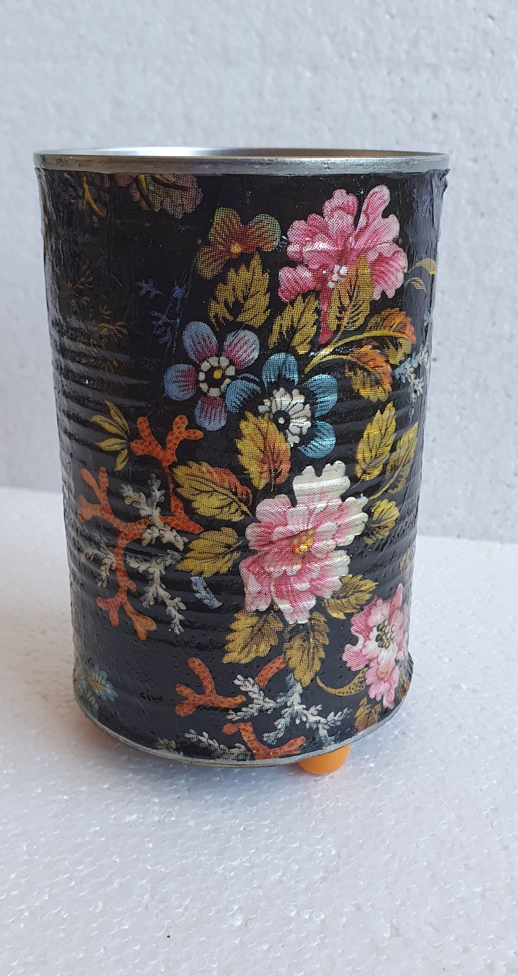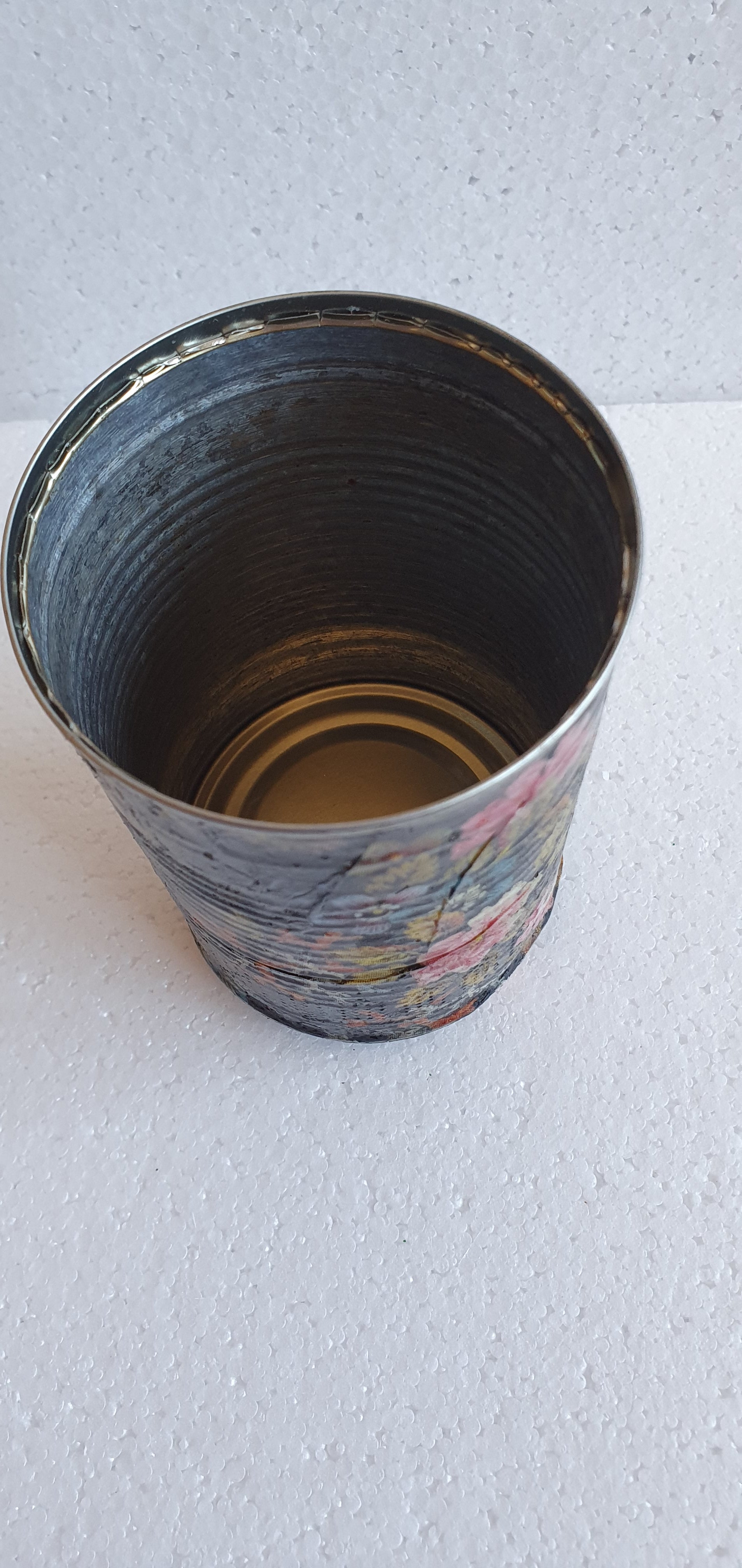 This tin can has been hand decorated by me in my studio using paper designs on reclaimed cans and varnish sealed.