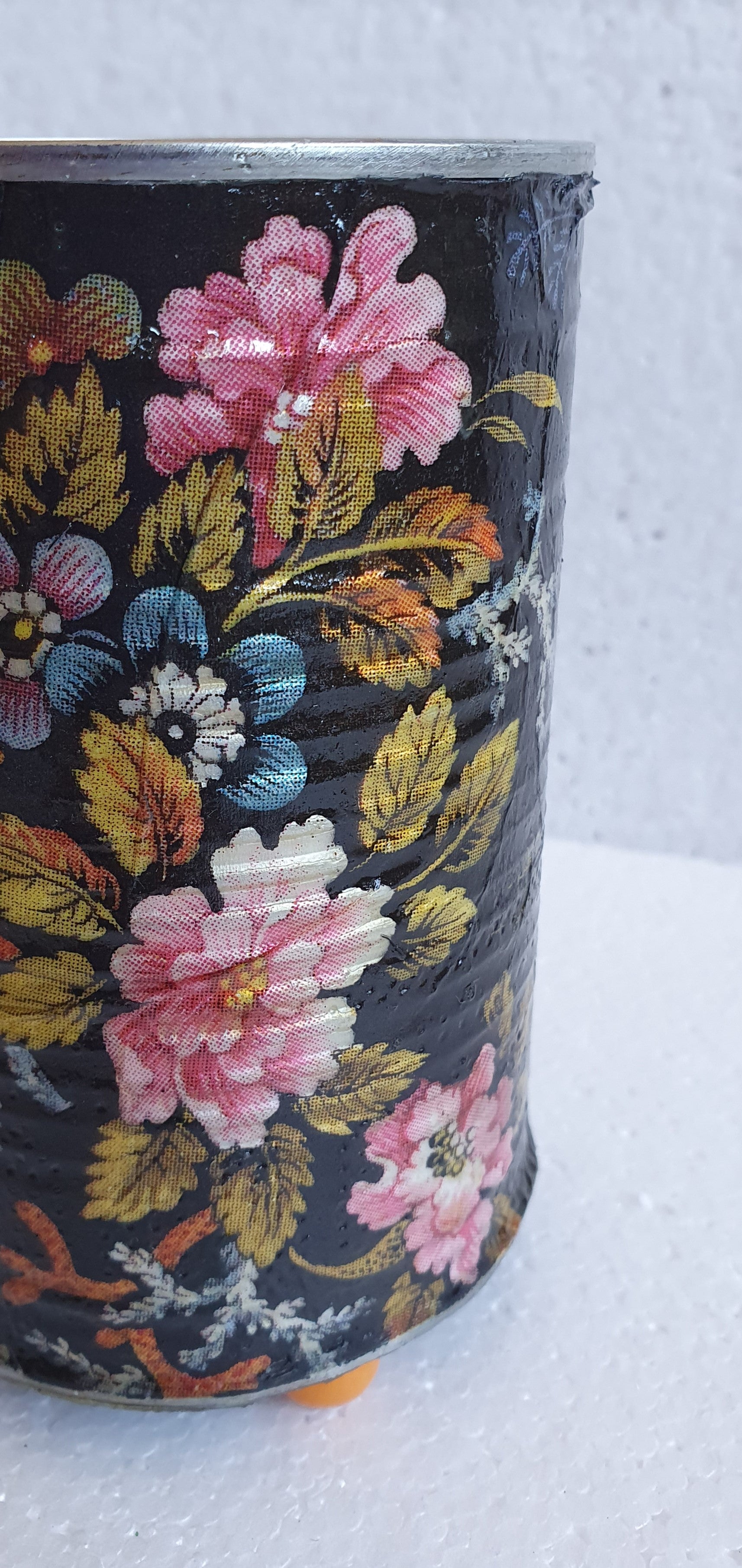 Upcycle Tin Can Desk Tidy Planter Black Pink Marine Flower Pattern Decoupage Hand Decorated Home Decor Gift