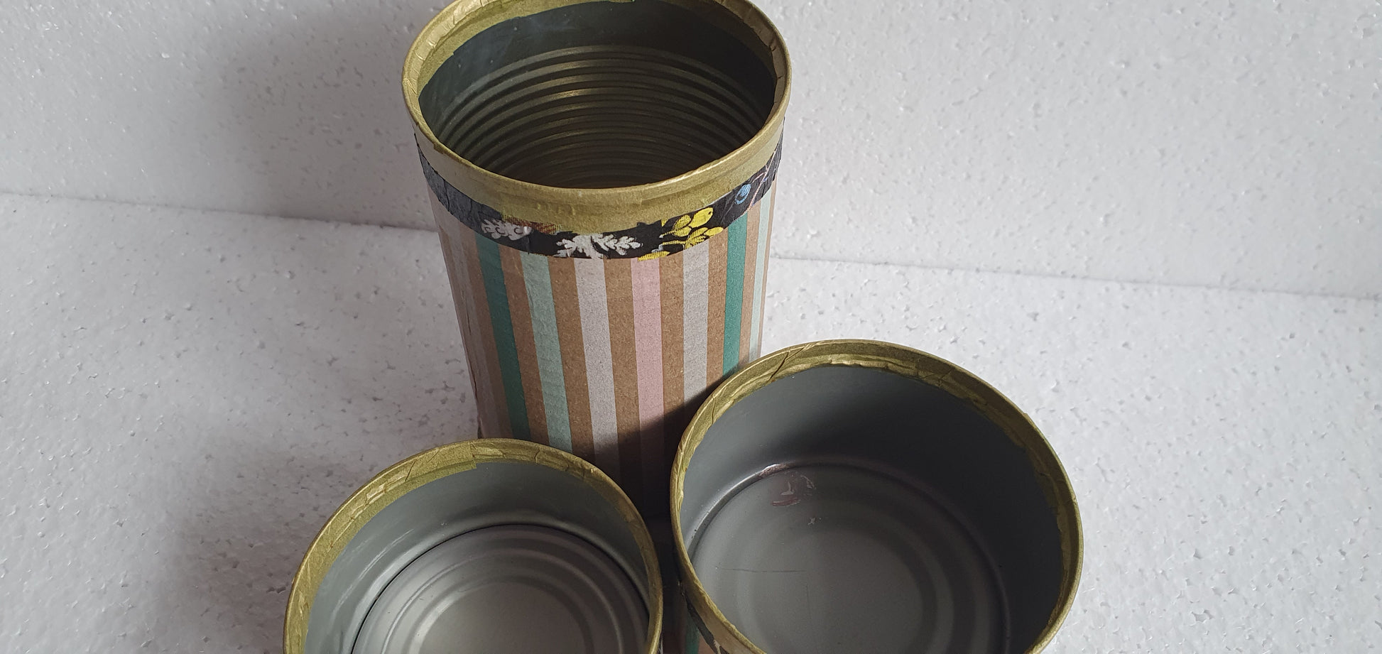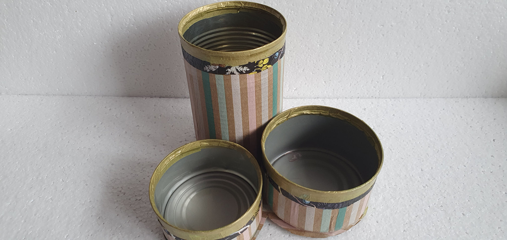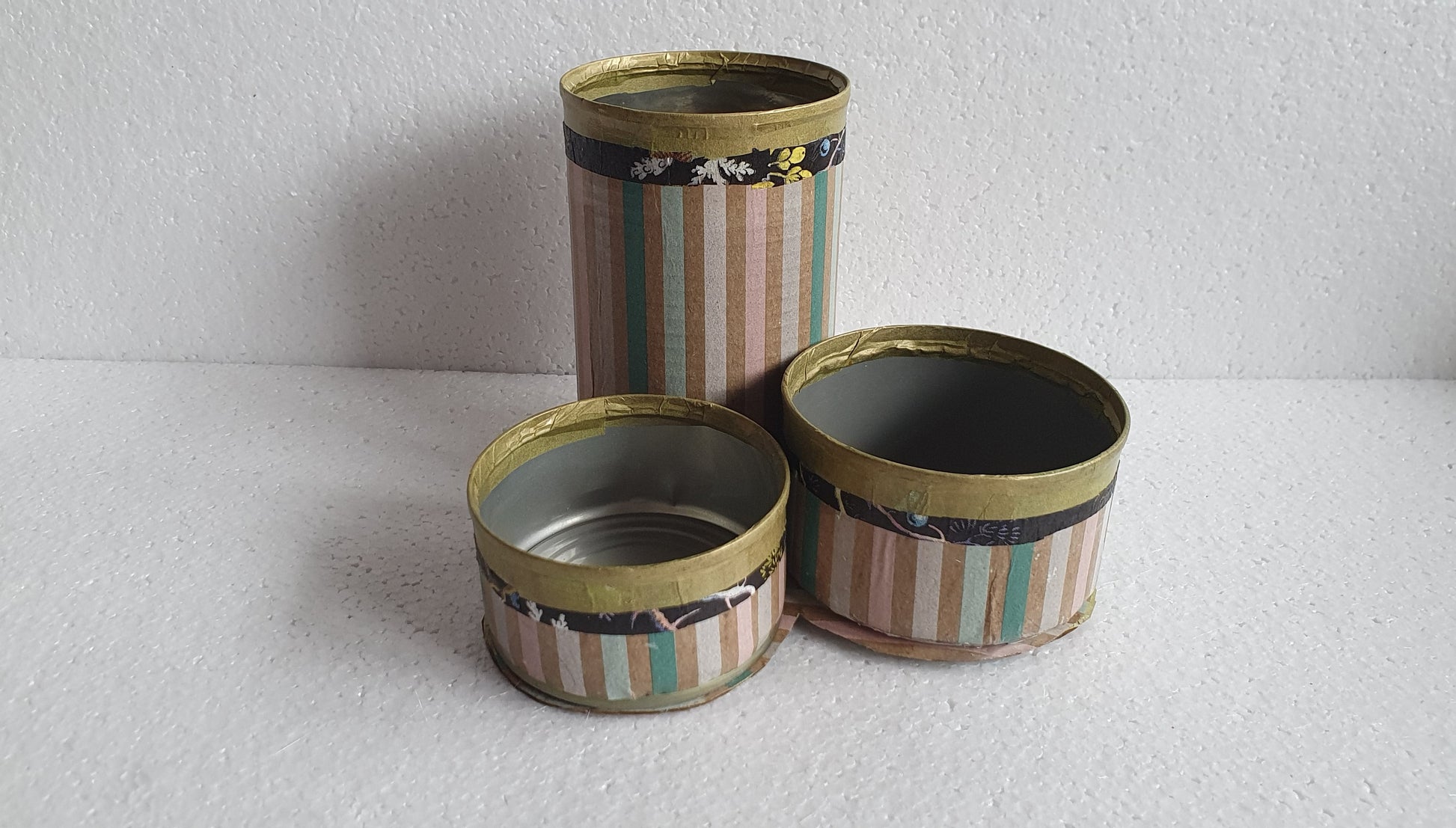 This tin can desk tidy set has been hand decorated by me in my studio using paper designs on reclaimed cans. It is a set of three fixed on a base.