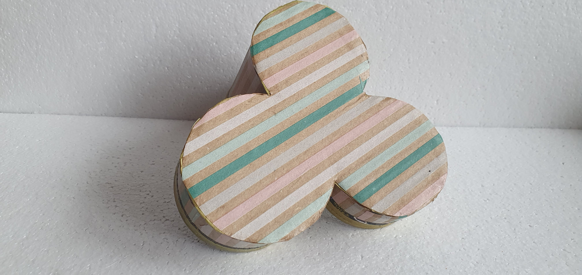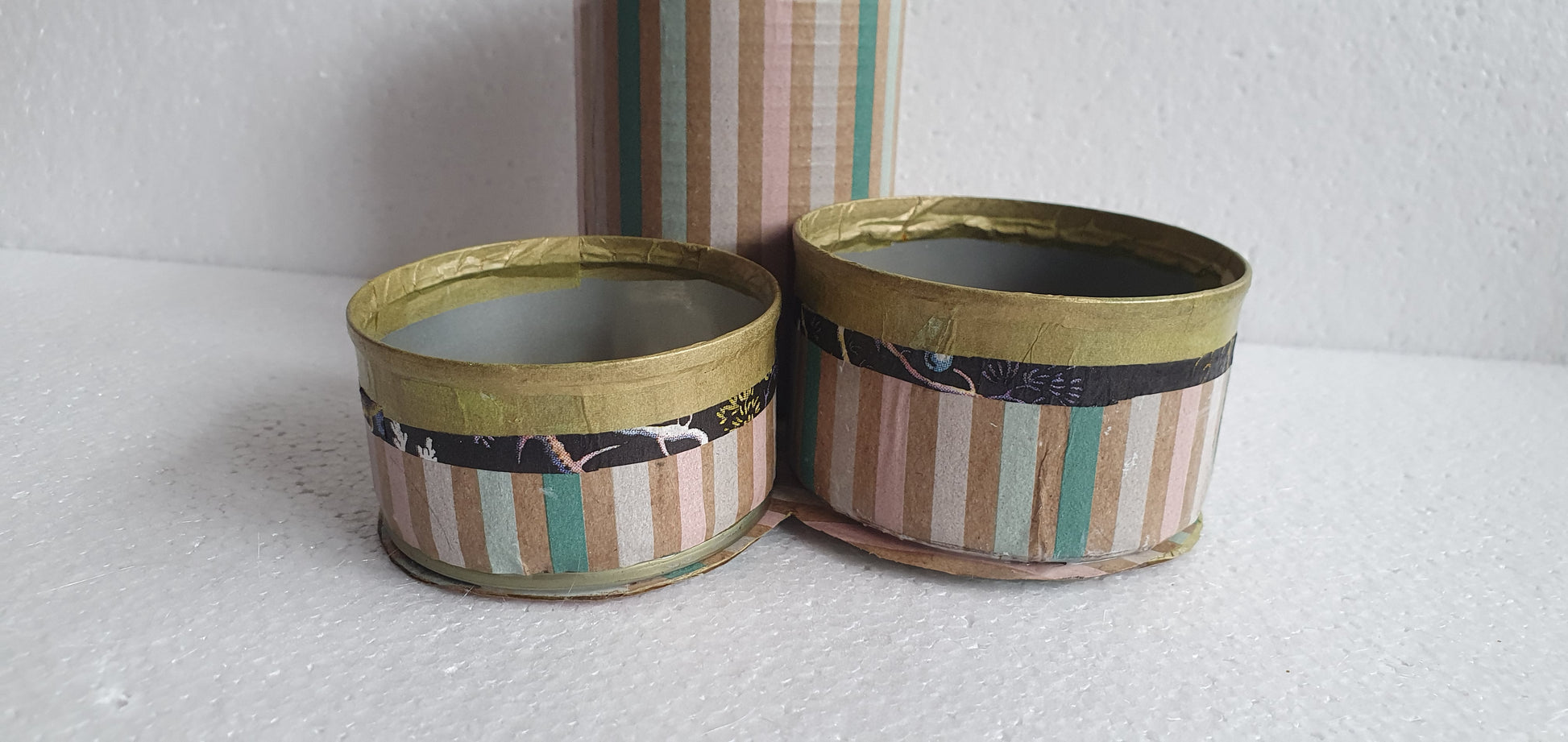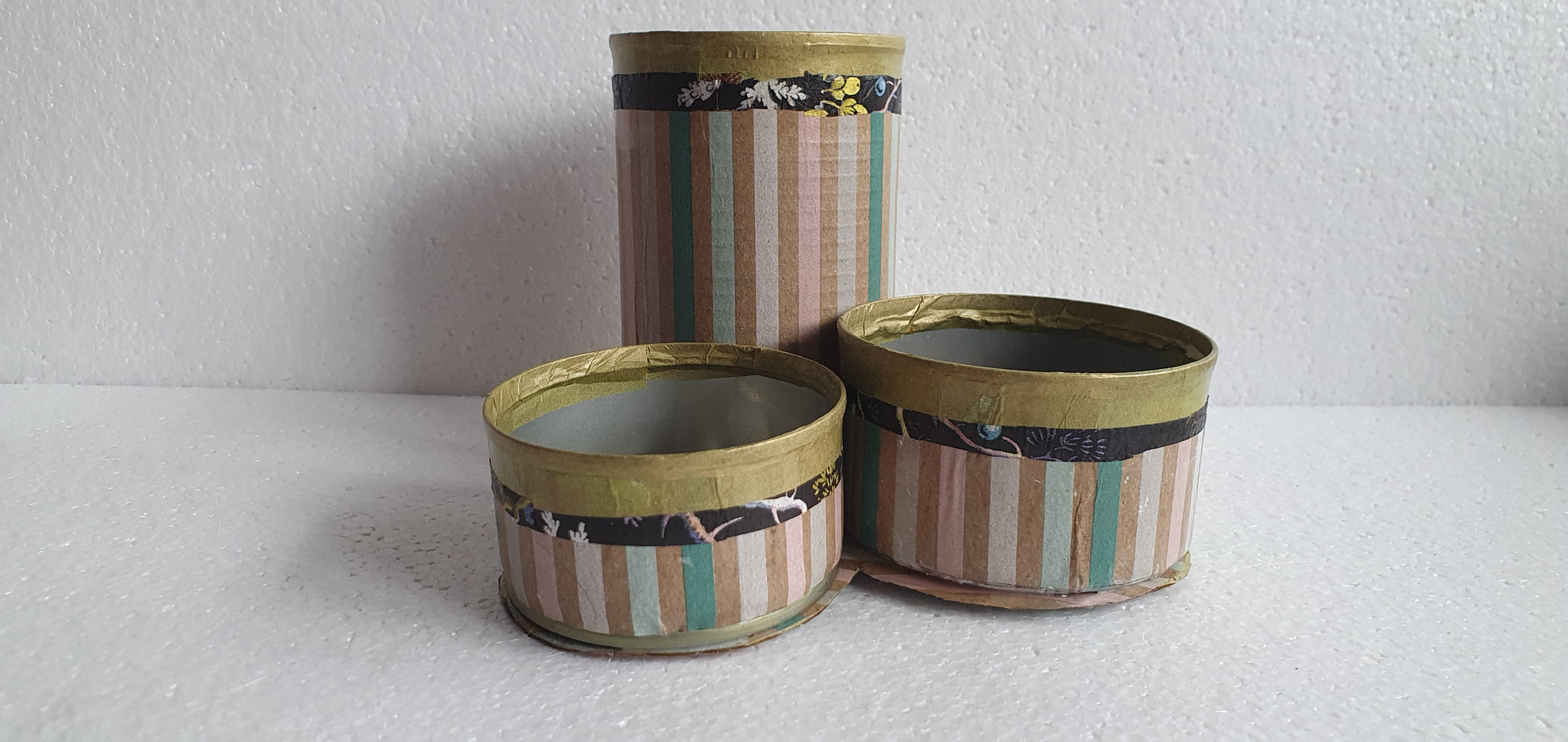 This tin can desk tidy set has been hand decorated by me in my studio using paper designs on reclaimed cans. It is a set of three fixed on a base.