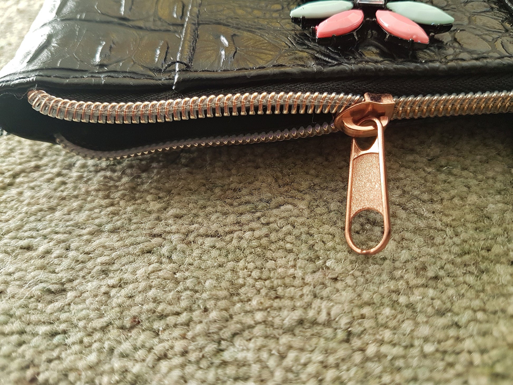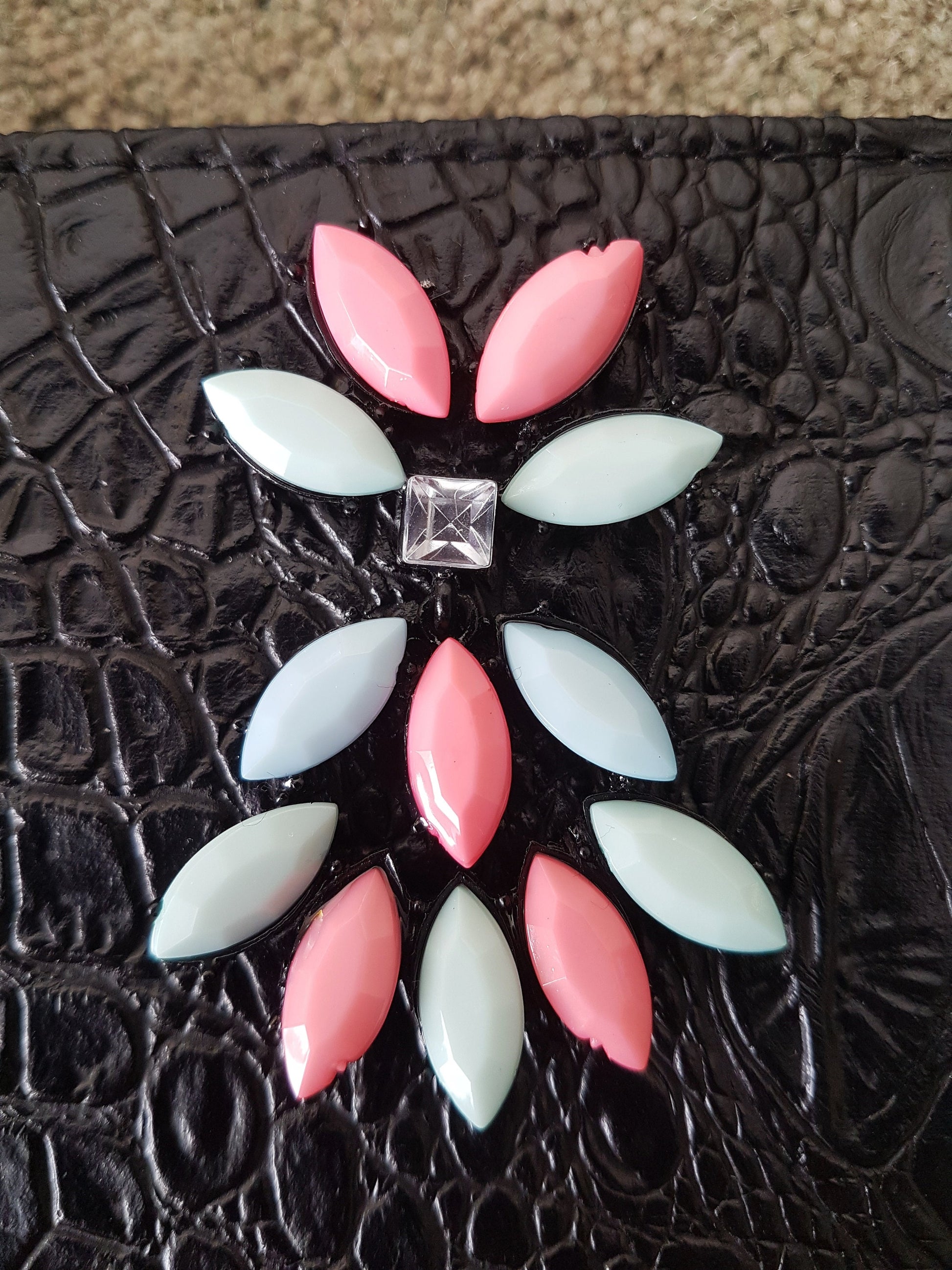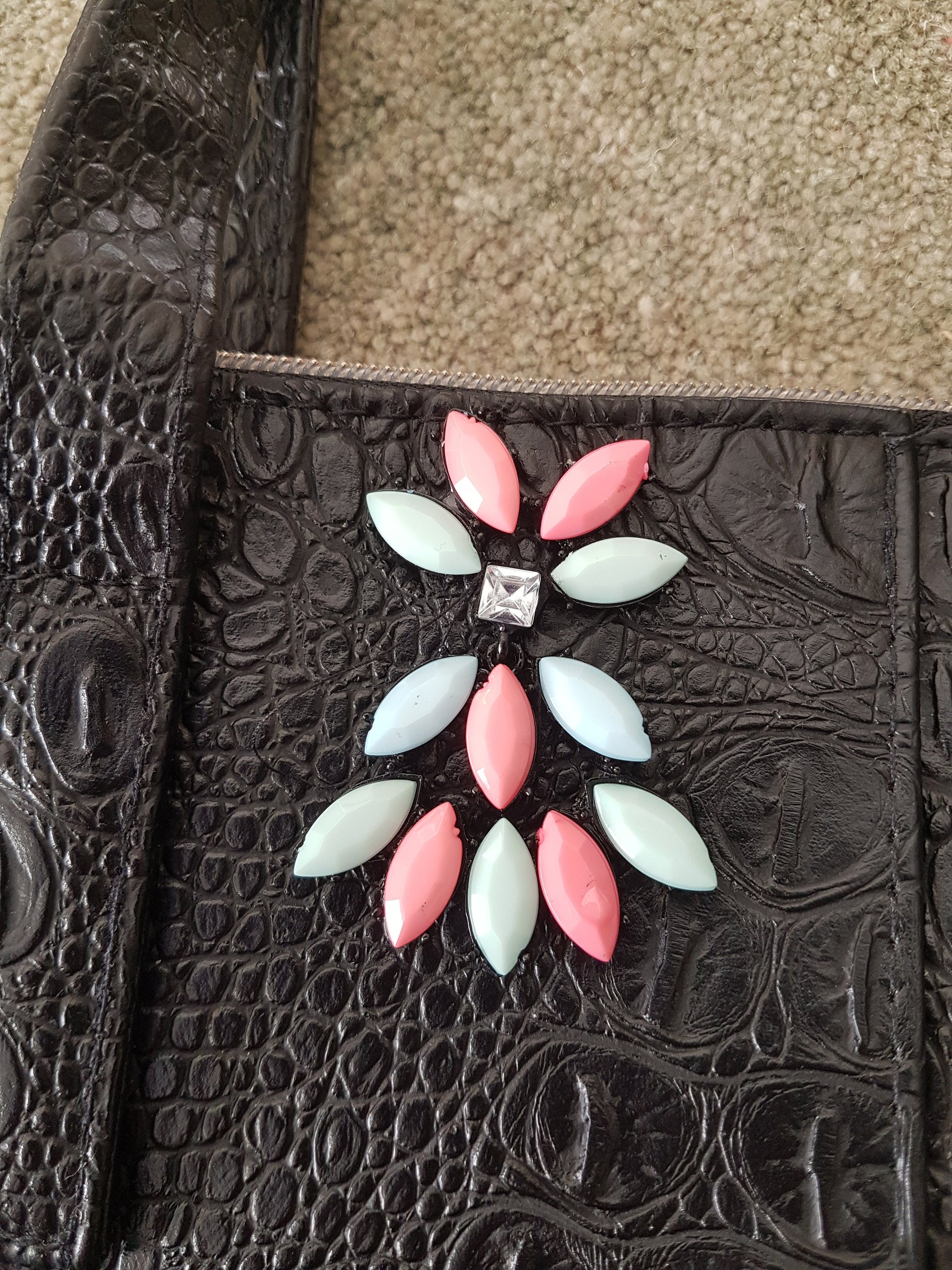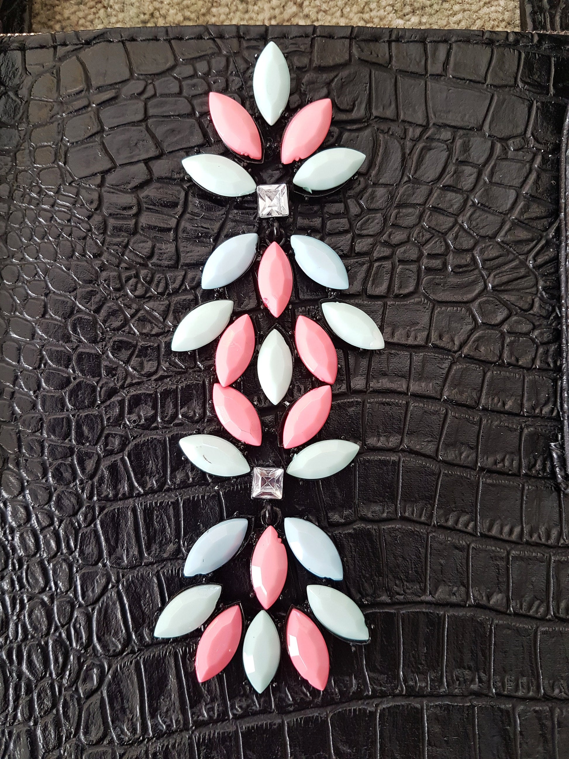 This is a gorgeous one of a kind shoulder bag. It is an existing brand new destined for landfill black patent faux leather/crocodile skin bag that has been upcycled with added embellishments from discarded and broken jewellery items in pink and green pastel shades and diamantés, to give it a unique look.