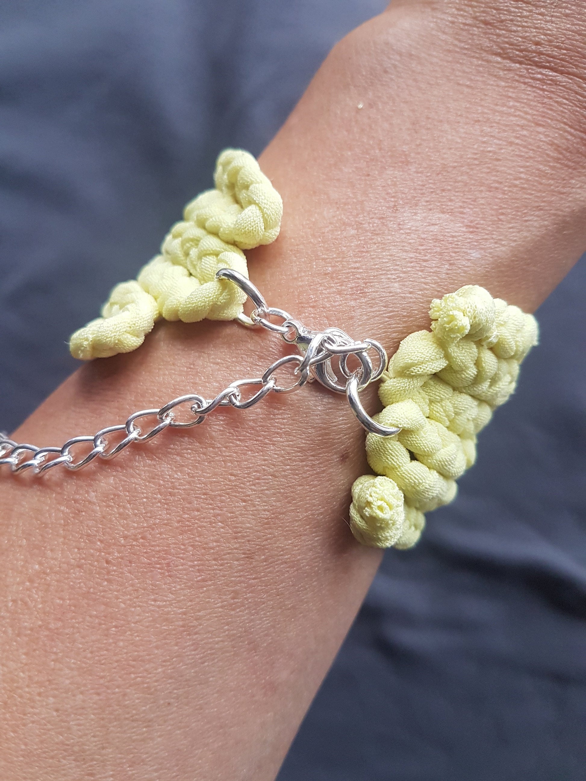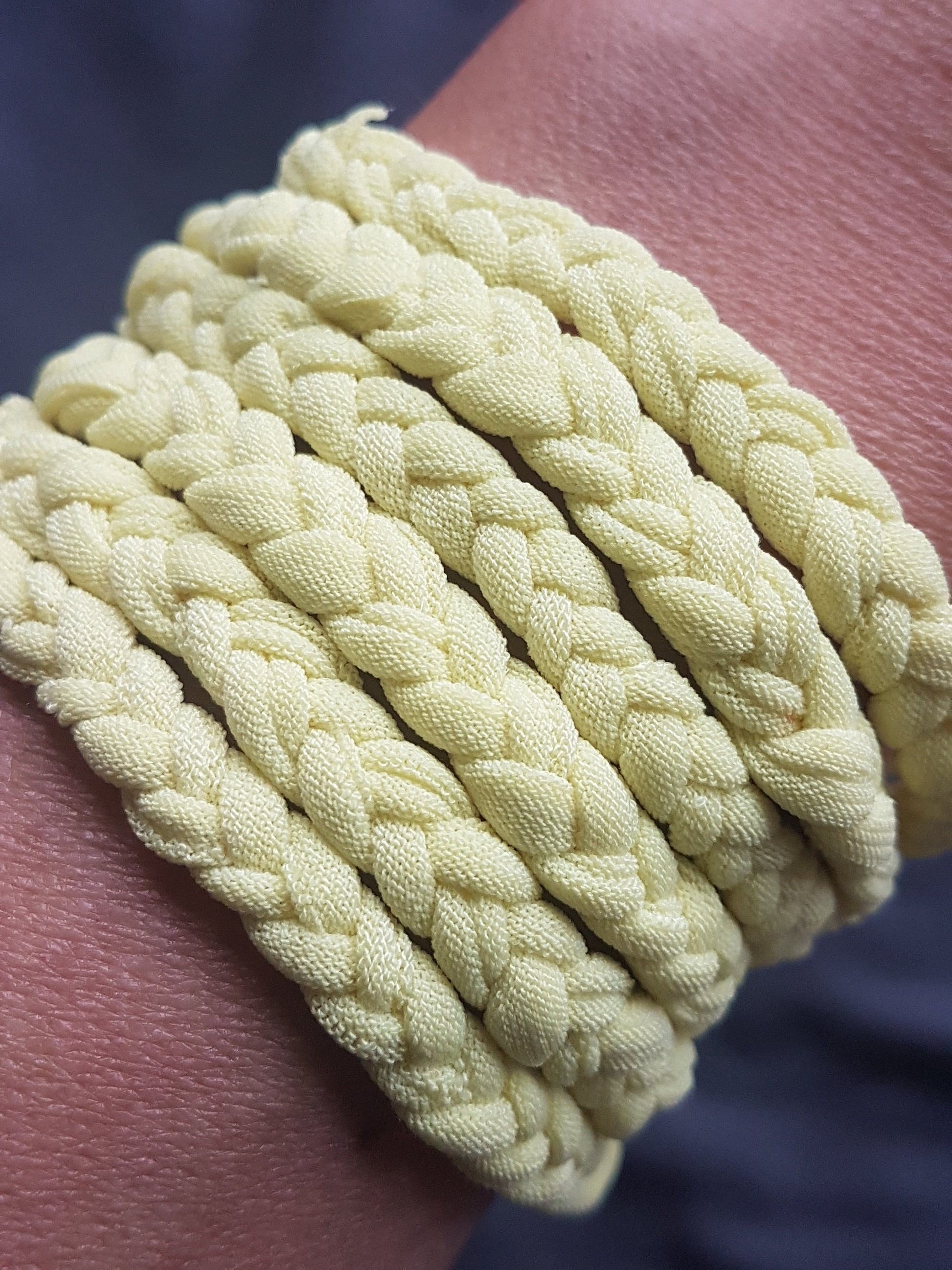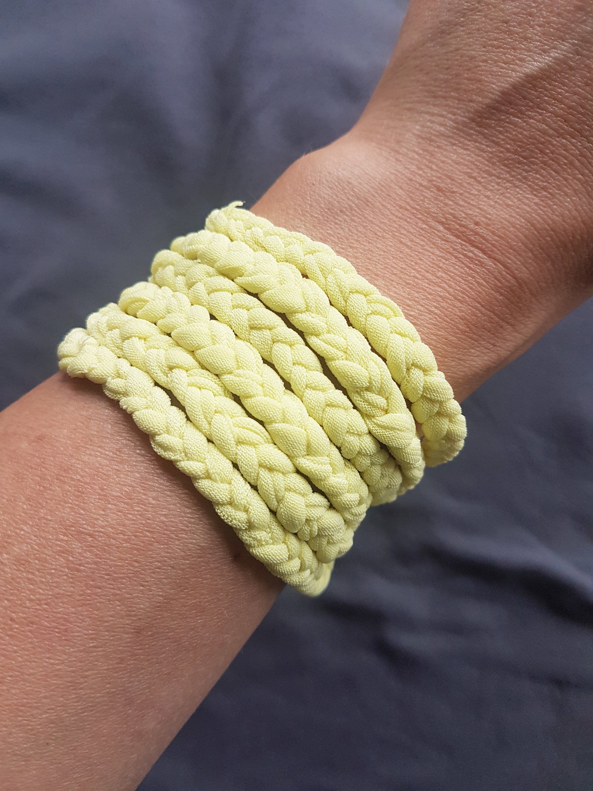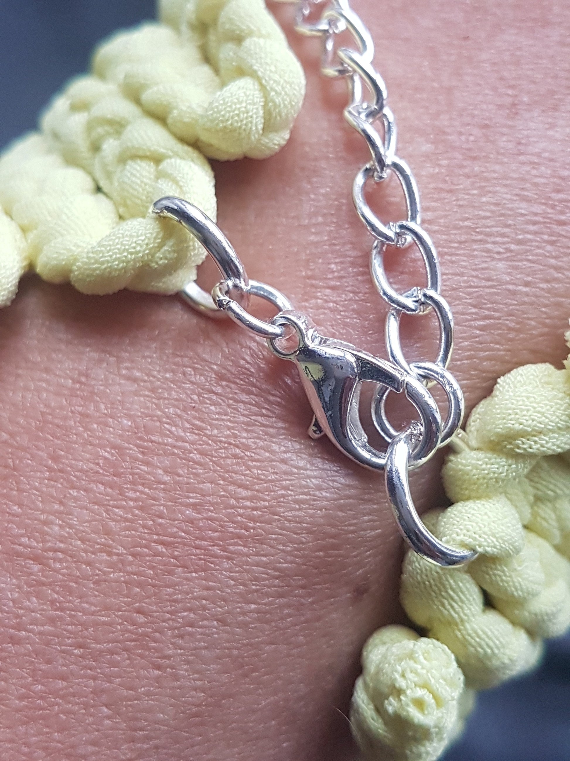 This one is 7.5 inches long including the hook and eye clasp but has an extender of 2.75 inches. It is made from 6 strands of hand braided fabric.