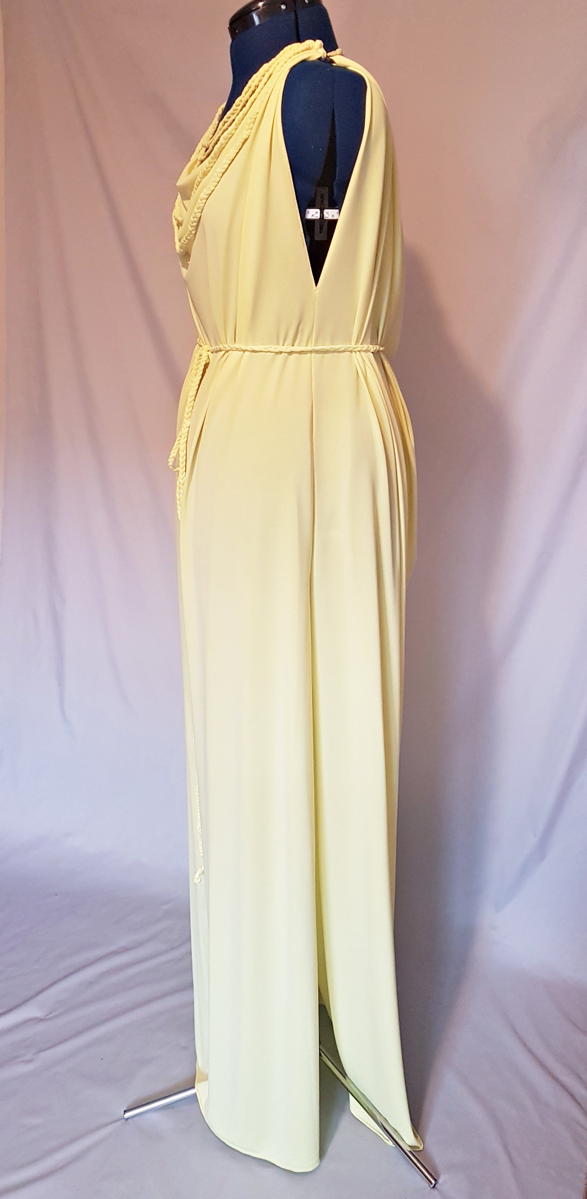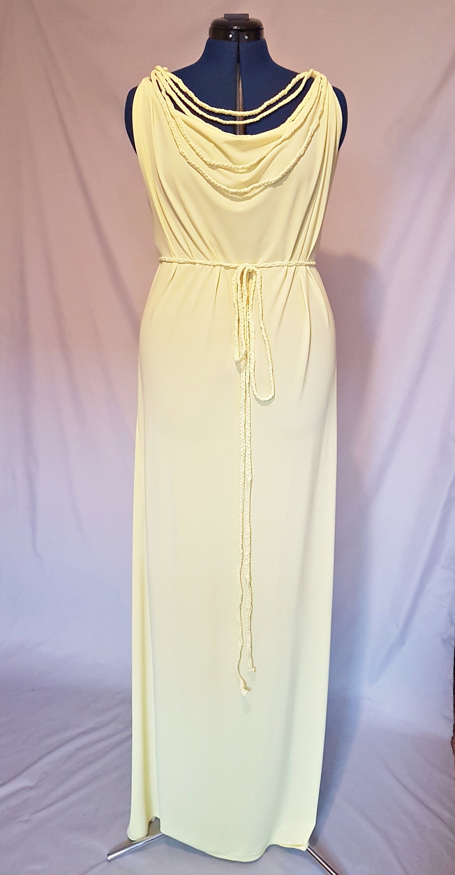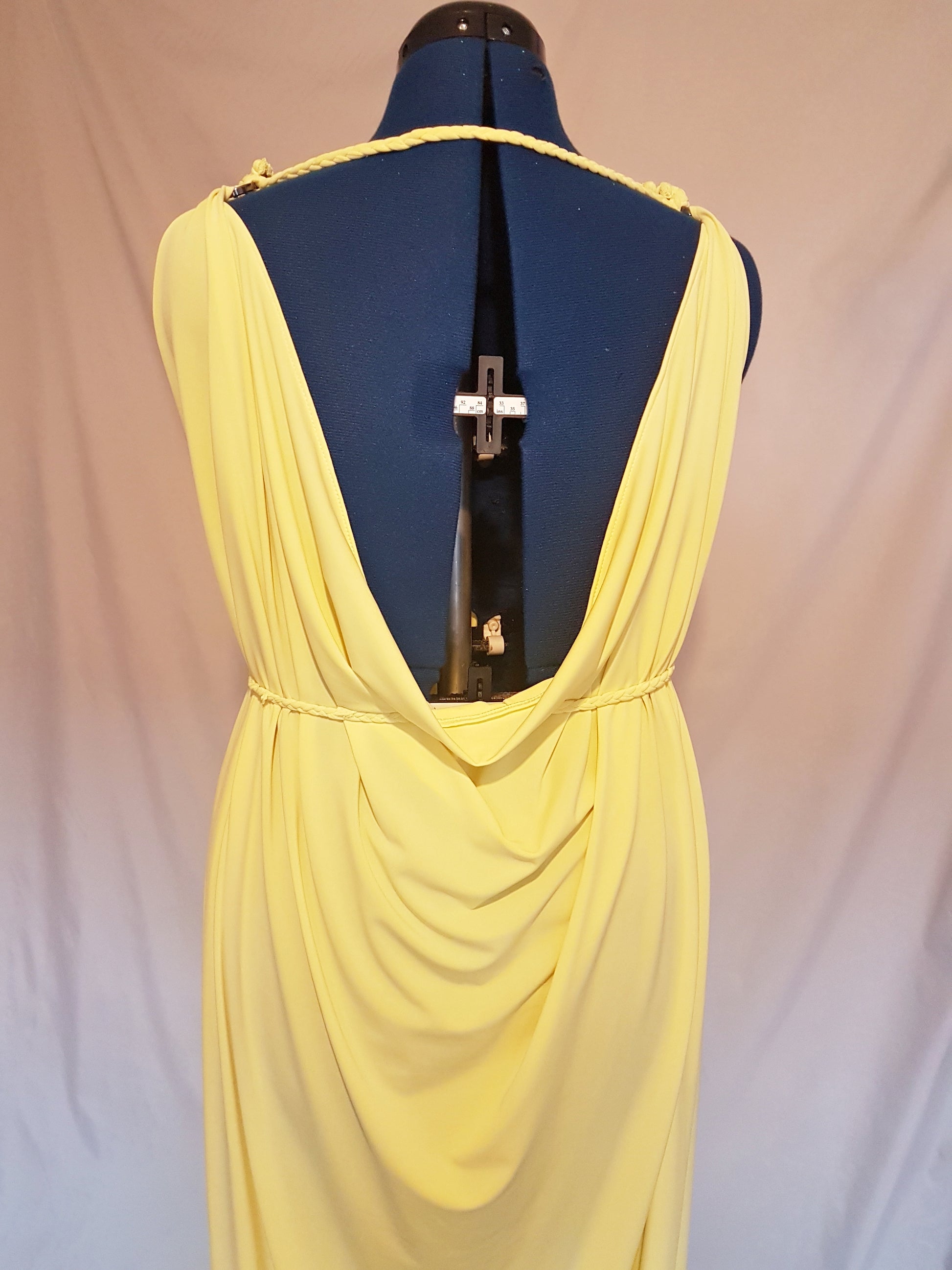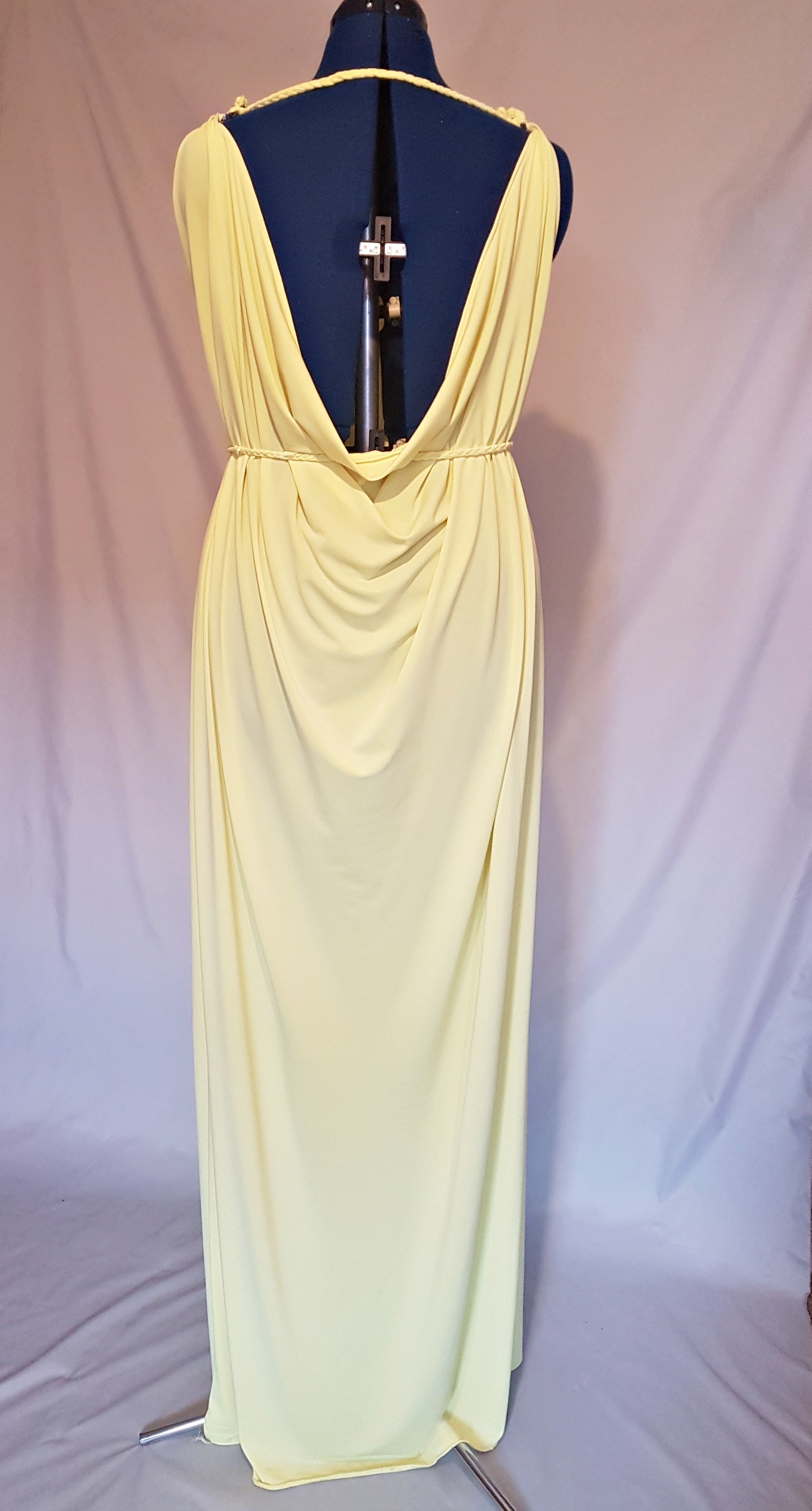 This gorgeous handmade Grecian drape dress is made from soft stretch jersey/lycra blend fabric in a pale yellow colour.