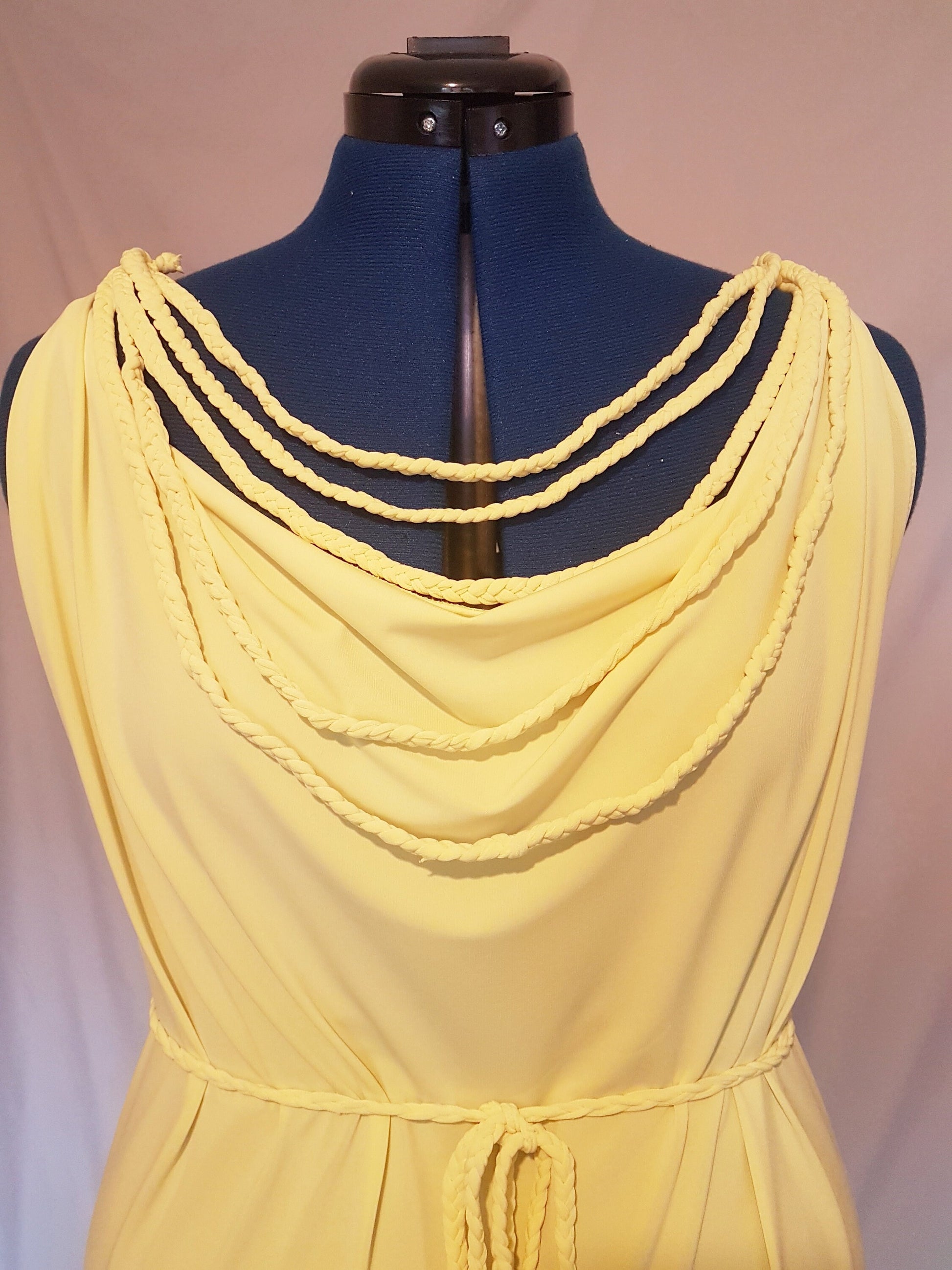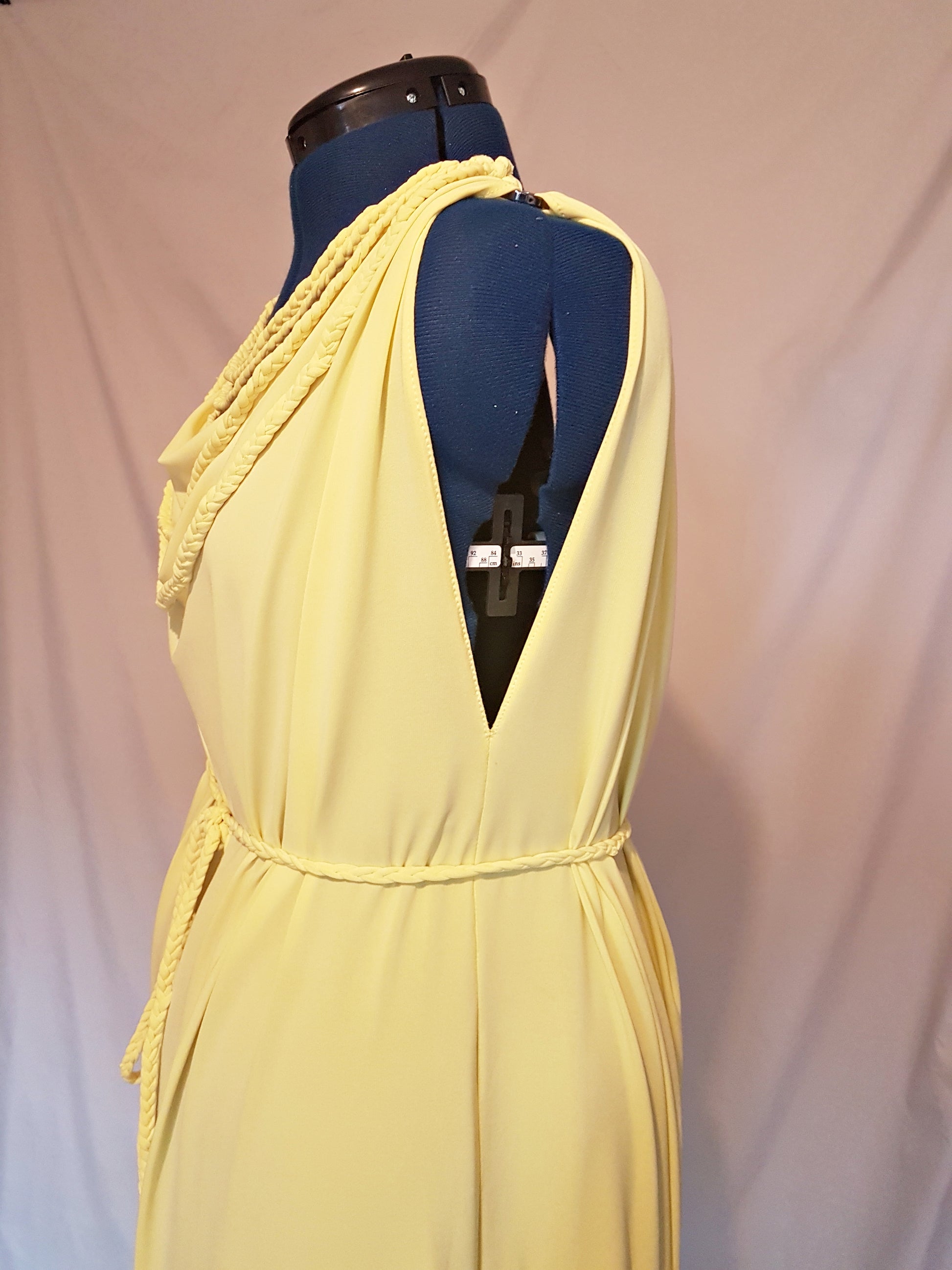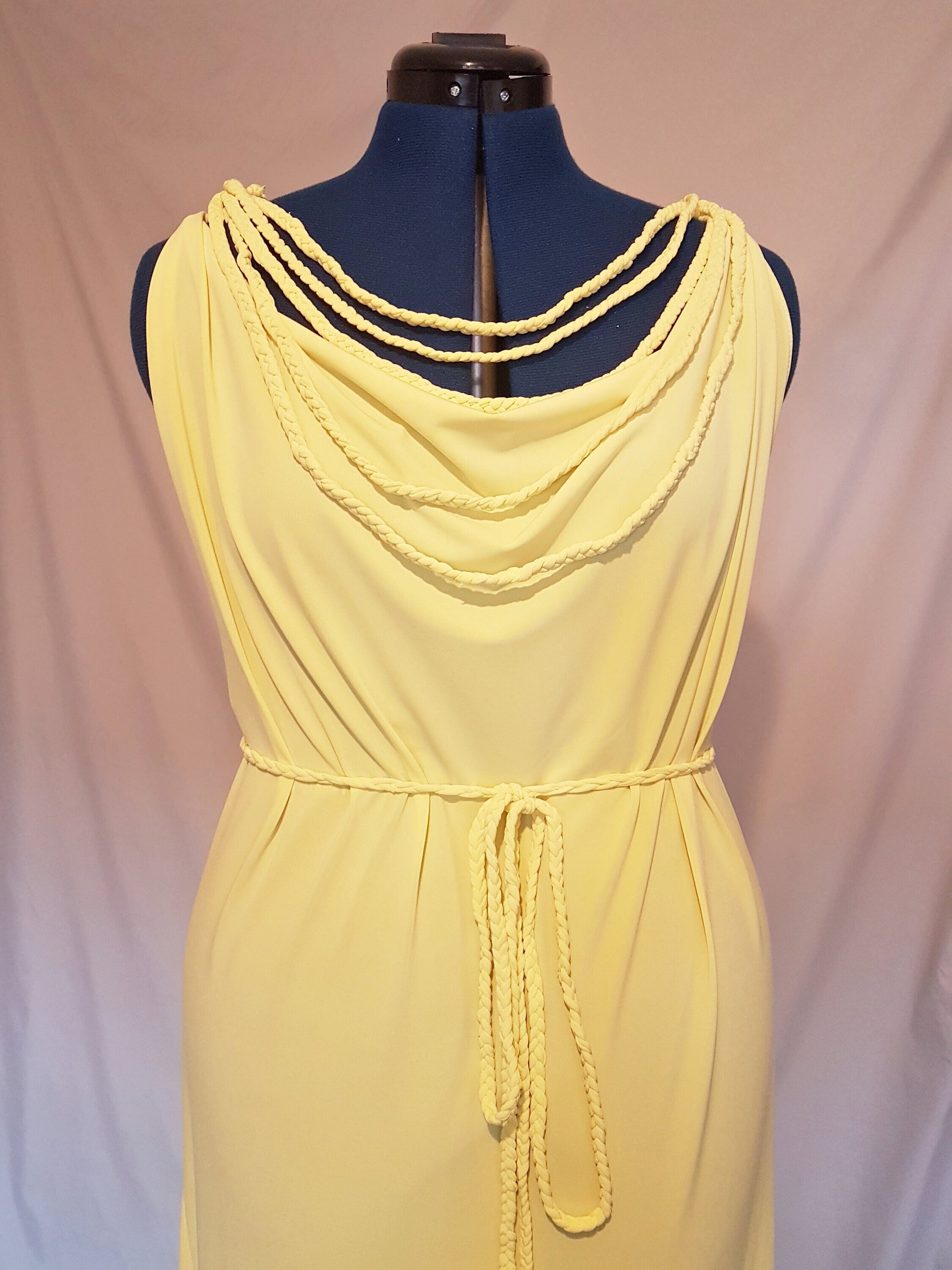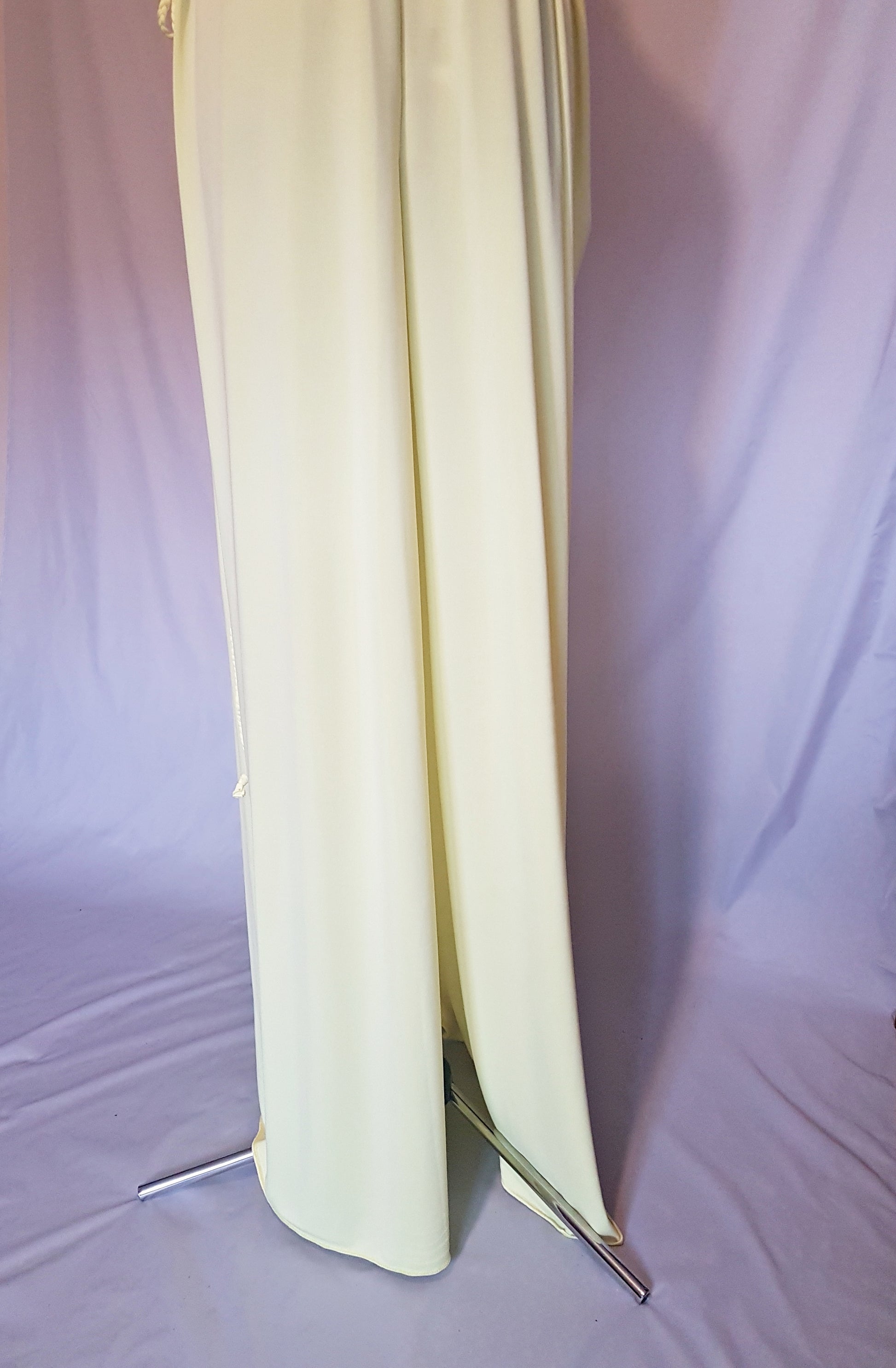 This gorgeous handmade Grecian drape dress is made from soft stretch jersey/lycra blend fabric in a pale yellow colour.