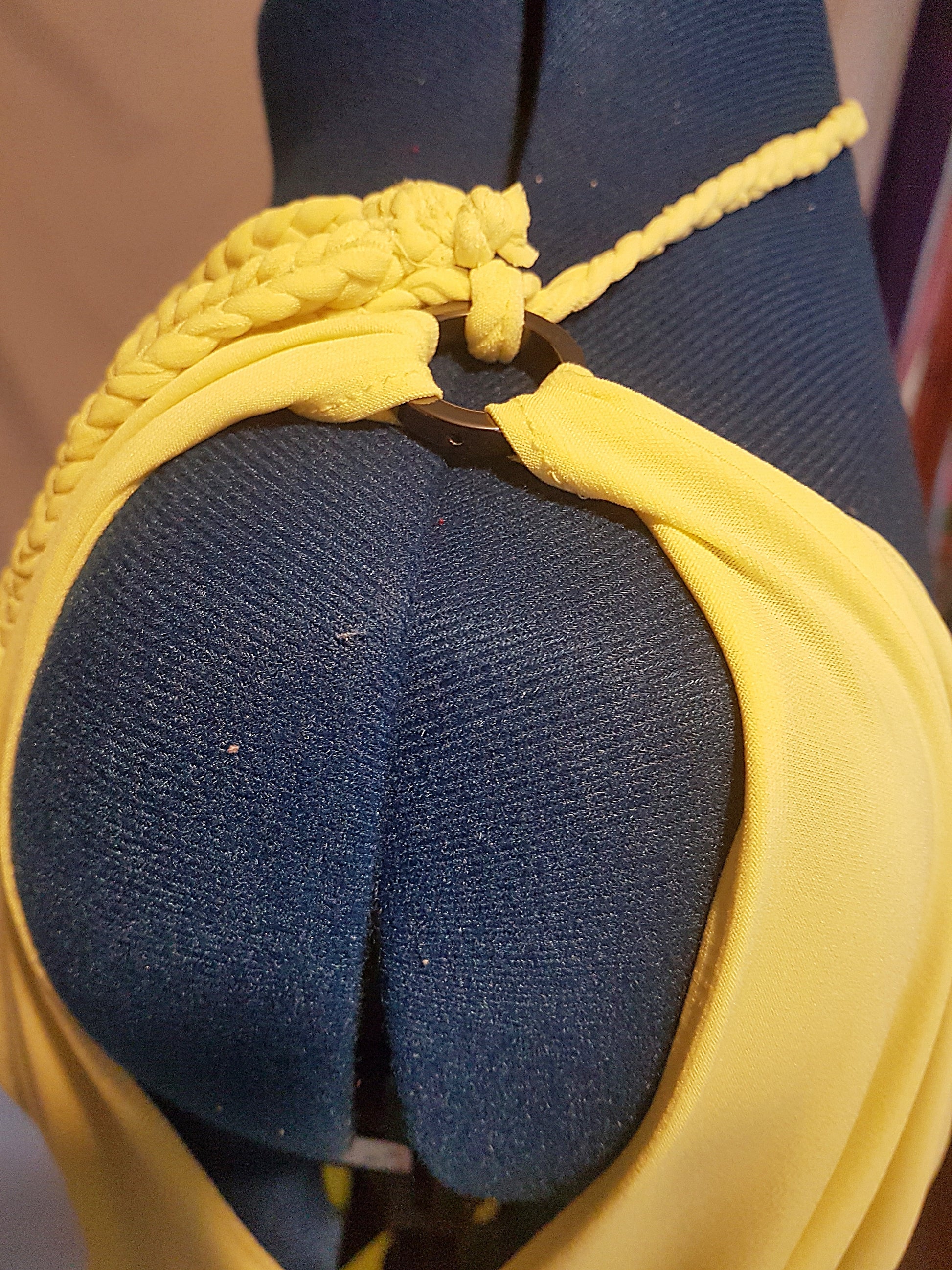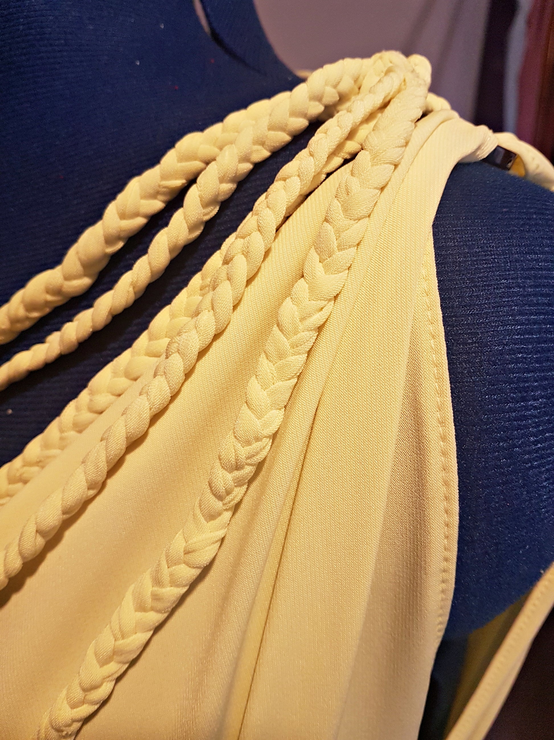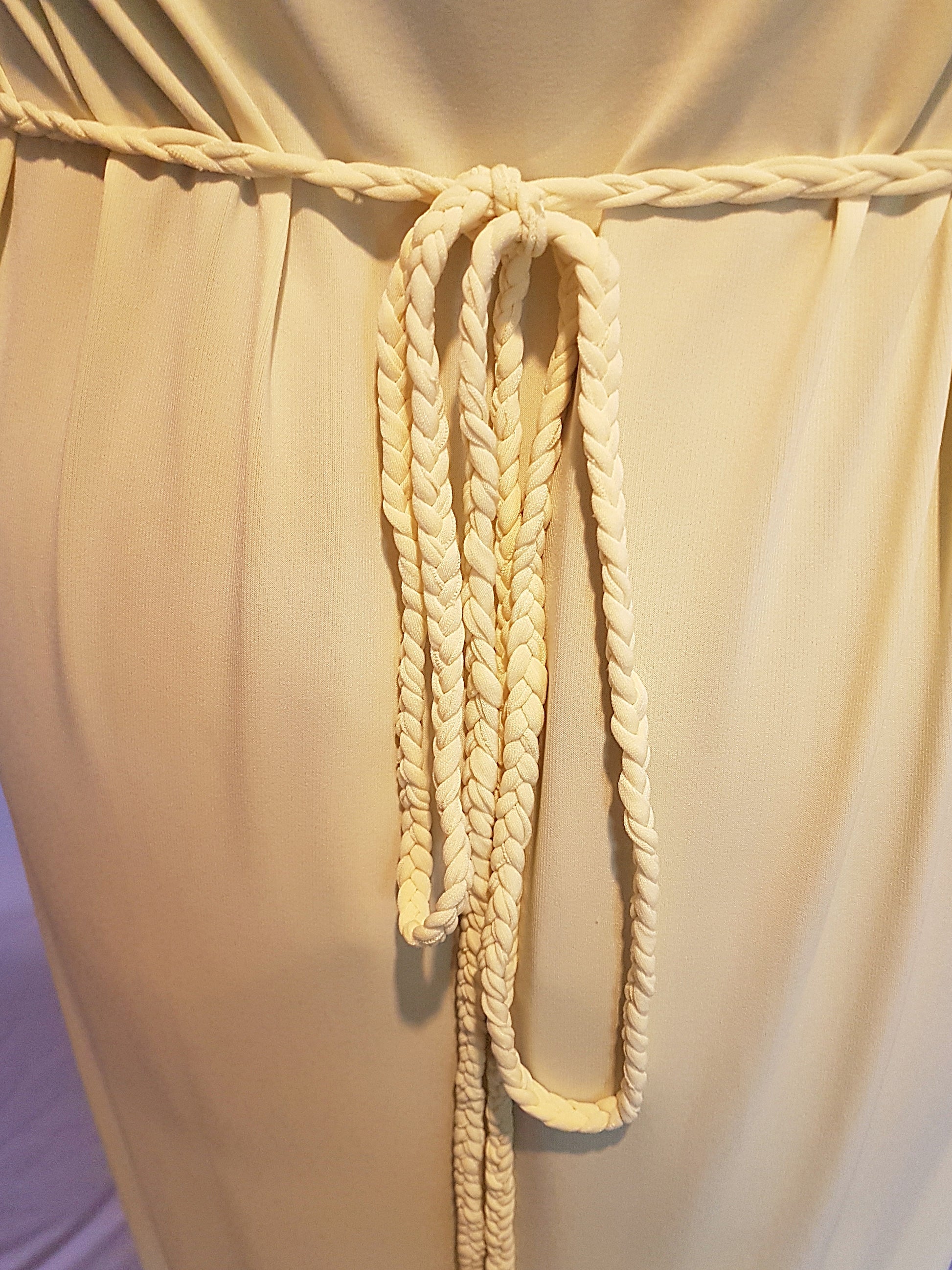 It has a scooped neckline at the front with braiding detail and a deep backless drape at the back. It ties with a matching braided belt that ties to your own natural waistline. It also has a side split on the left side. The shoulders and the braided detailing are fixed with grey hematite beads