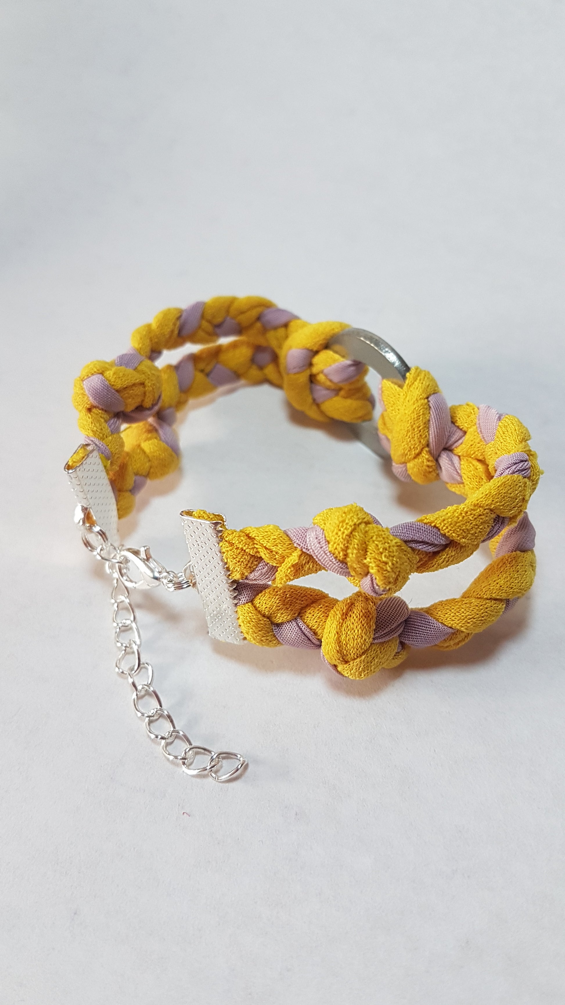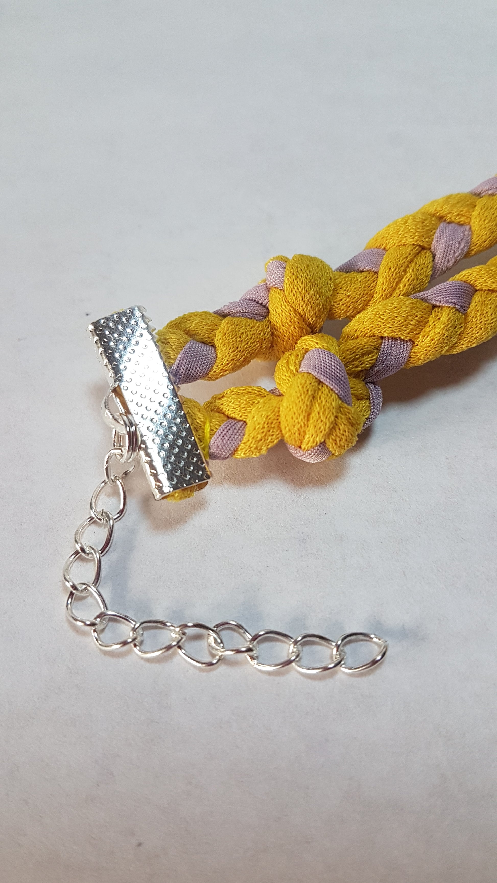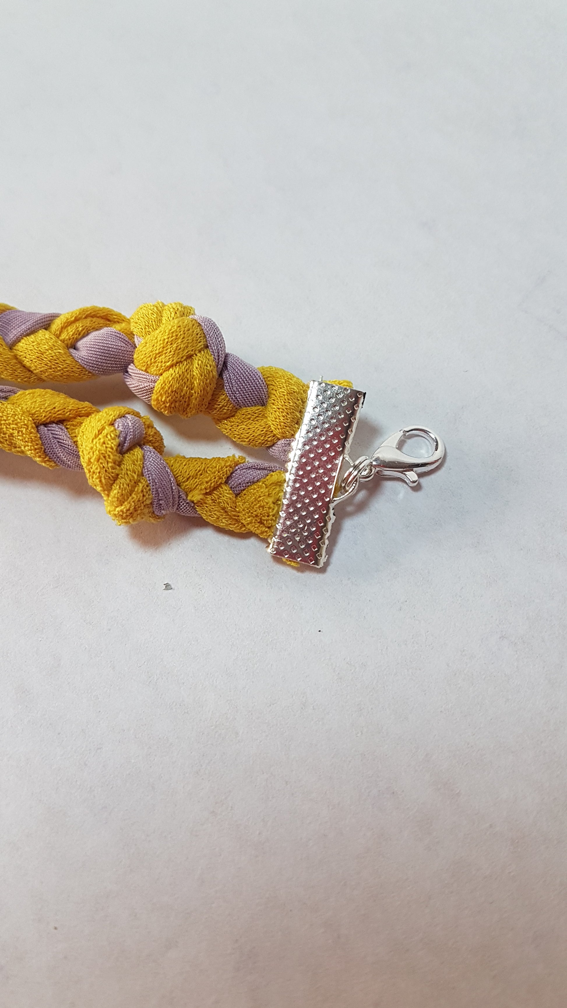 Each design has been made from fabrics left from my dress projects and braided into lengths that are fixed with silver clasps, to create a unique, attractive accessory. Each one is a unique one off and cannot be repeated.
