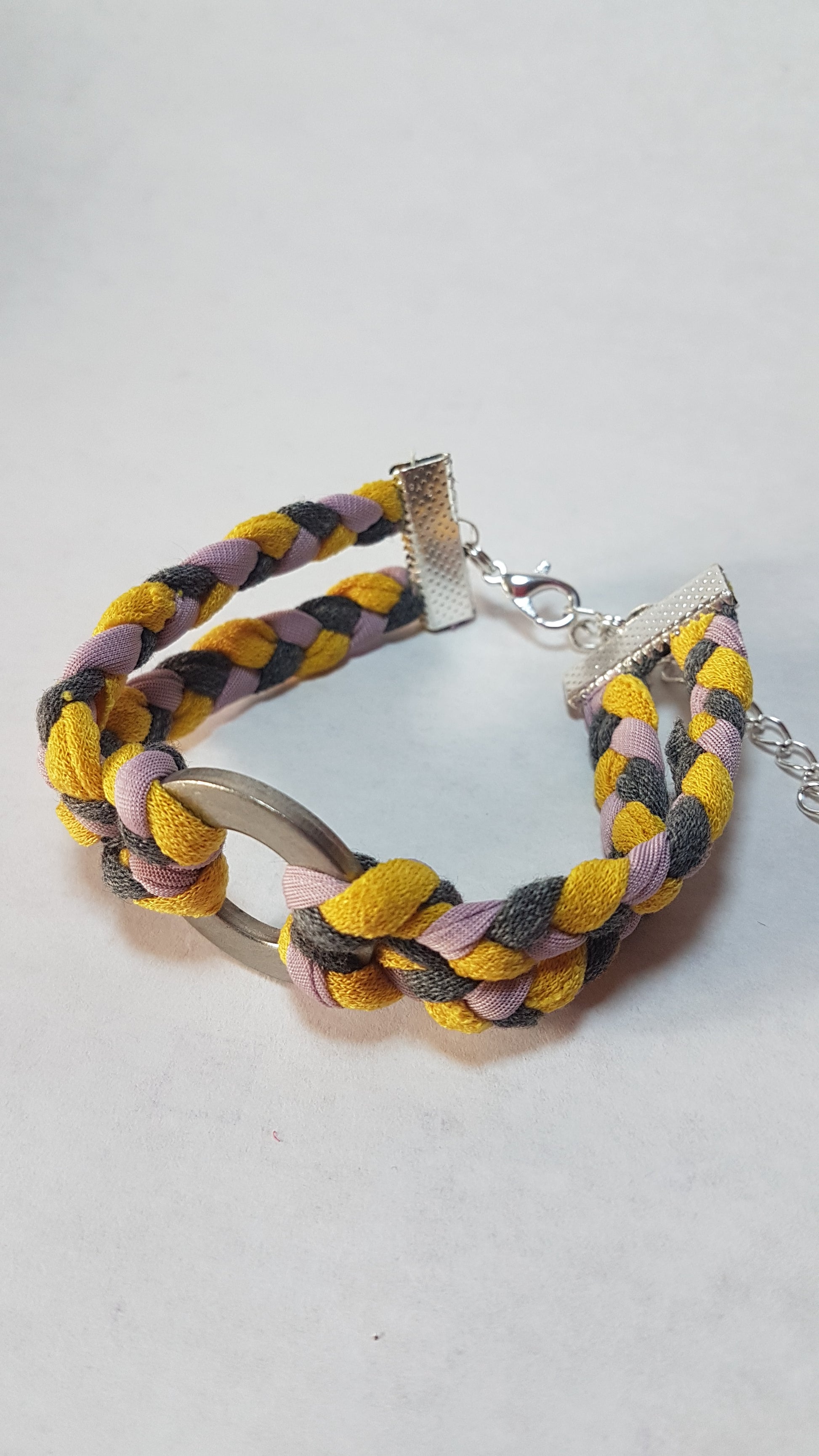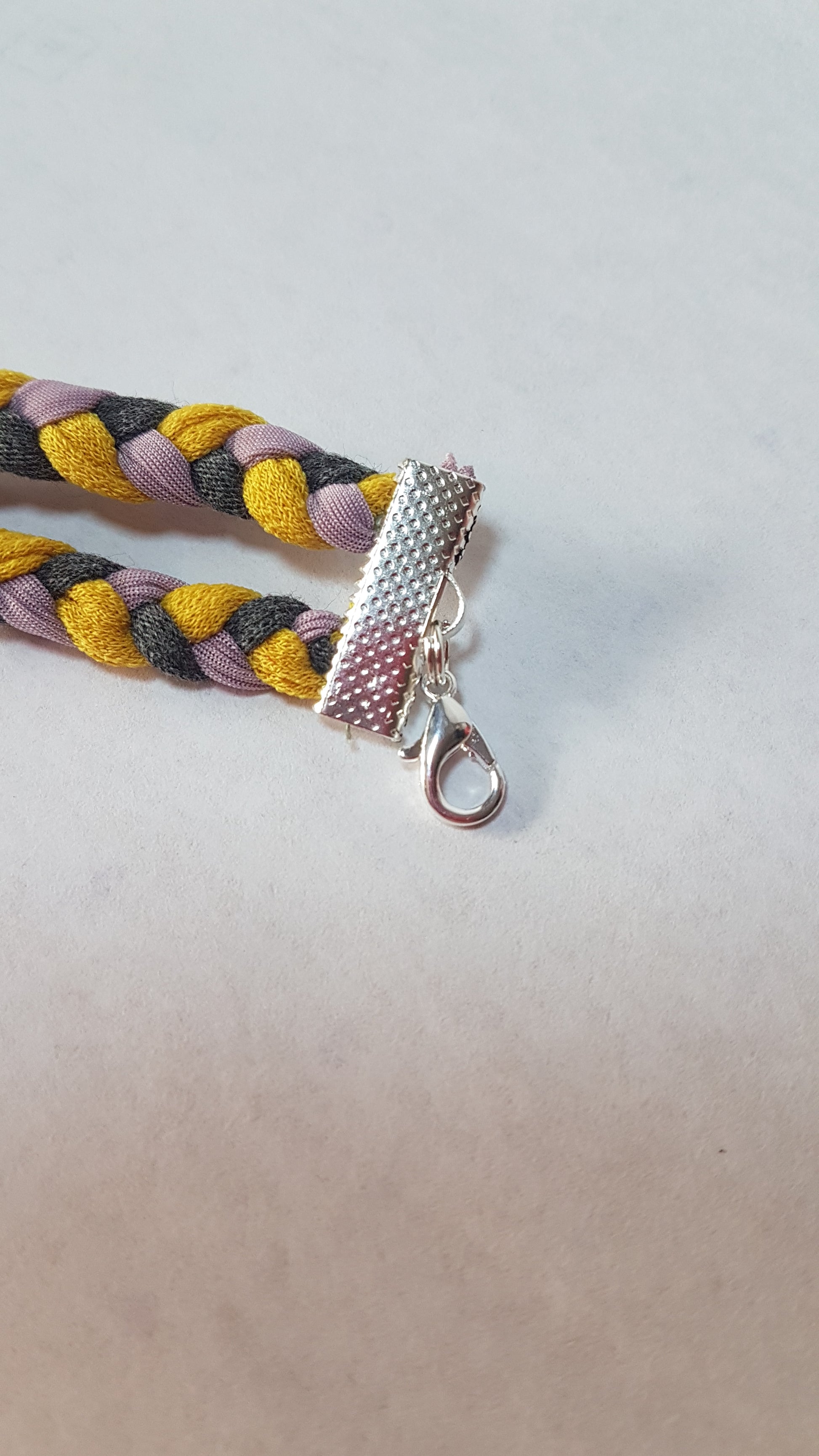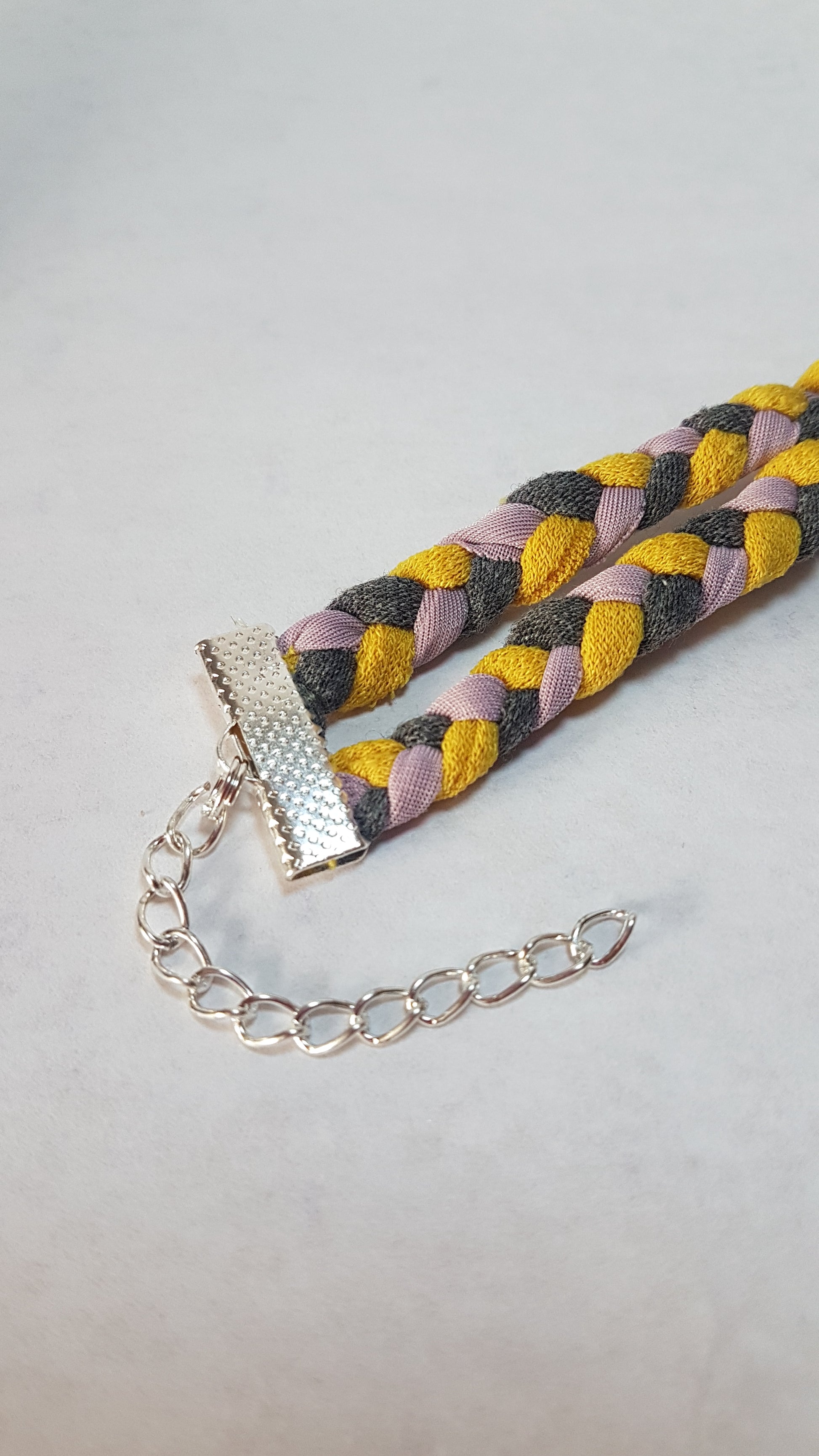 Each design has been made from fabrics left from my dress projects and braided into lengths that are fixed with silver clasps, to create a unique, attractive accessory. Each one is a unique one off and cannot be repeated.