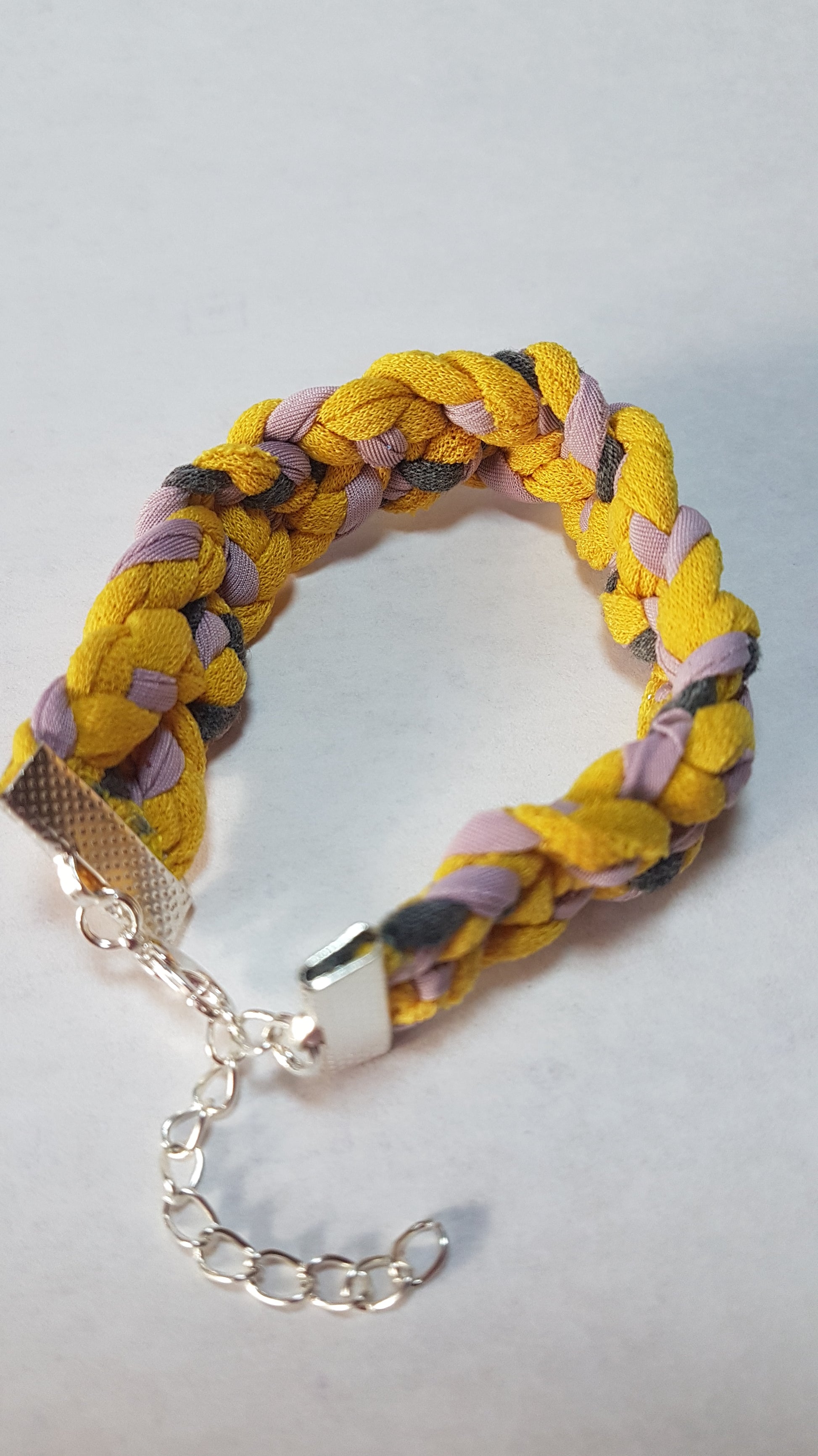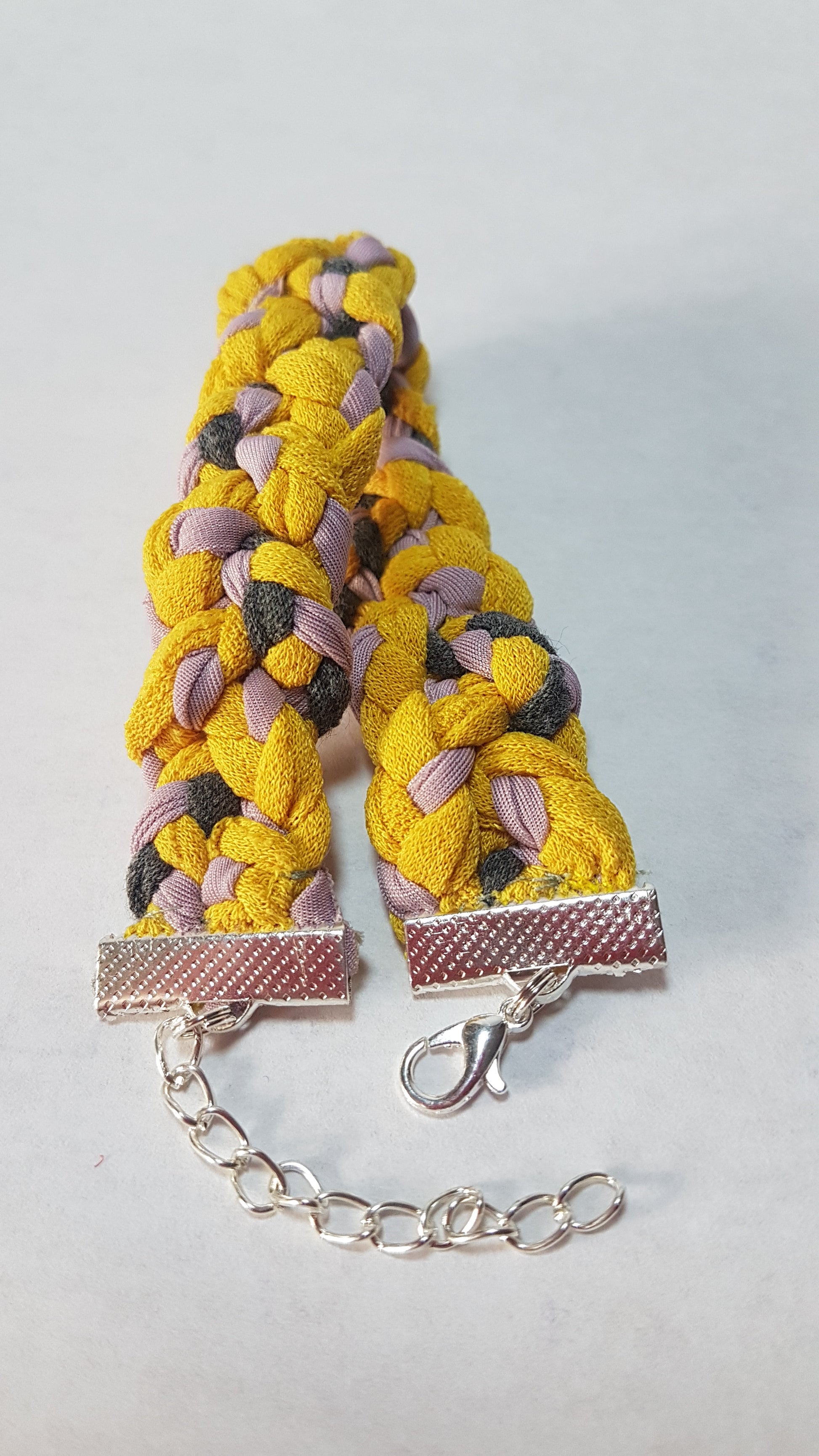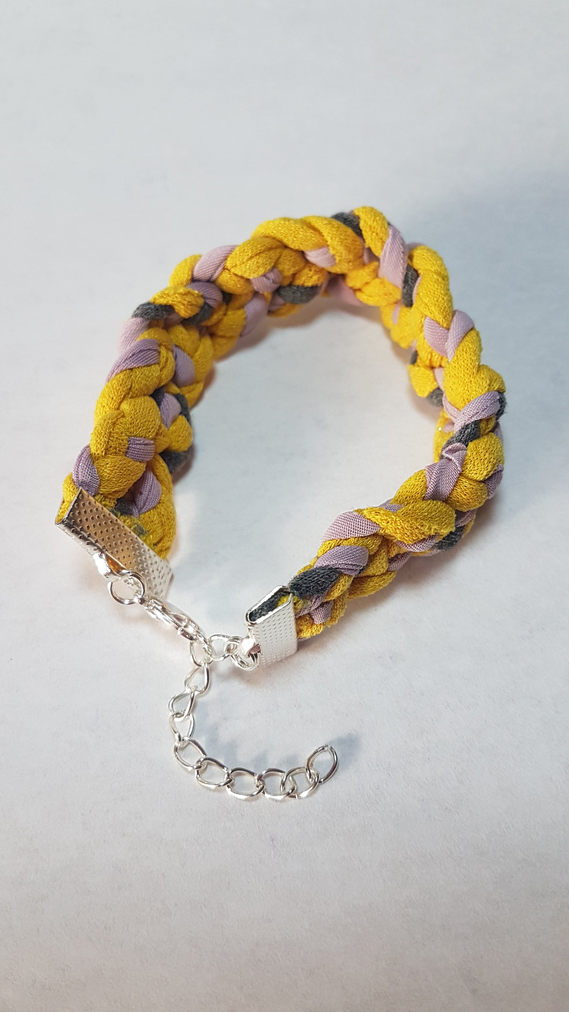 Each design has been made from fabrics left from my dress projects and braided into lengths that are fixed with silver clasps, to create a unique, attractive accessory. Each one is a unique one off and cannot be repeated.